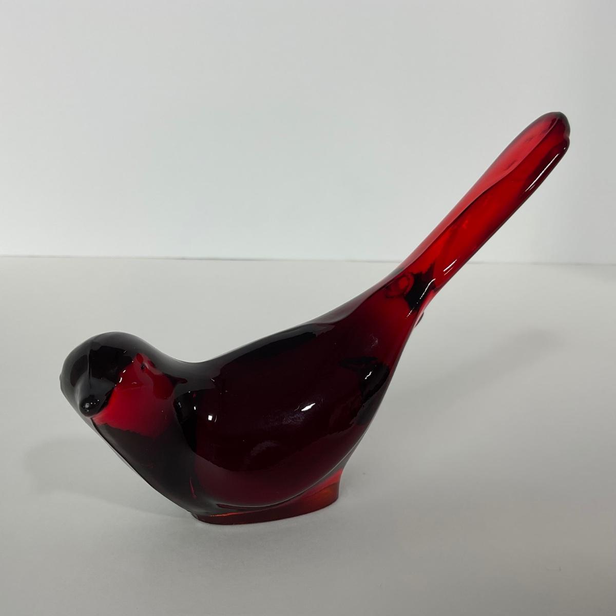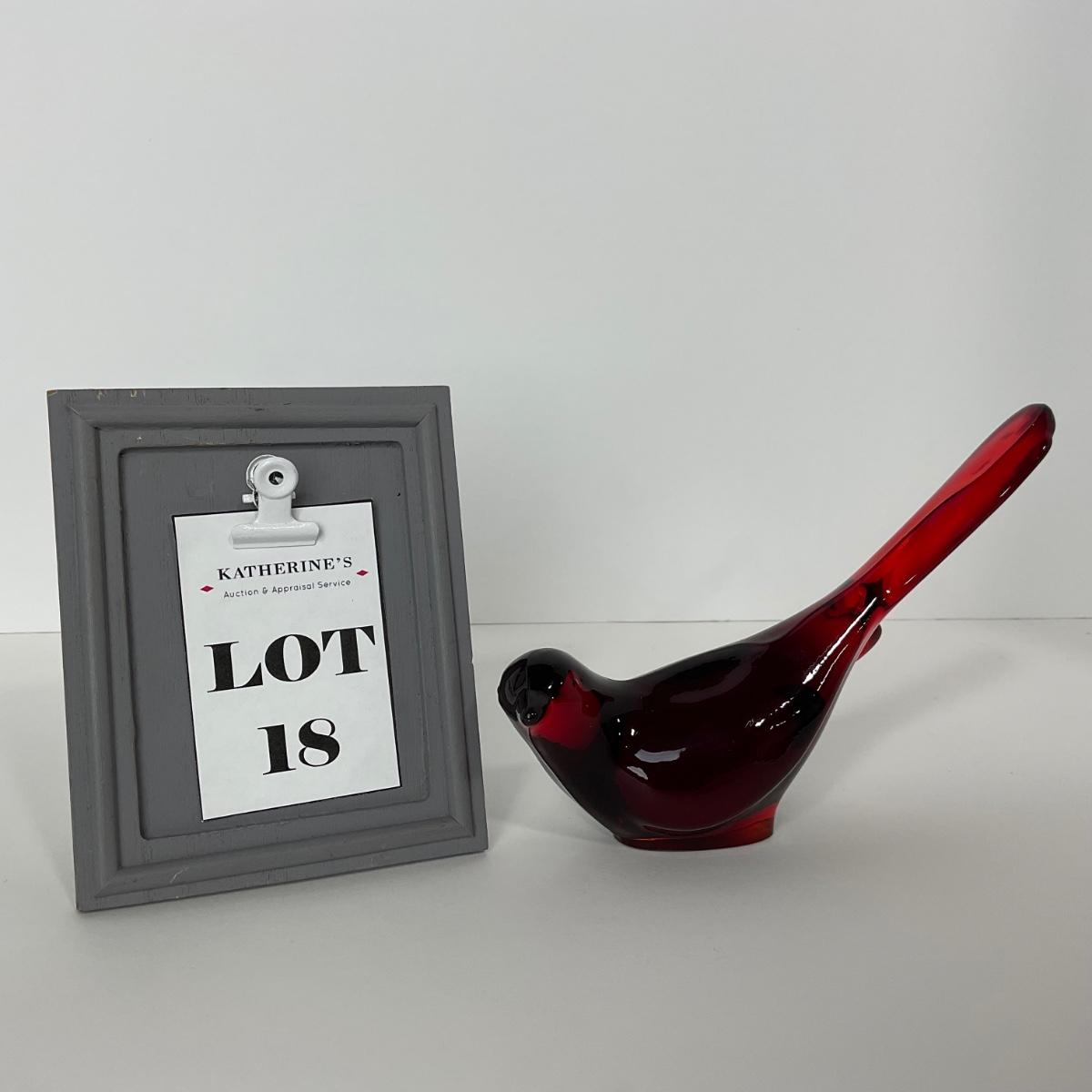 One Fenton marked ruby red Happiness bird with long tail. 4 1/2 inches by 7 inches long. This piece has no damage, and appears to be in great shape with no visable chips, cracks, or broken pieces. Please see photos for details and condition. Any condition statement is given as a courtesy to a client, is an opinion, and should not be treated as a statement of fact. Reference to condition written, oral or within a condition report shall not be regarded as a full account of condition and may not include all defects, alterations, or restorations. Absence of a condition report does not imply a lot is flawless or lacking imperfections or damage. Katherine’s Auction & Appraisal Service shall have no responsibility for any error or omission. Returns shall not be accepted on the basis of condition. ::: Shipping is available on this lot. If you require shipping you must let us know at the close of the auction. We will coordinate with you after the item has been won. Shipping fees will include insurance up to or exceeding the value of all items being mailed. If you have any questions regarding this lot please contact the auctioneer either via this website, by direct email or by phone. PICK UP TIMES and other important information can be found in the TERMS and DESCRIPTION of the auction. Please take a look for pertinent information. Thanks!
