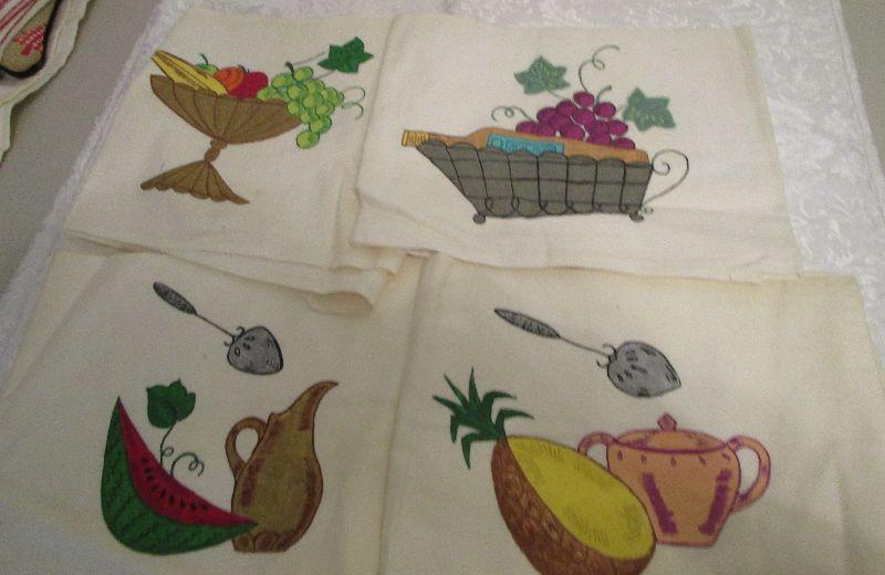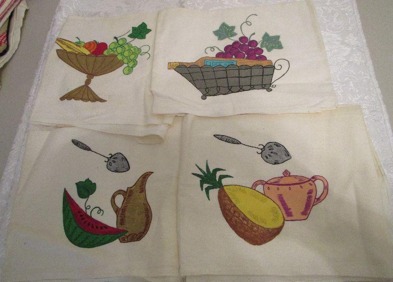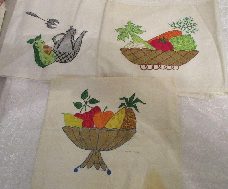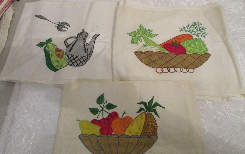 Seven Vintage New Flour Sack Kitchen Towels, with liquid embroidery decor. Have some marks, not sure it it is stains or if it will come out.