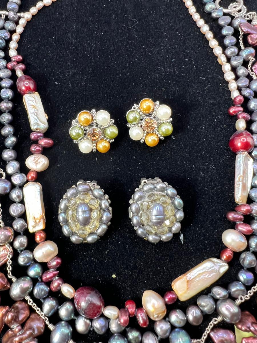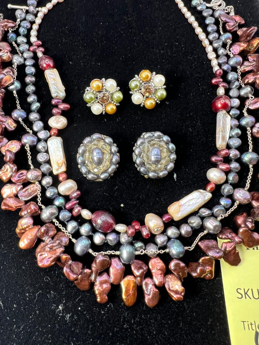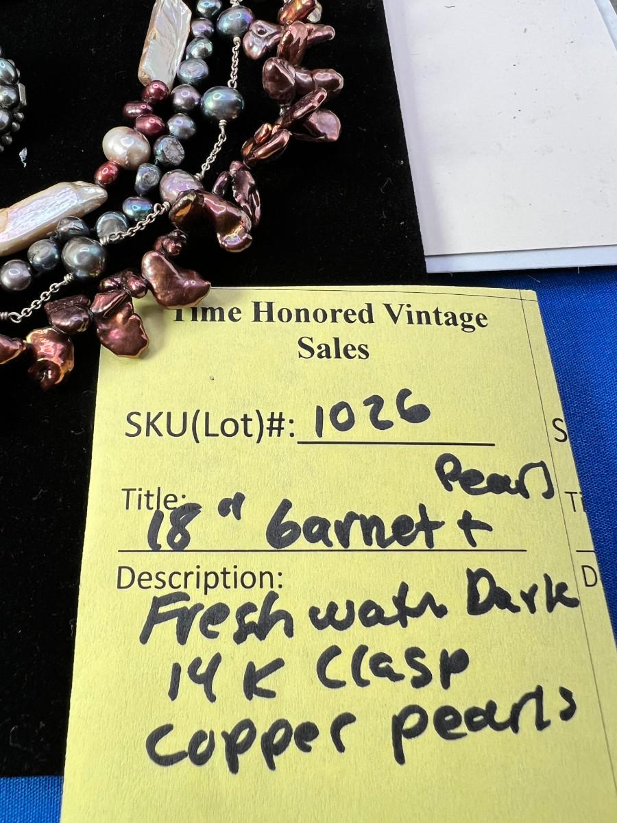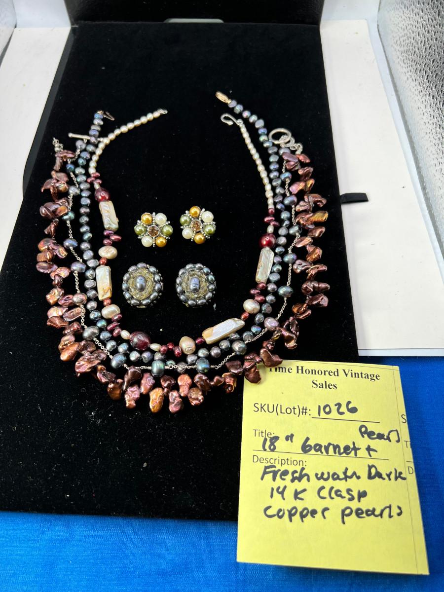 18" garnet necklace, Freshwater pearls, 14K clasp 2 pearl clip on earrings