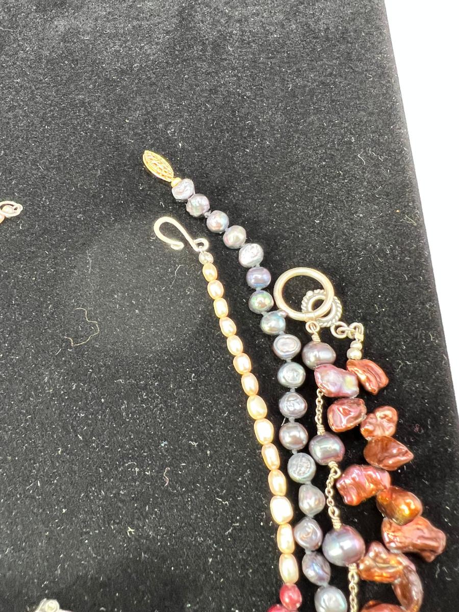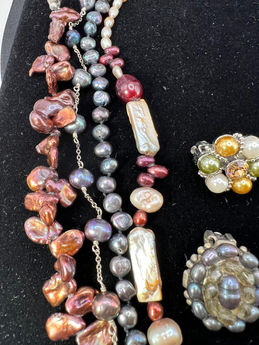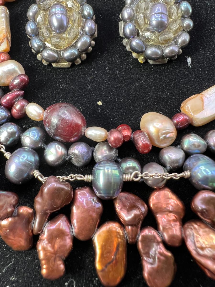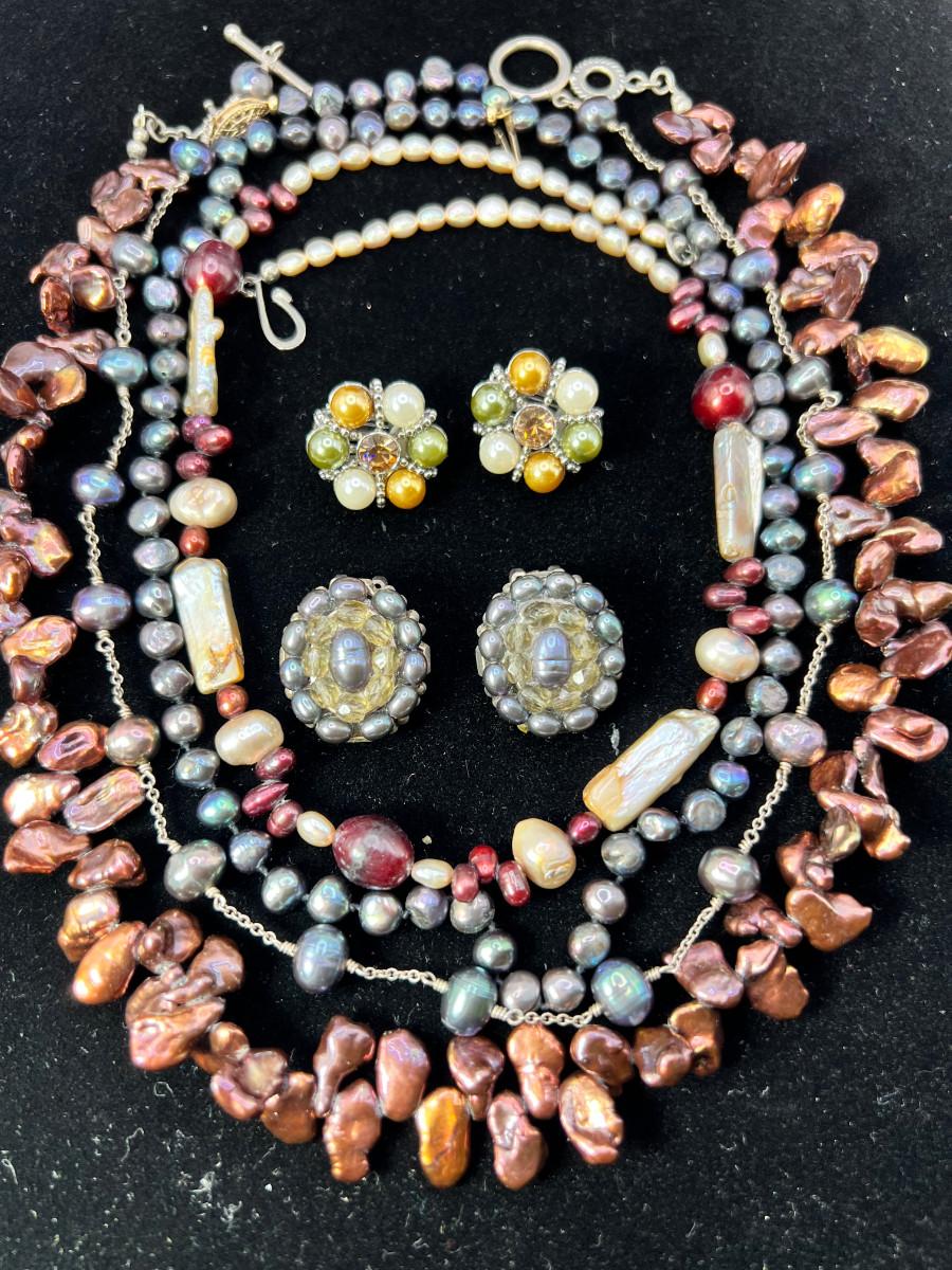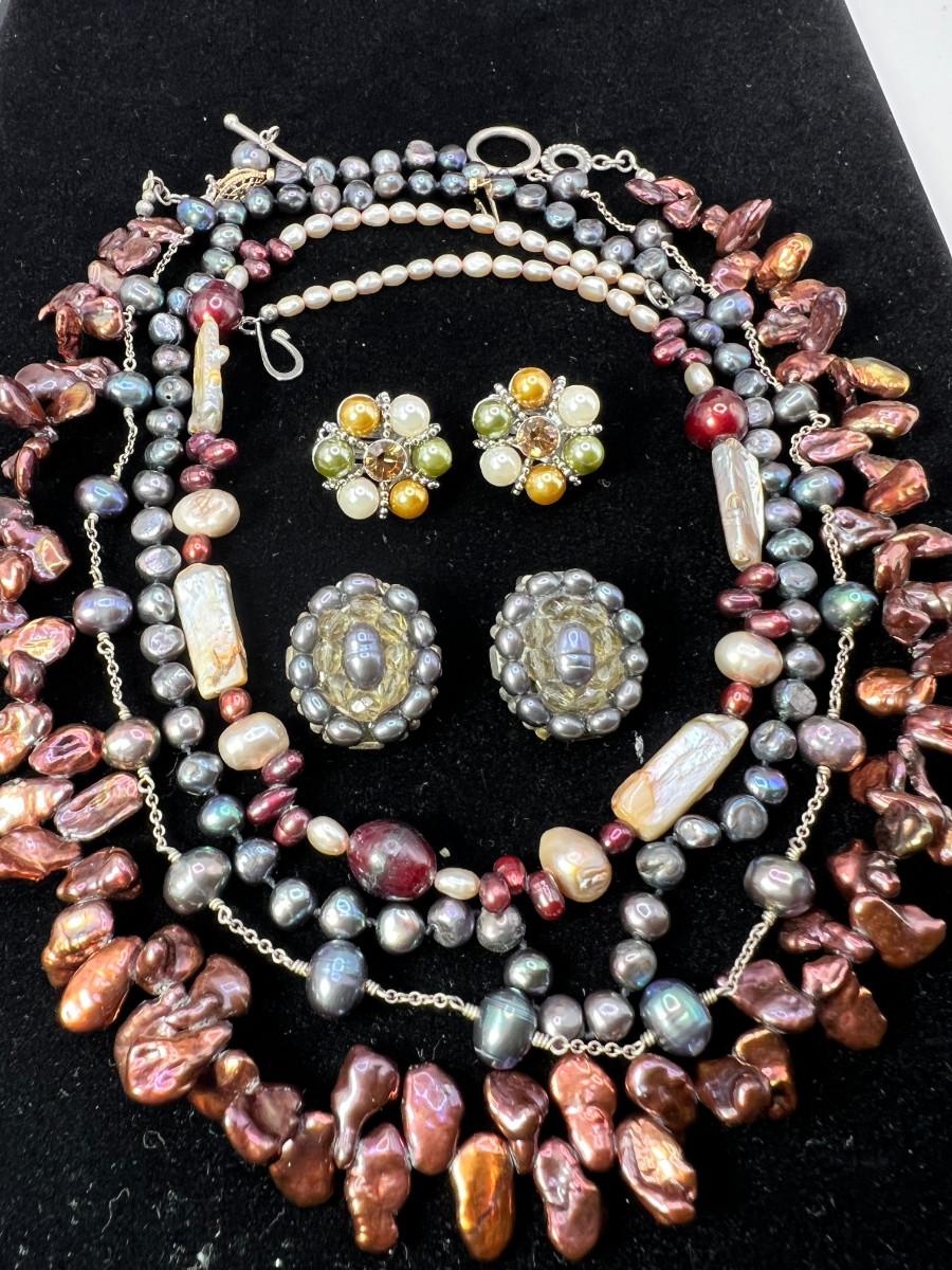 18" garnet necklace, Freshwater pearls, 14K clasp 2 pearl clip on earrings