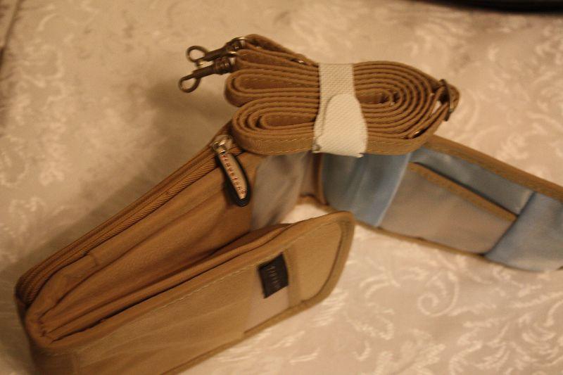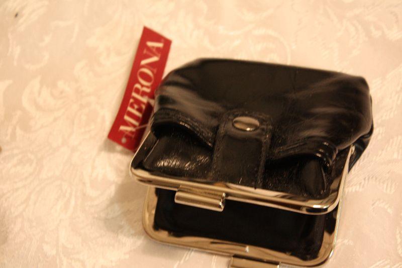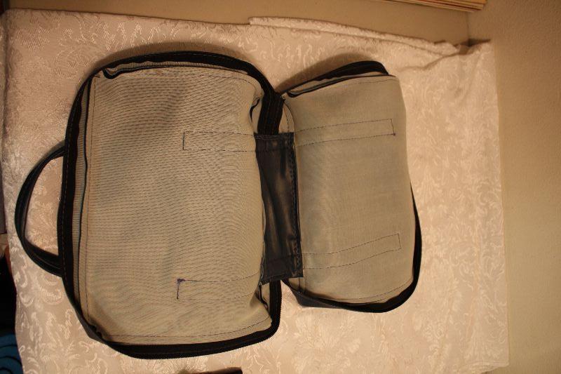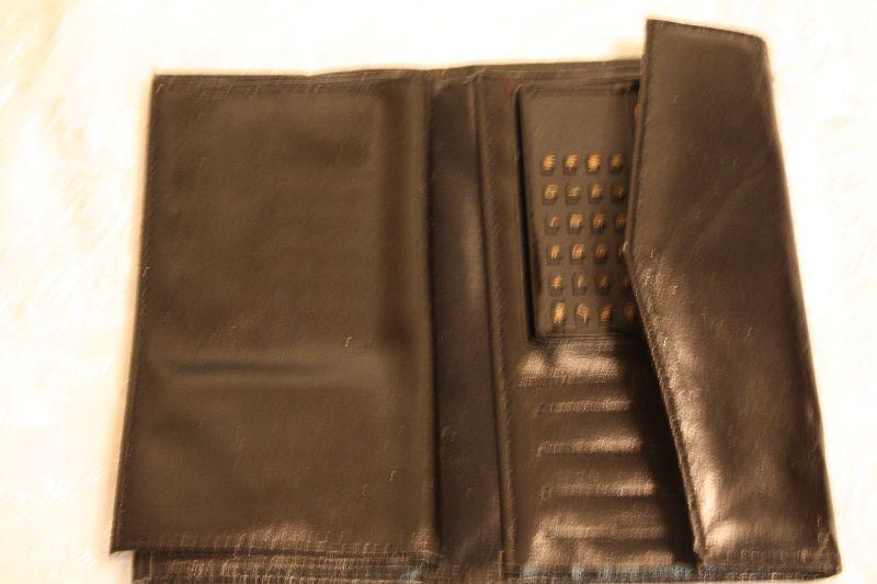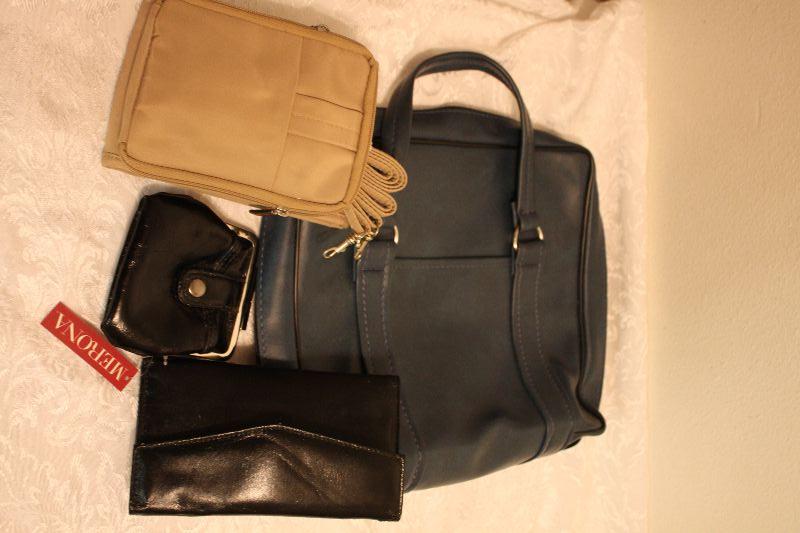 New Travelon bag with built in flashlight, New black wallet with calculator and checkbook, New Merona black wallet with tags, Blue carry bag