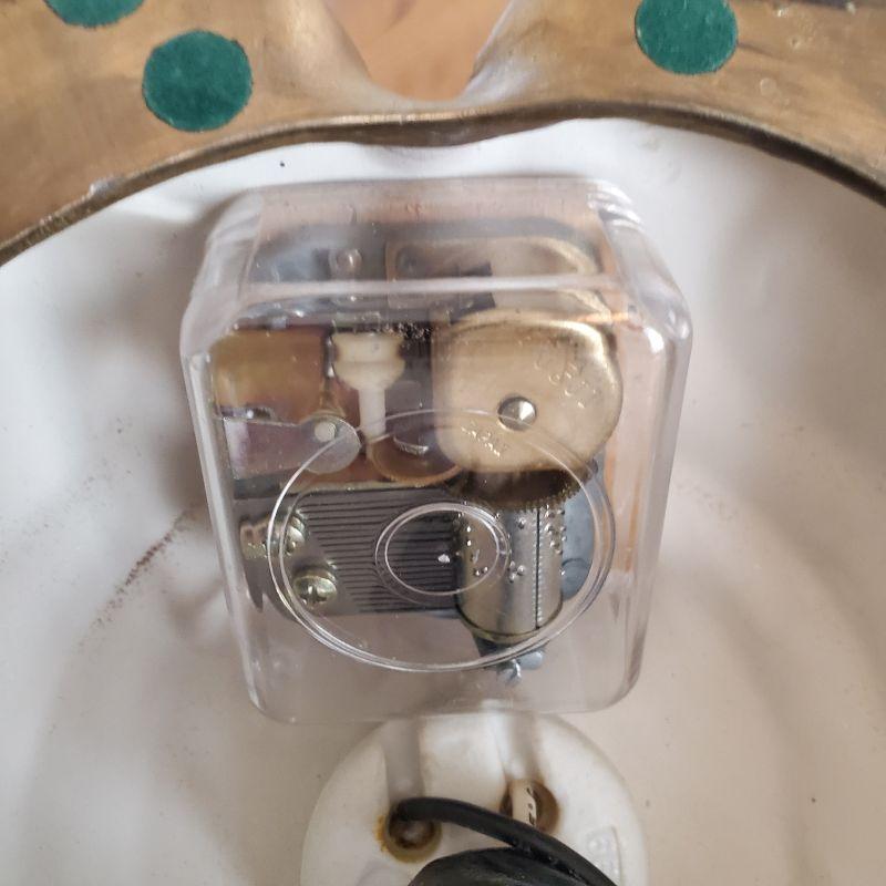 Gold base plays silent night (looks like it needs to be rewired although the lights work). Also looks partially cracked on the top... all colored bulbs are intact but nothing for the top of.the tree