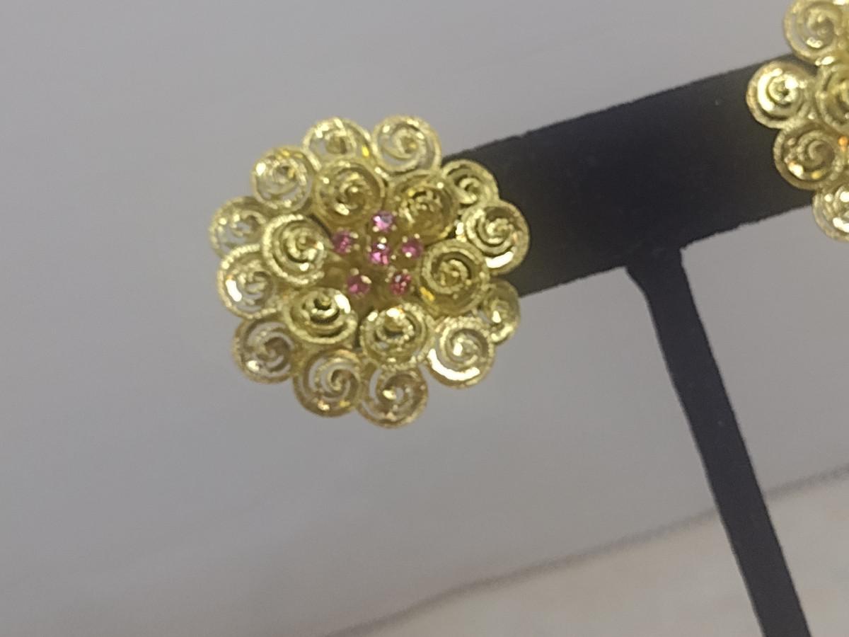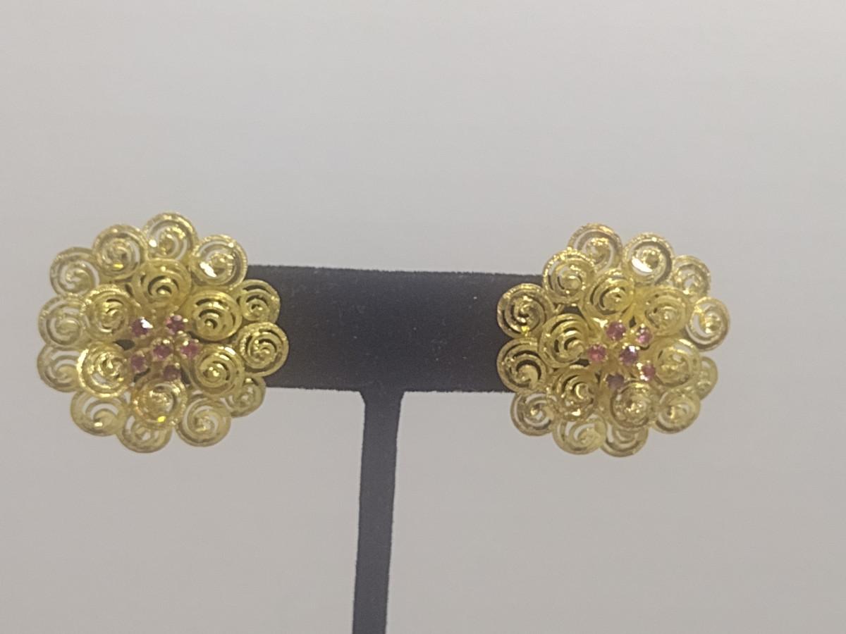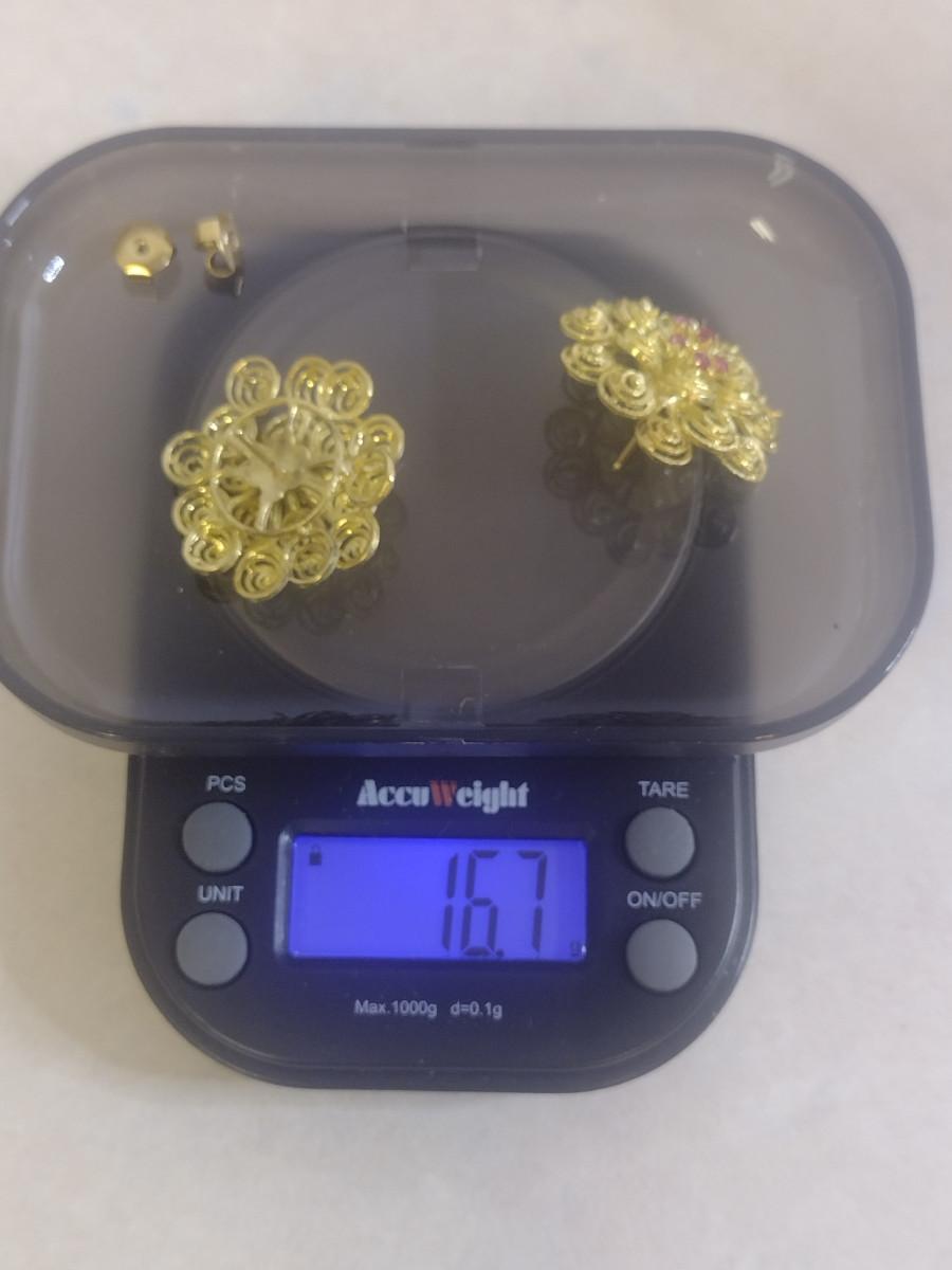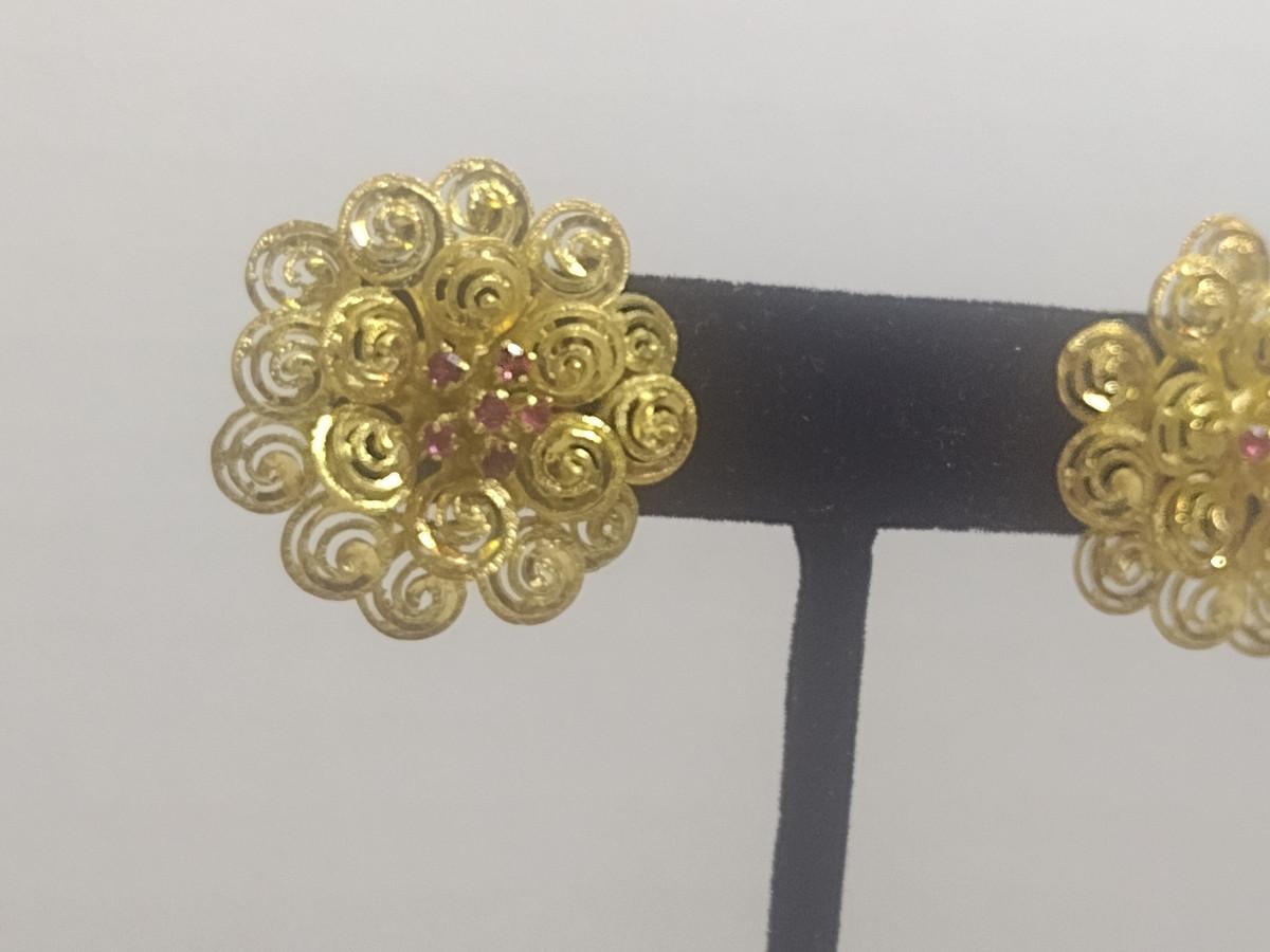 18 Karat Yellow Gold and Gemstone Filigree Post Earrings- Approx Total Weight 16.7 Grams. A 6.75% NC sales tax will be added to the jewelry invoice amount at the end of the sale. Coins are exempt from state sales tax.