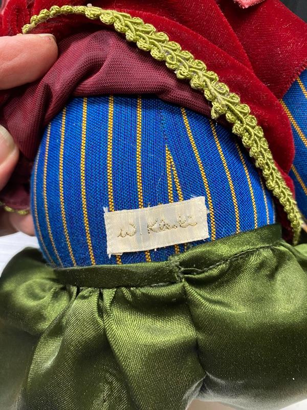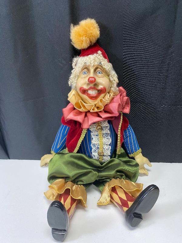 18" vintage Katherine's Collection Wayne Kleski clown jester doll. Good condition, may be a little dusty. Signed embroidered tag on back.