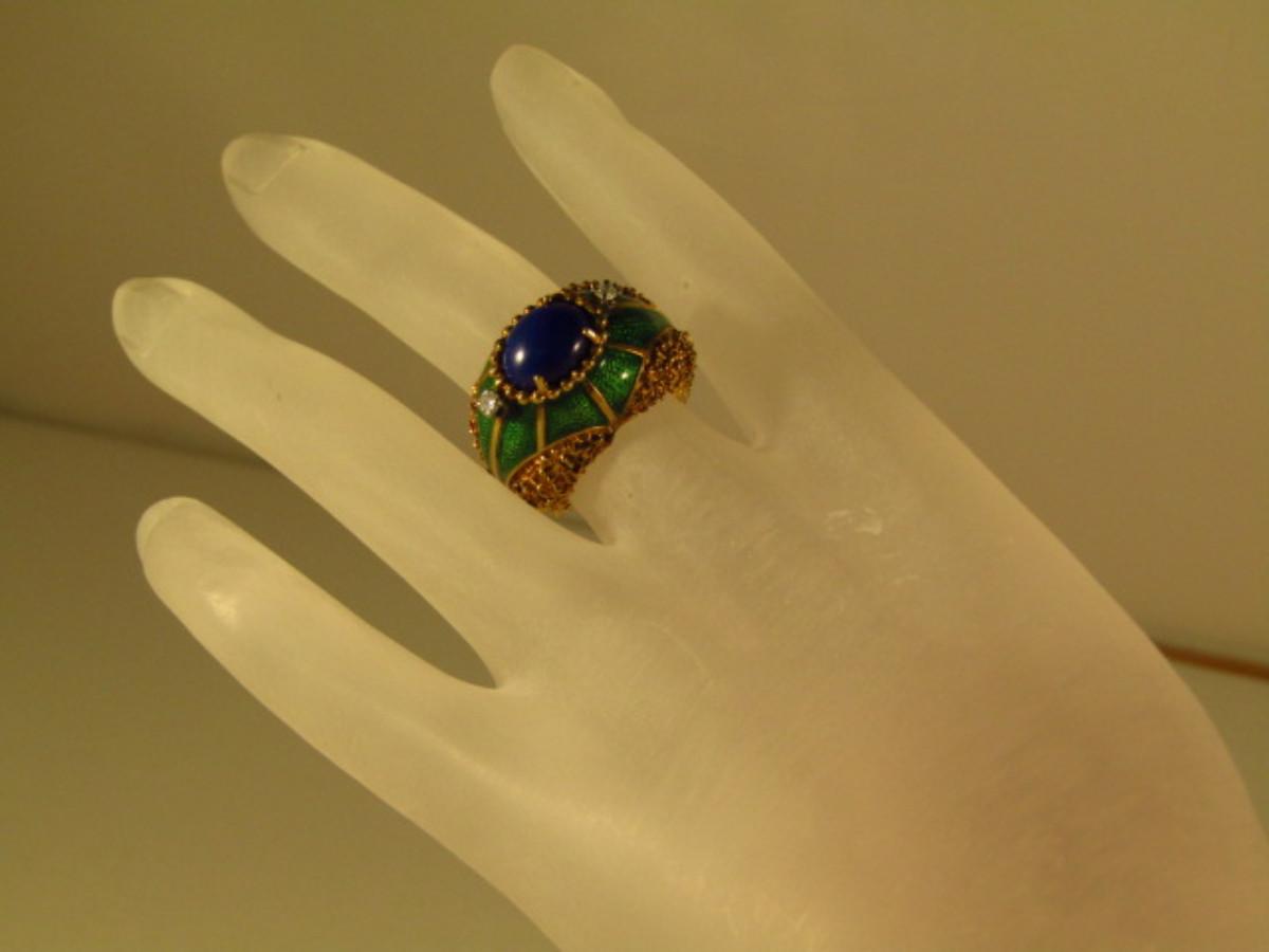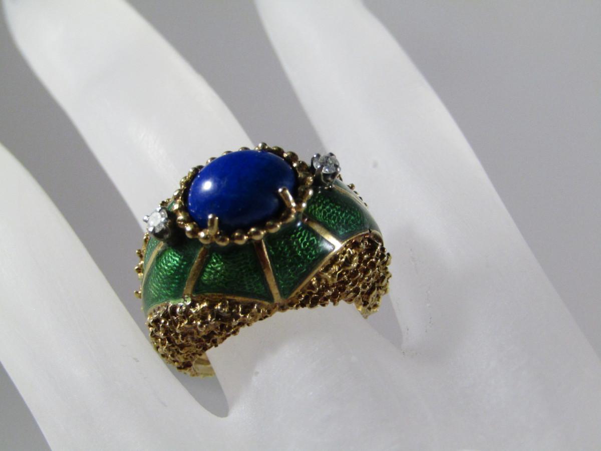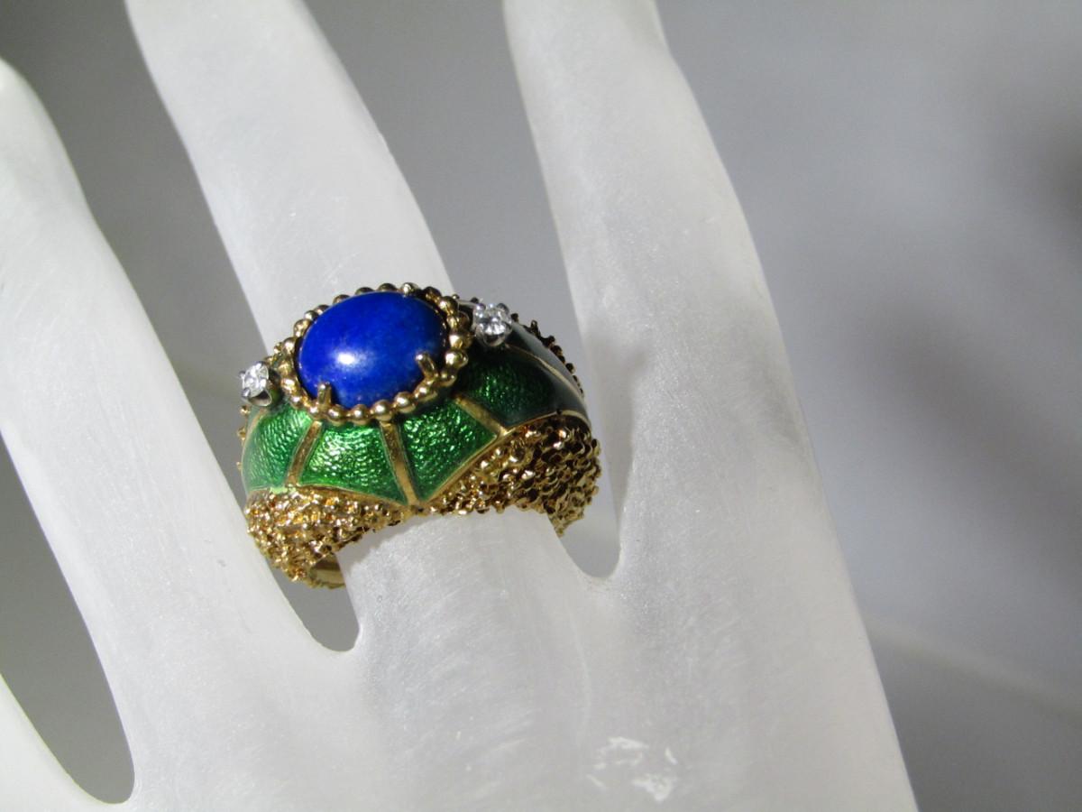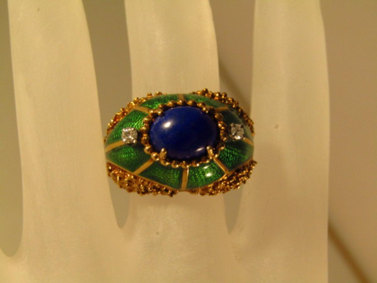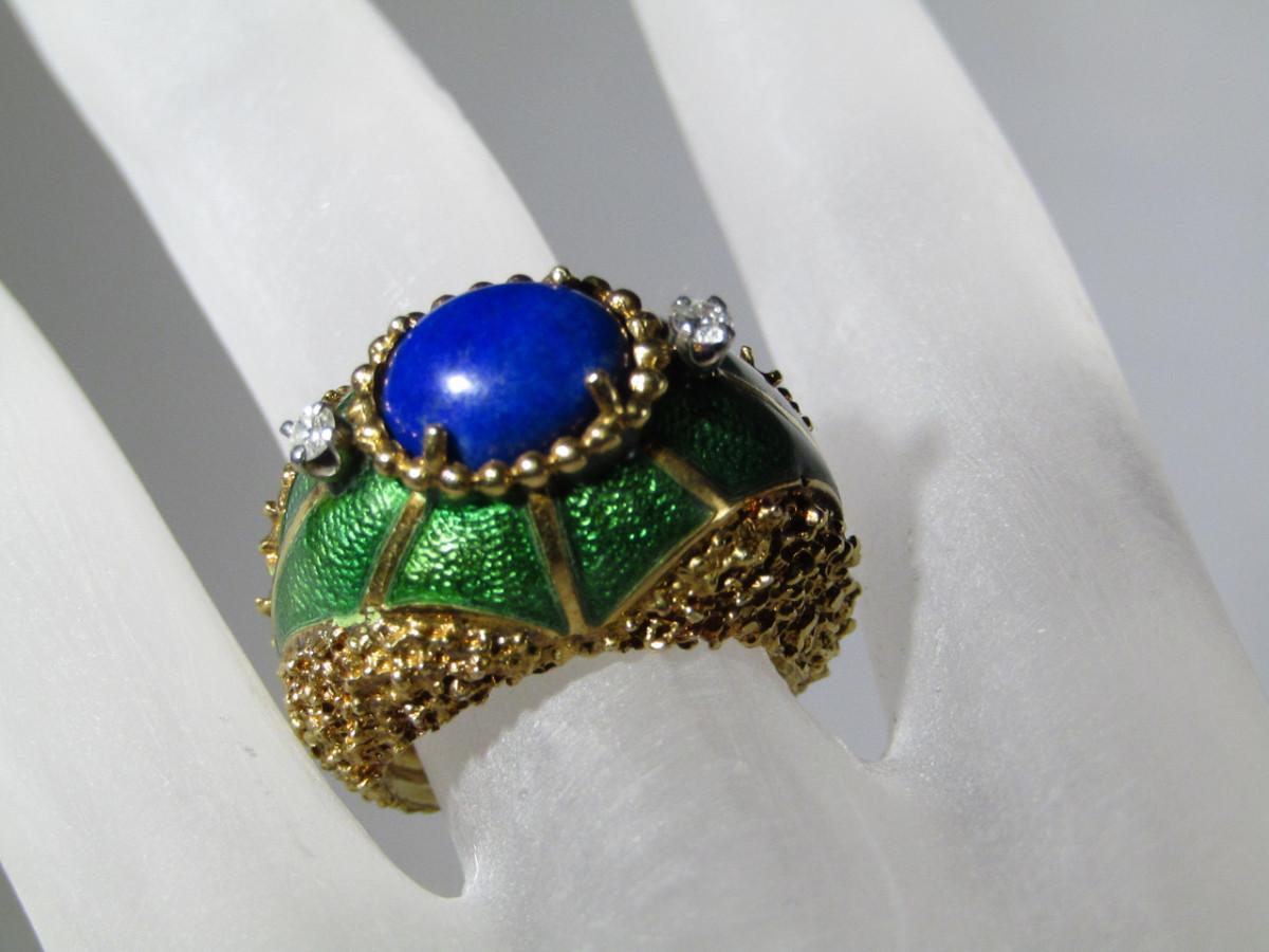 18 Kt Diamond and Lapis Designer Ring- Size 6 1/4- Approx Weight 16.7 Grams (#11). Cabechon cut lapis with diamond on each side. Green enamel on 18 Kt yellow gold. Signed by maker.