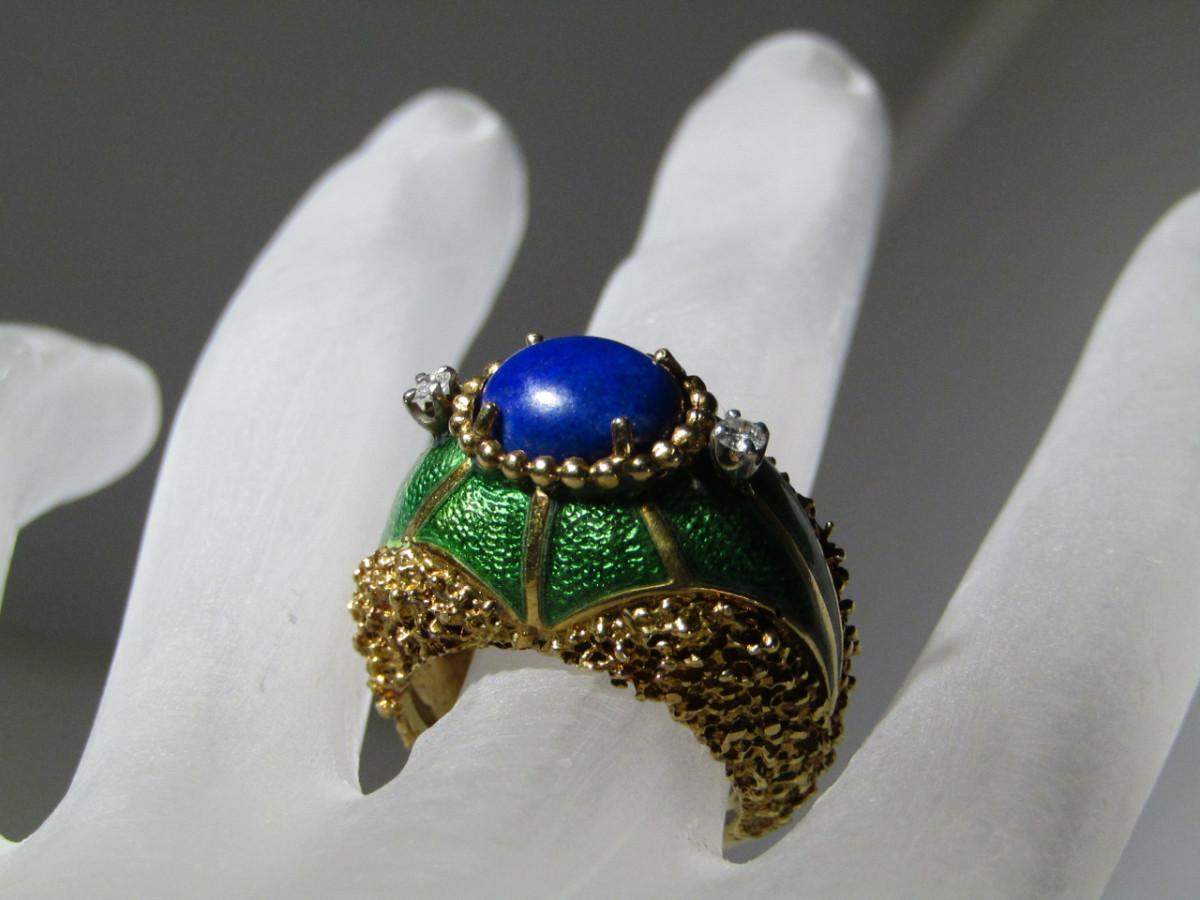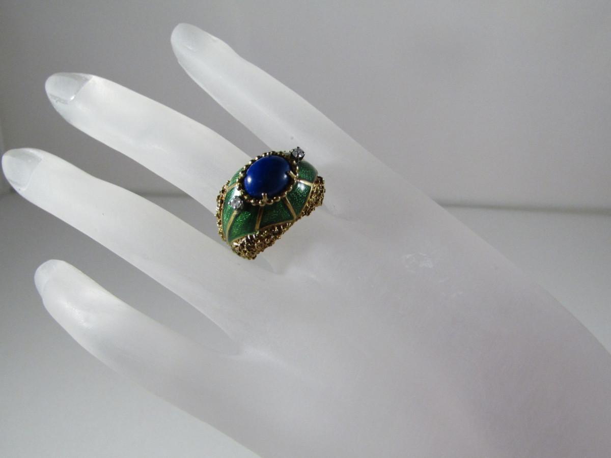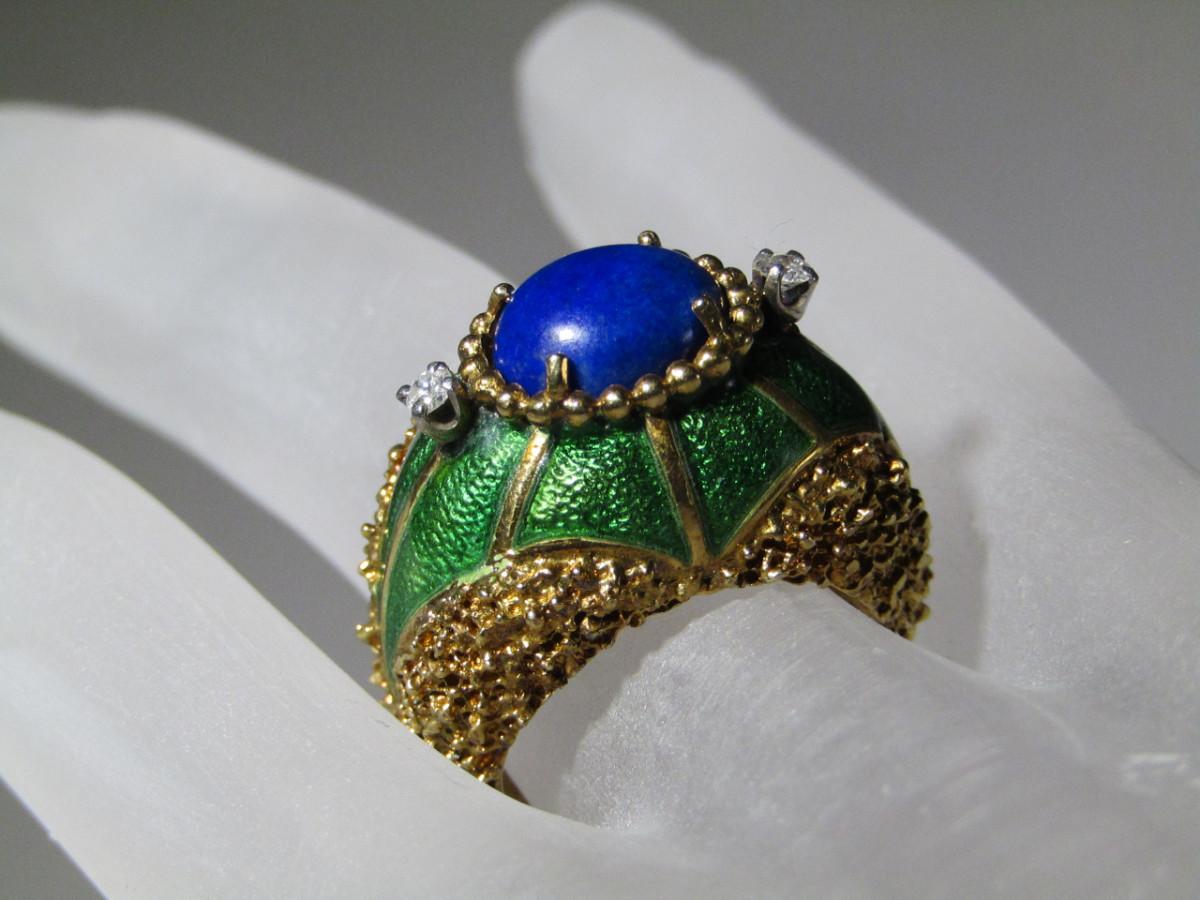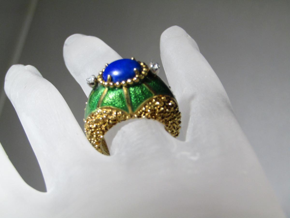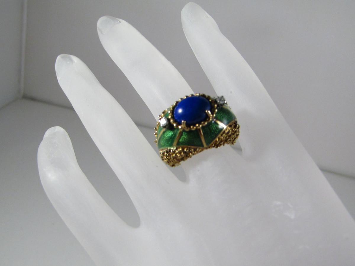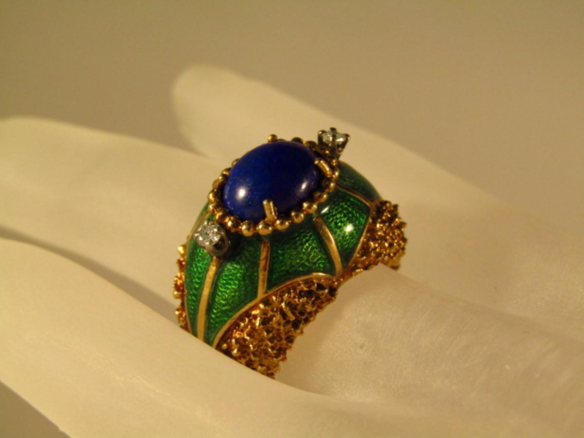 18 Kt Diamond and Lapis Designer Ring- Size 6 1/4- Approx Weight 16.7 Grams (#11). Cabechon cut lapis with diamond on each side. Green enamel on 18 Kt yellow gold. Signed by maker.