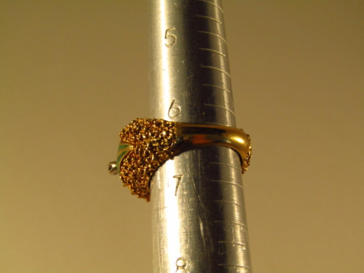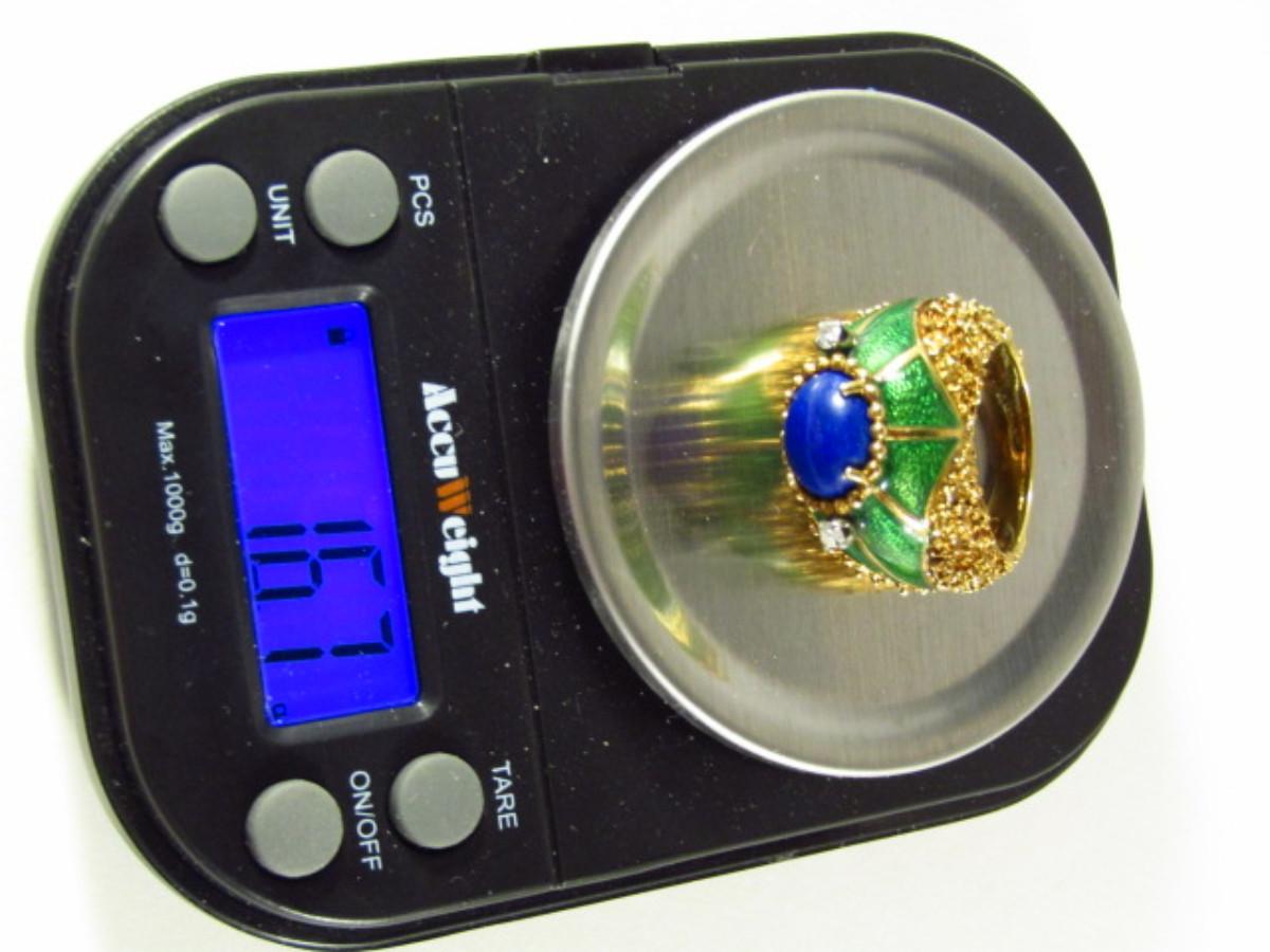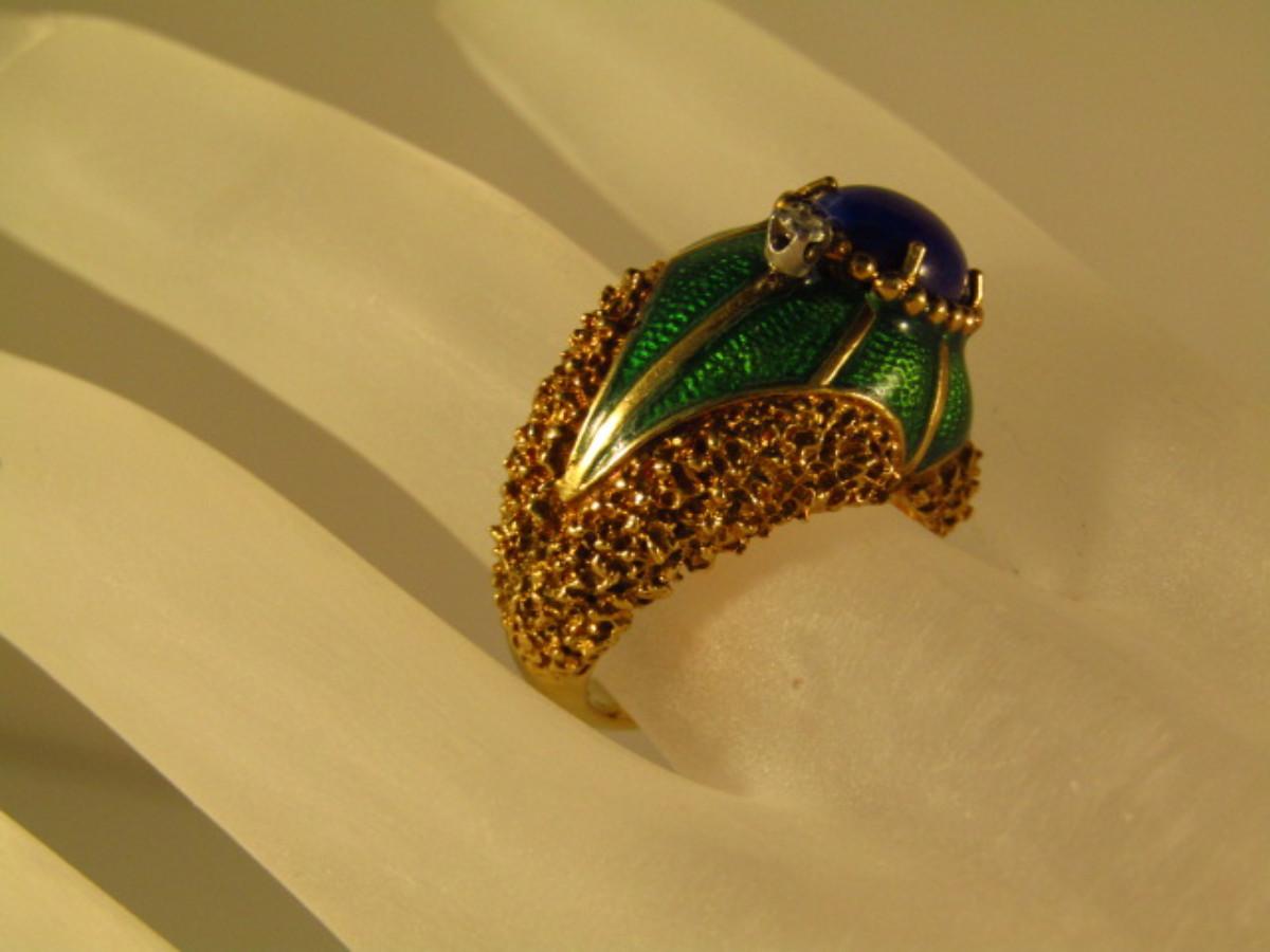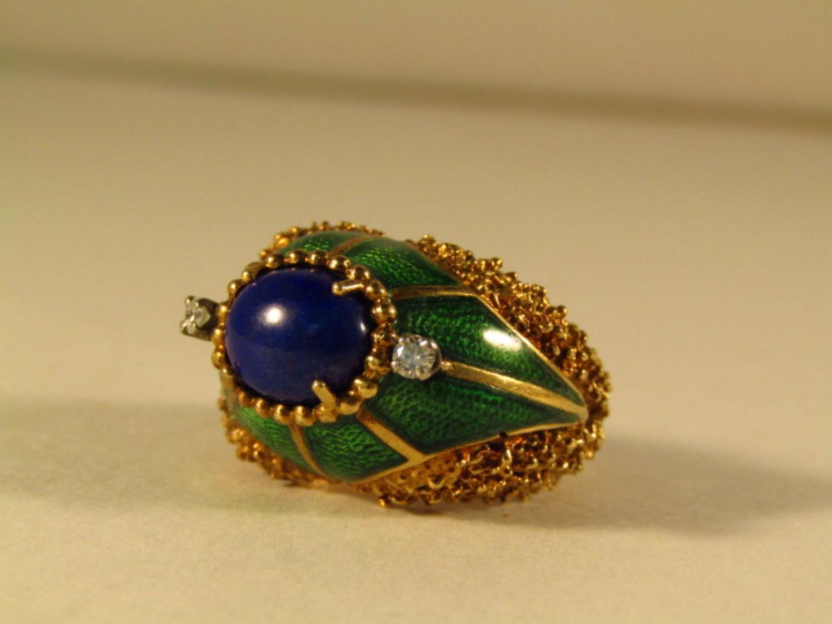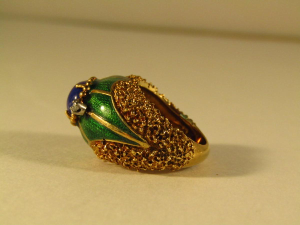 18 Kt Diamond and Lapis Designer Ring- Size 6 1/4- Approx Weight 16.7 Grams (#11). Cabechon cut lapis with diamond on each side. Green enamel on 18 Kt yellow gold. Signed by maker.