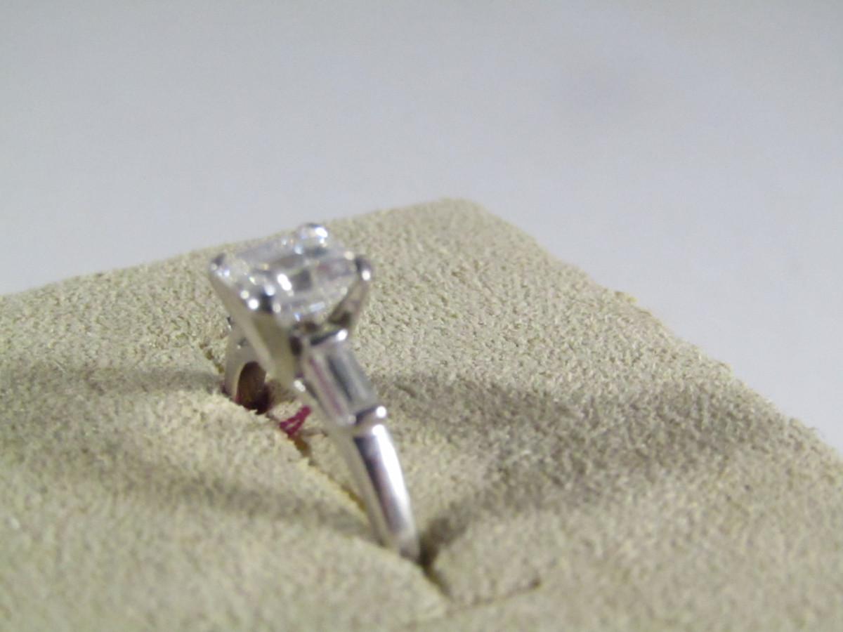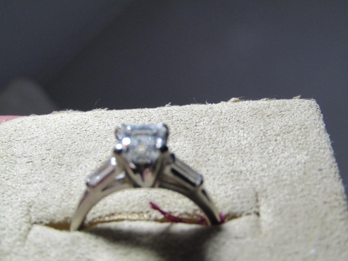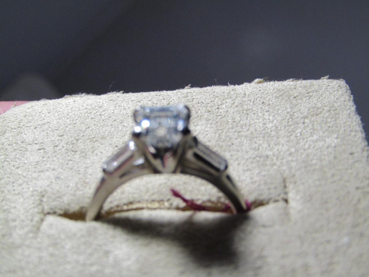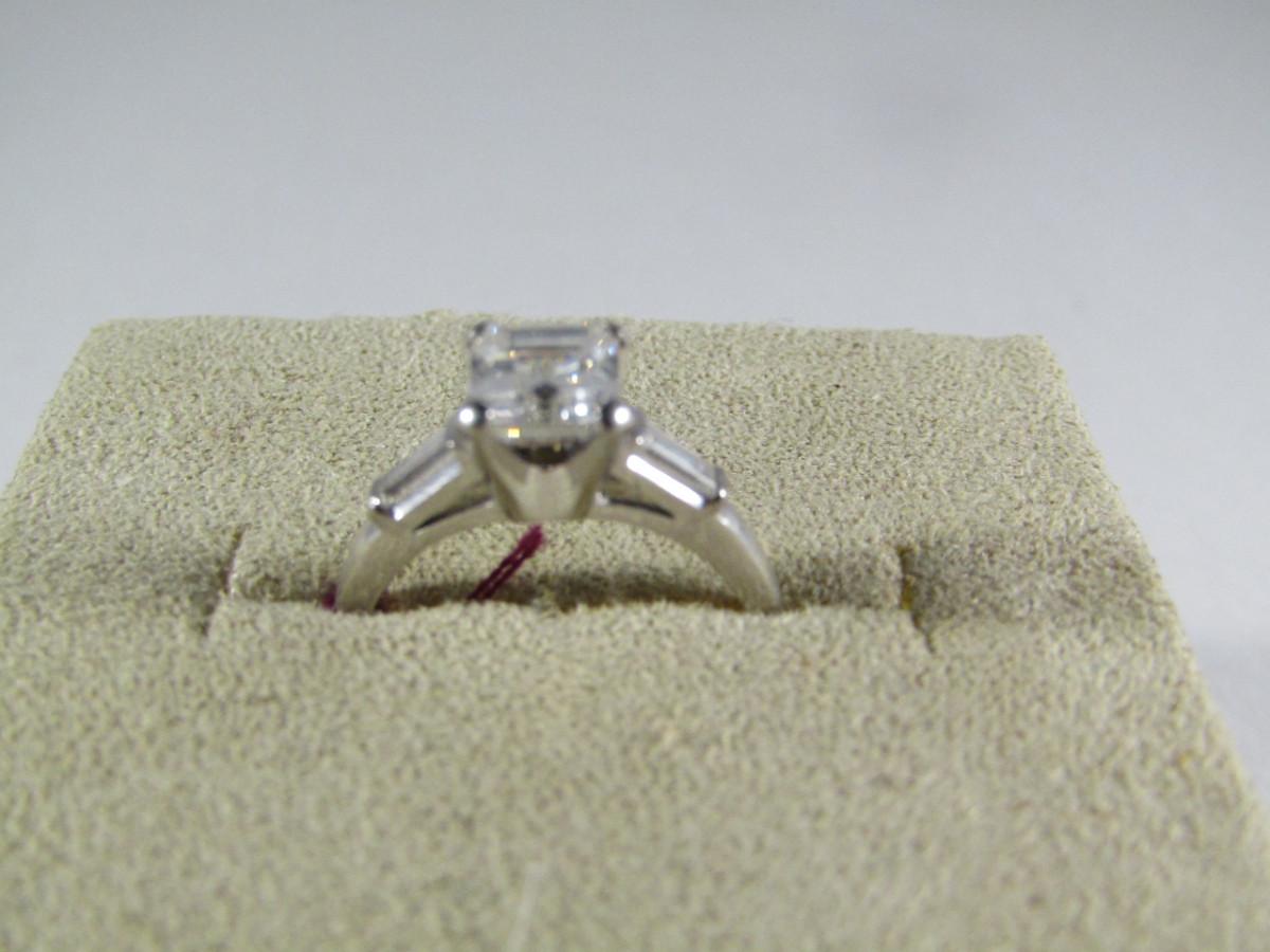 18 Kt White Gold and Emerald Cut Diamond Ring- Size 6- Approx Weight 2.1 dwt (#26). Please see attached assessment for information regarding stone quality and weight.