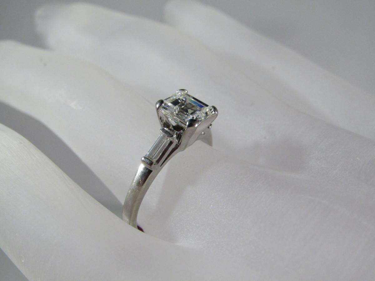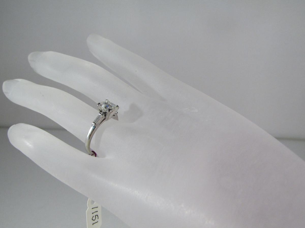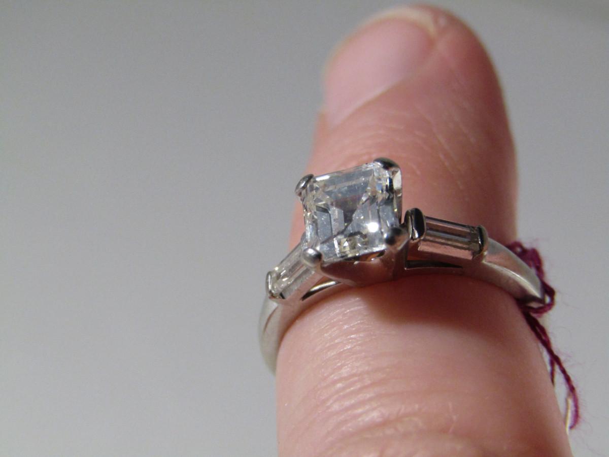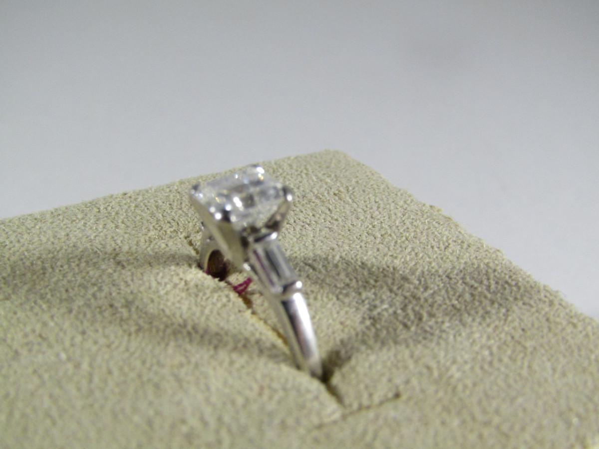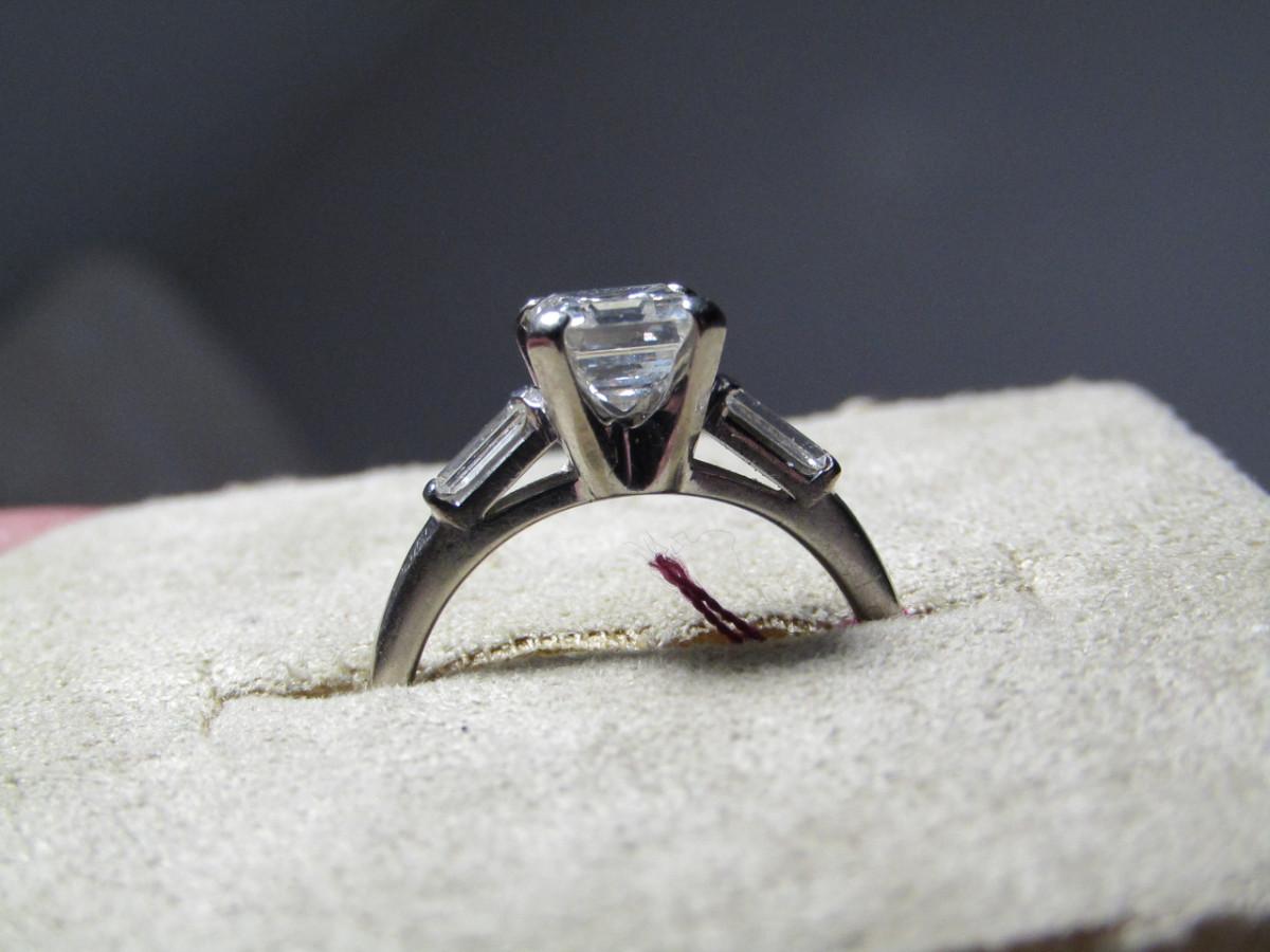 18 Kt White Gold and Emerald Cut Diamond Ring- Size 6- Approx Weight 2.1 dwt (#26). Please see attached assessment for information regarding stone quality and weight.