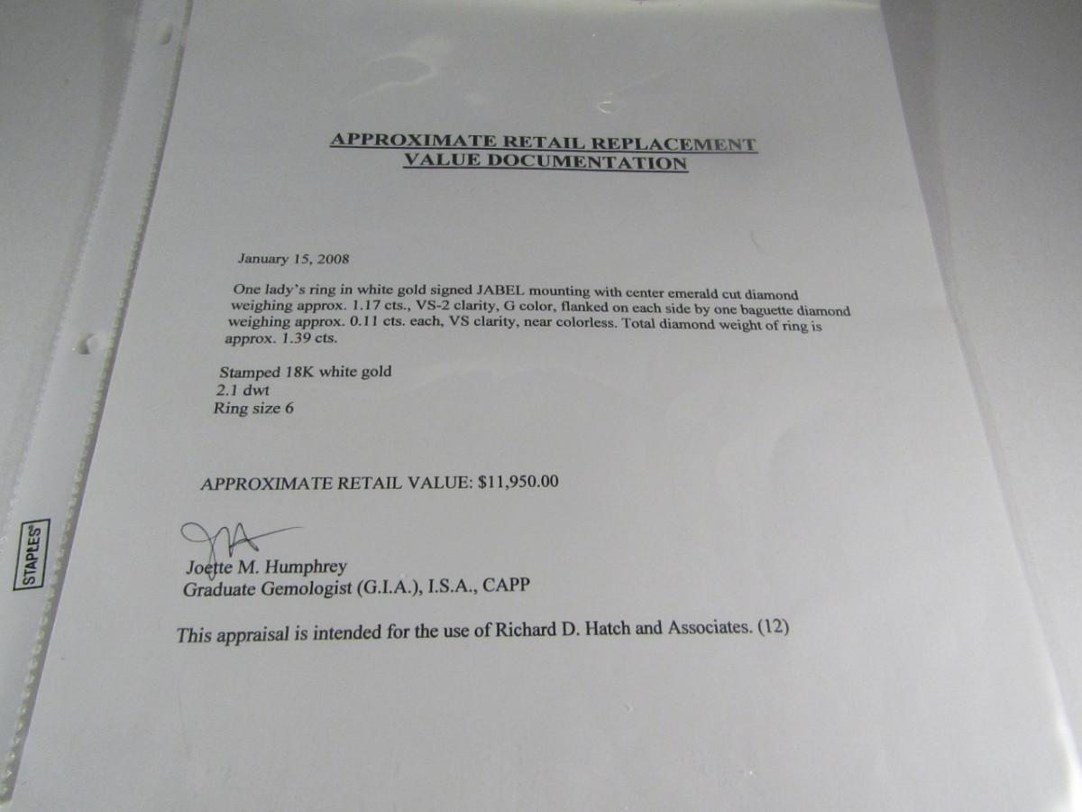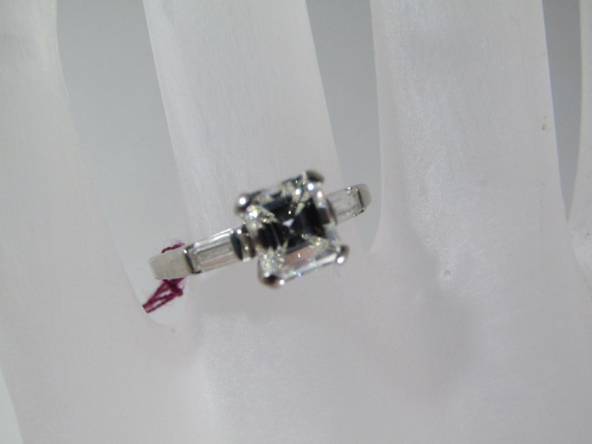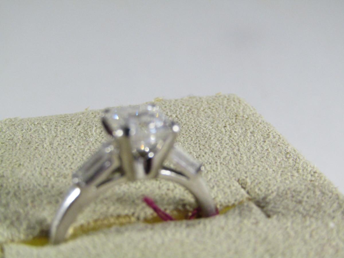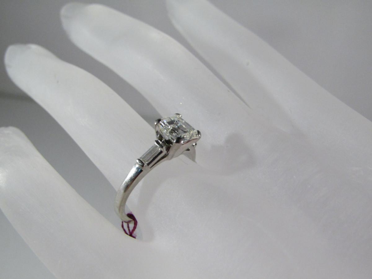18 Kt White Gold and Emerald Cut Diamond Ring- Size 6- Approx Weight 2.1 dwt (#26). Please see attached assessment for information regarding stone quality and weight.