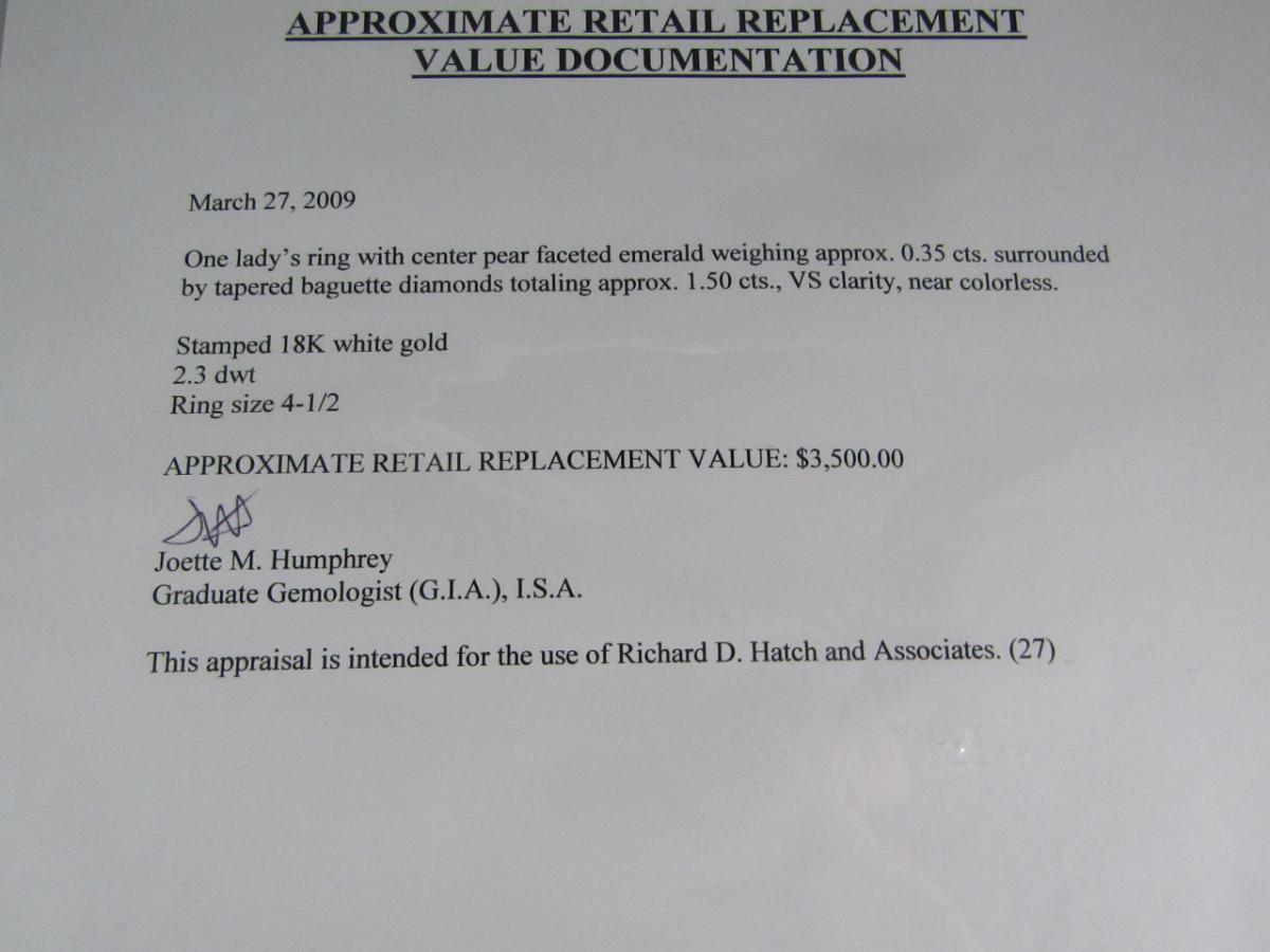 18 Kt White Gold Emerald and Diamond Ring- Size 4 1/2- Approx Weight 2.3 dwt (#29). Please see attached assessment for information regarding stone quality and weight.