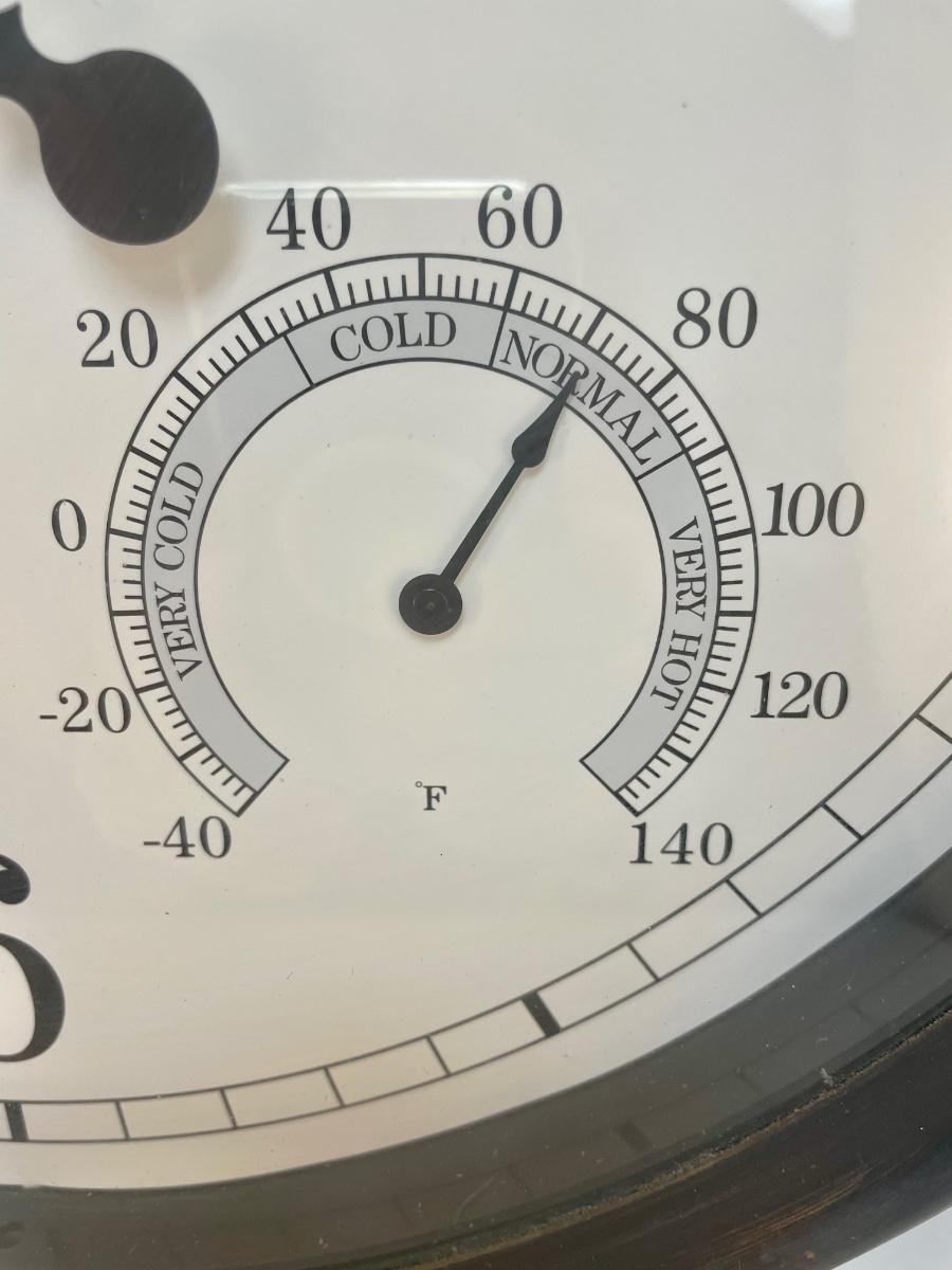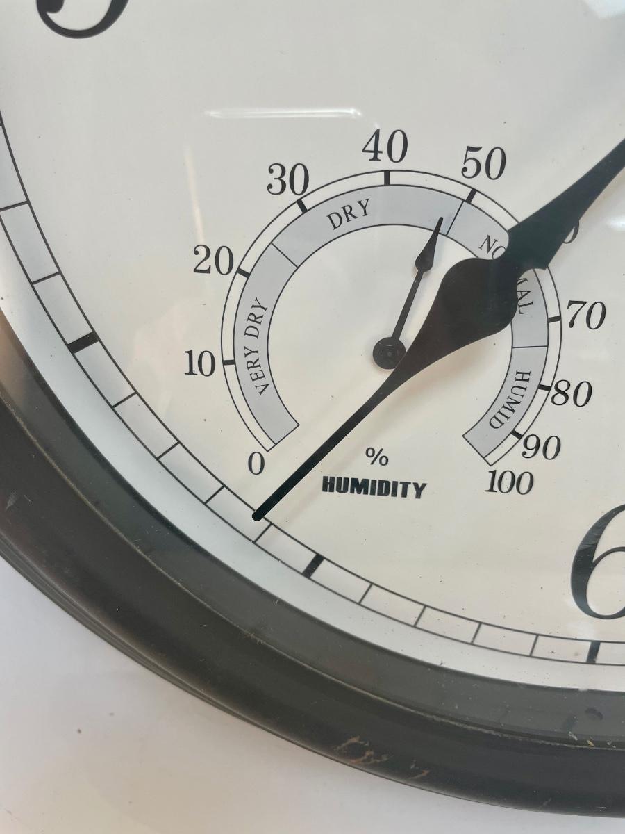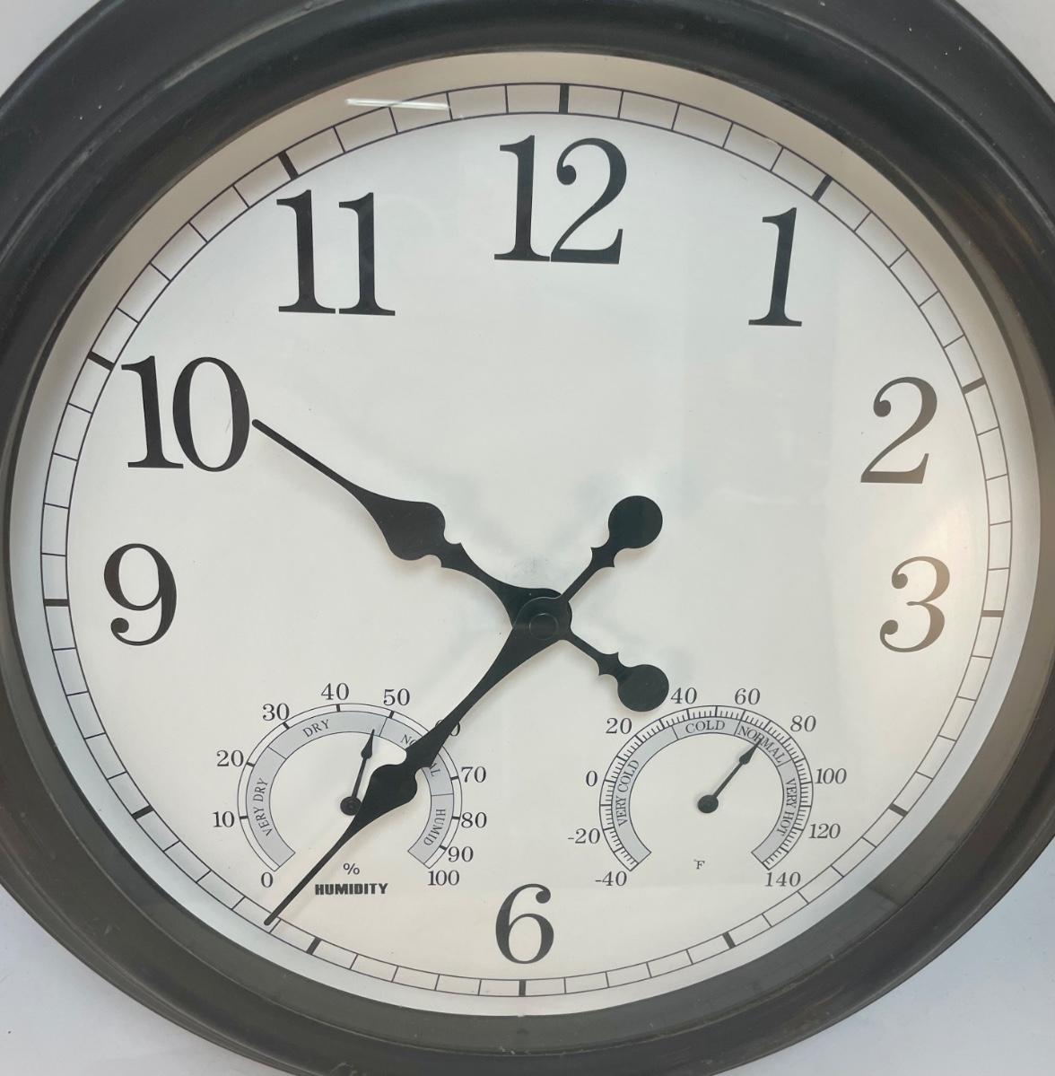 18” Metal framed Outdoor Clock with Humidity and Temperature Gauges. Tested, runs well, everything works. Made in China.