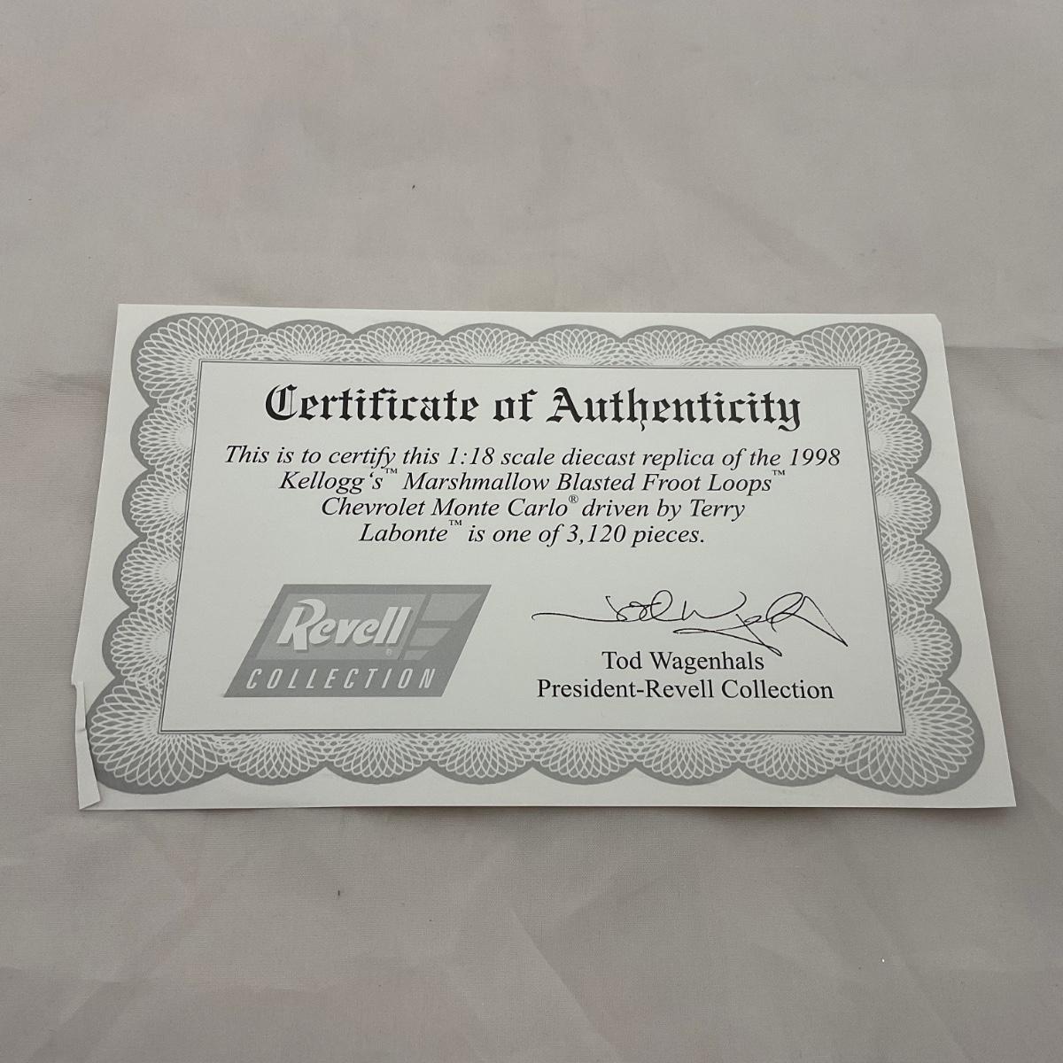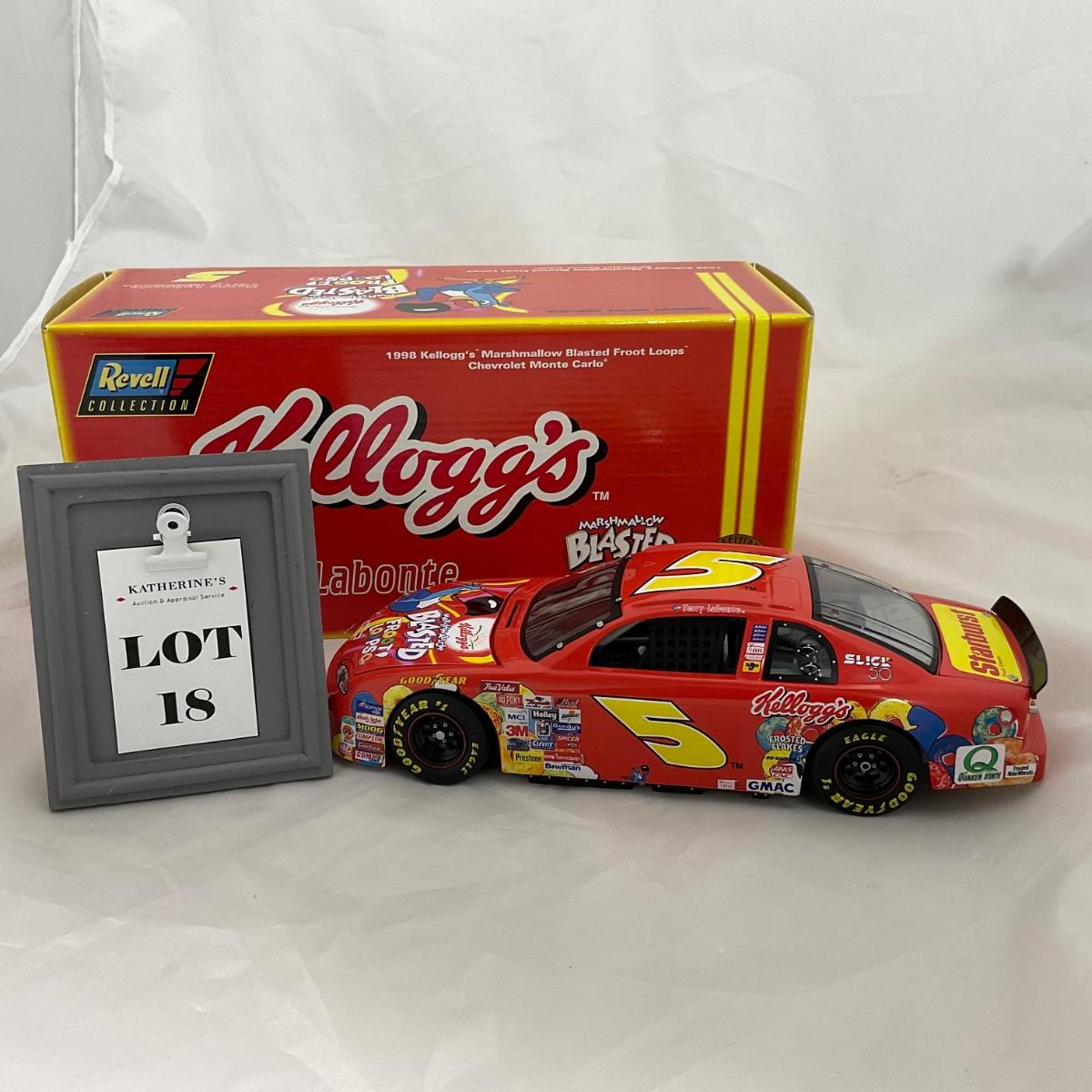 One NASCAR die cast 1:18 scale 1998 Kelloggs Marshmallow Blasted Froot Loops Chevrolet Monte Carlo figure. Terry Labonte. Comes with a Certificate of Authenticity. Please see photos for details and condition. ::: Shipping is available on this lot. If you require shipping you must let us know at the close of the auction. We will coordinate with you after the item has been won. Shipping fees will include insurance up to or exceeding the value of all items being mailed. If you have any questions regarding this lot please contact the auctioneer either via this website, by direct email or by phone. PICK UP TIMES and other important information can be found in the TERMS and DESCRIPTION of the auction. Please take a look for pertinent information. Thanks!
