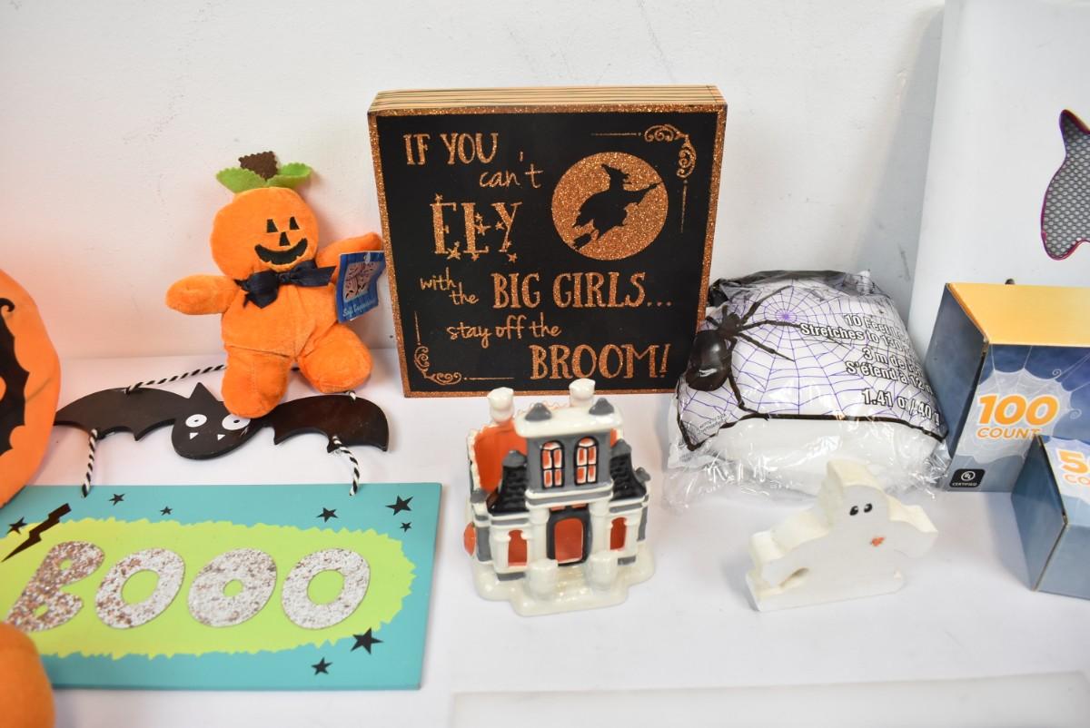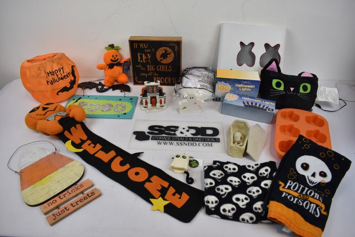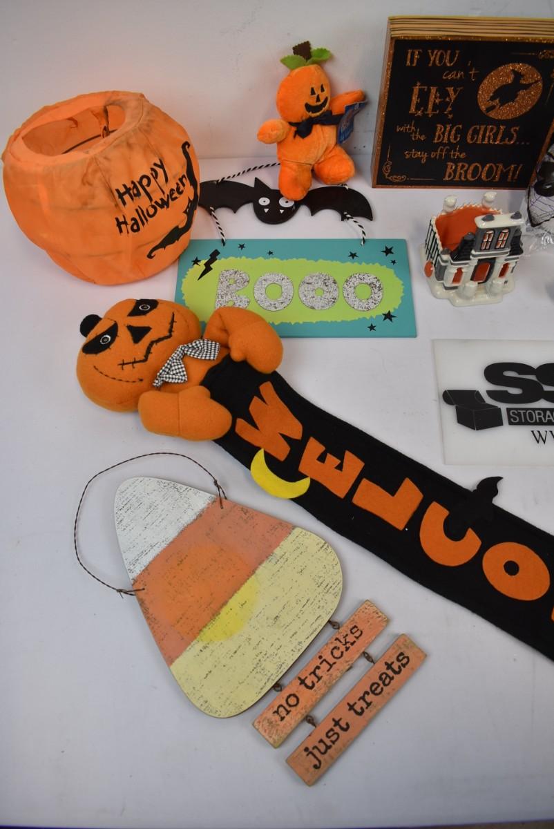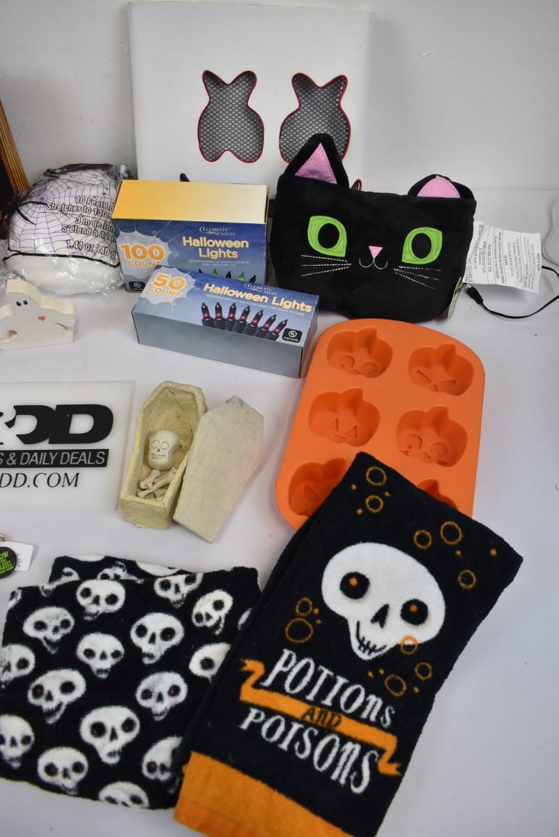 18 pc Halloween Decor: Signs, Kitchen Towels, Lights, etc