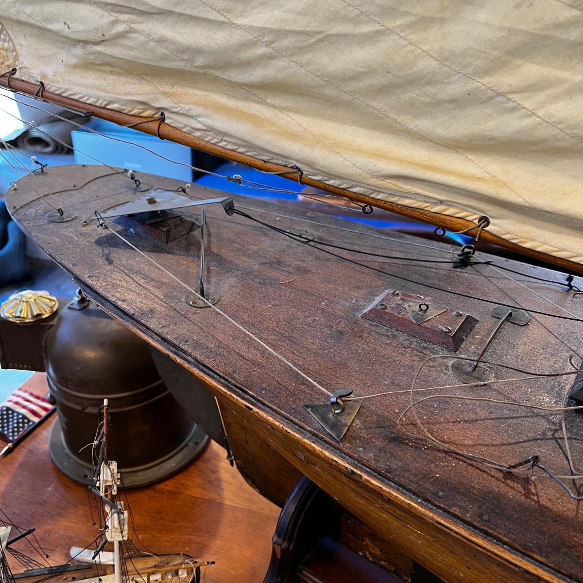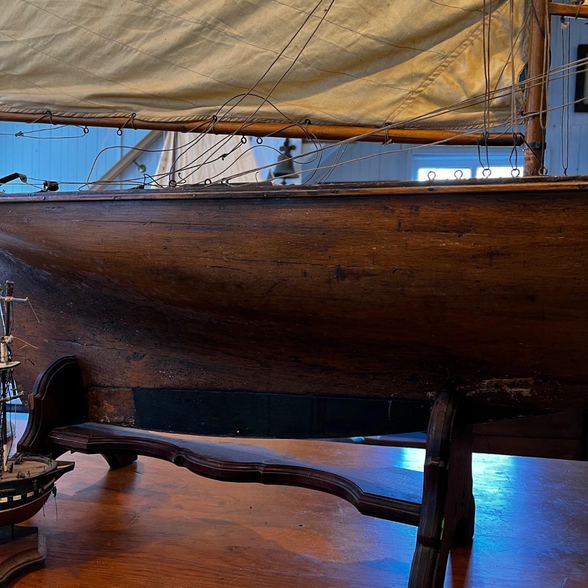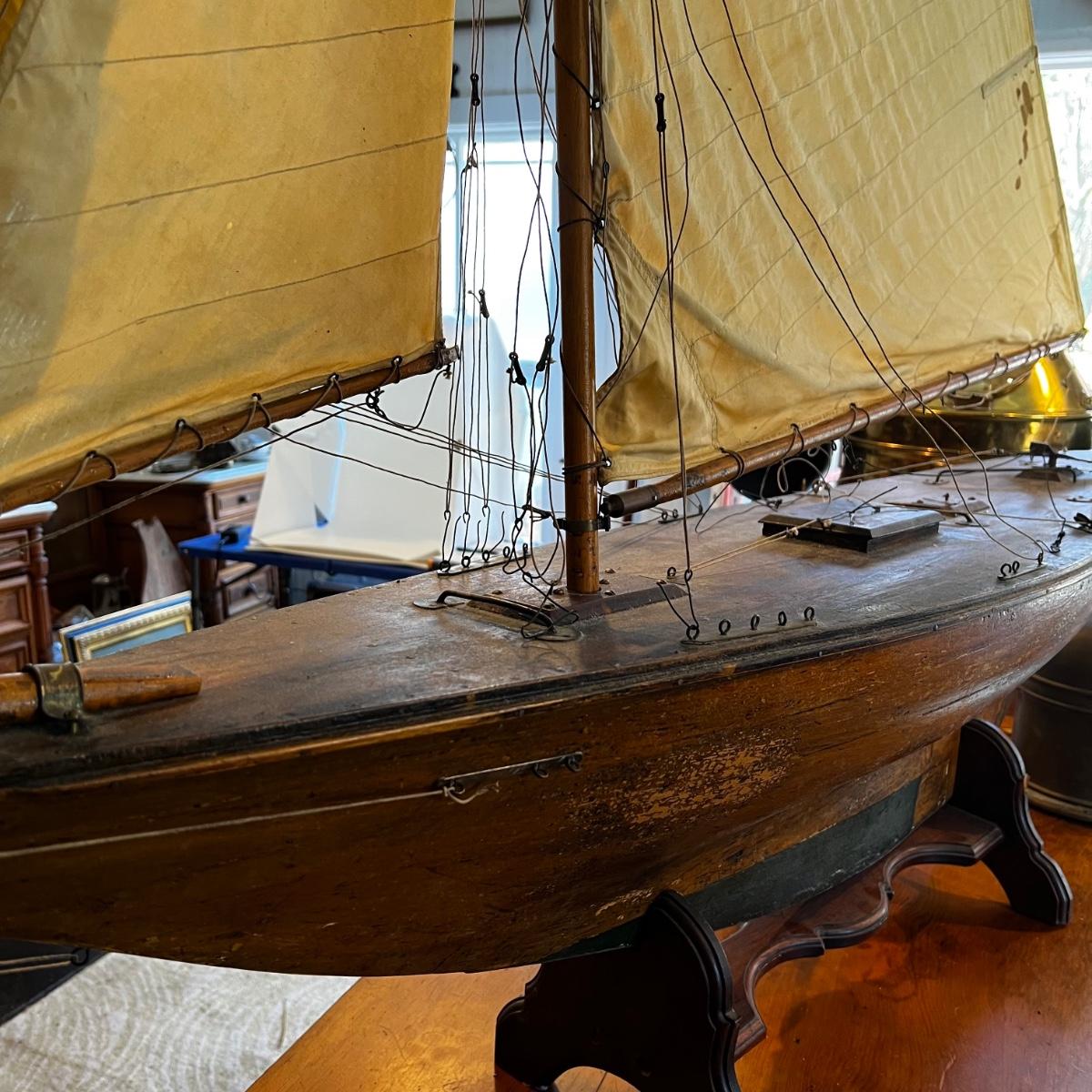 Good condition handcrafted antique This pond yacht is a rare and beautiful piece of history, made with exquisite craftsmanship and quality materials. The cotton sails are original and have a charming patina, with only a few minor stains and tears. The hull and mast are sturdy and elegant, showing the skill and artistry of the maker. This pond yacht is in good condition for its age and would make a stunning addition to any collection or display. Don’t miss this opportunity to own a unique and authentic antique pond yacht!
