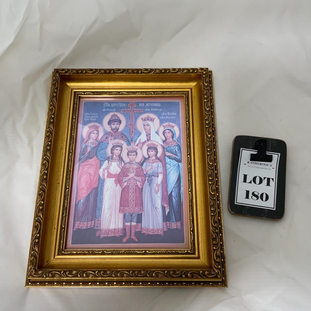 From the Estate of Peter Radovanovich: Eastern Orthodox Idol rendering of the Romanov Family of Saints. The entirety of the Romanov family were deemed saints in 1998 by the Russian Orthodox Church. Frame Measures 12.75” x 10”. Please see photos for details and condition. ::: Shipping is available on this lot. If you require shipping you must let us know at the close of the auction. We will coordinate with you after the item has been won. Shipping fees will include insurance up to or exceeding the value of all items being mailed. If you have any questions regarding this lot please contact the auctioneer either via this website, by direct email or by phone. PICK UP TIMES and other important information can be found in the TERMS and DESCRIPTION of the auction. Please take a look for pertinent information. Thanks!