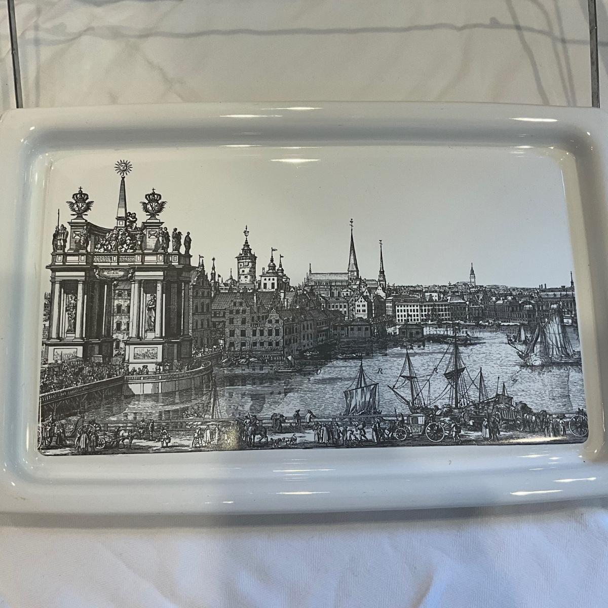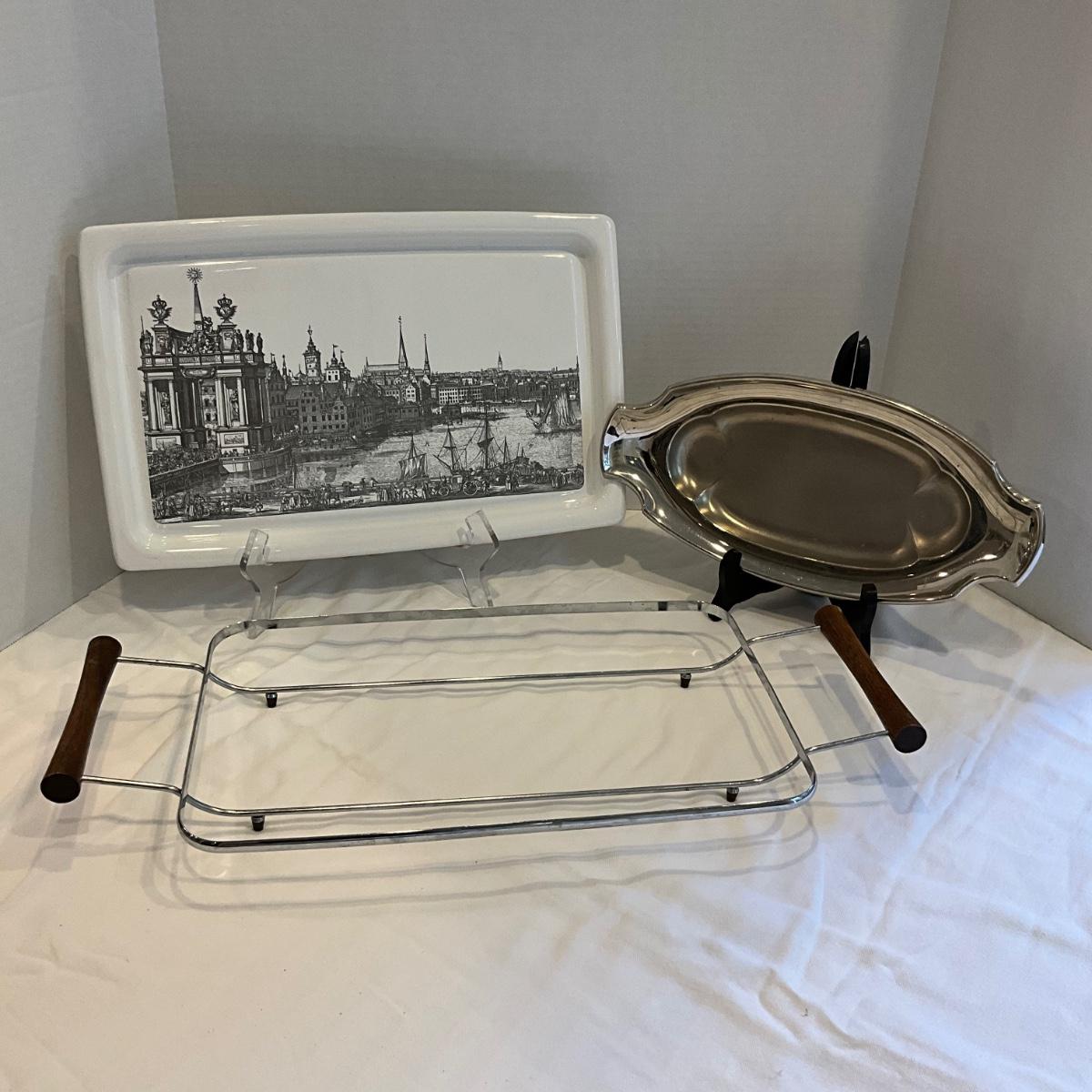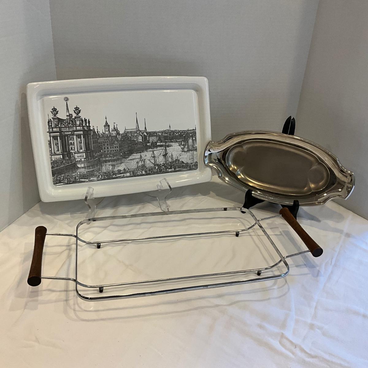 180 Mid Century Renaissance Corning Ware Tray with Wooden Handled Rack and Chrome Tray