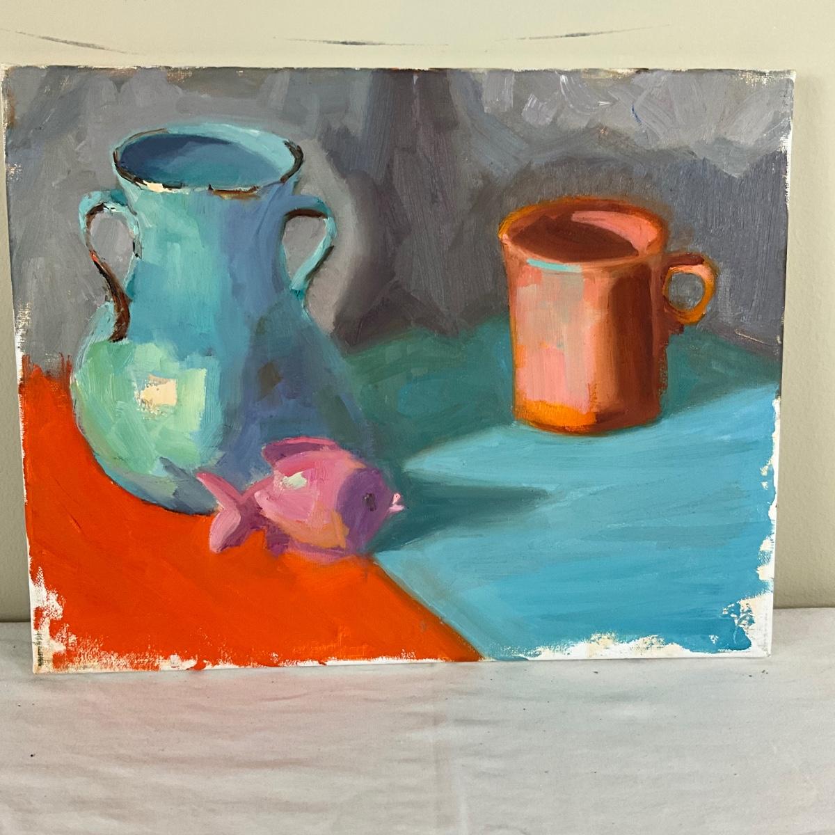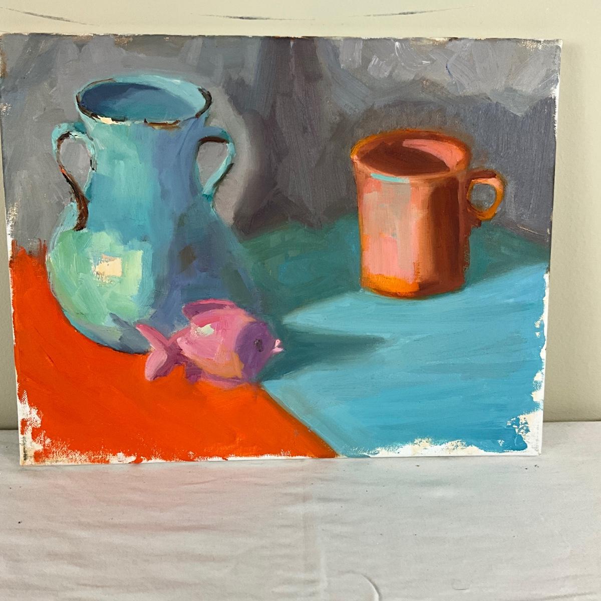 180 Original Oil Painting "Pottery , Mug, Fish" by Kathie Rogers