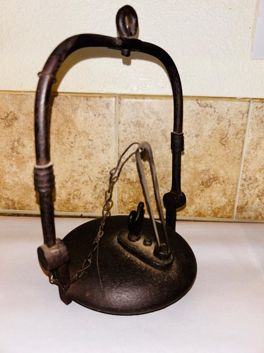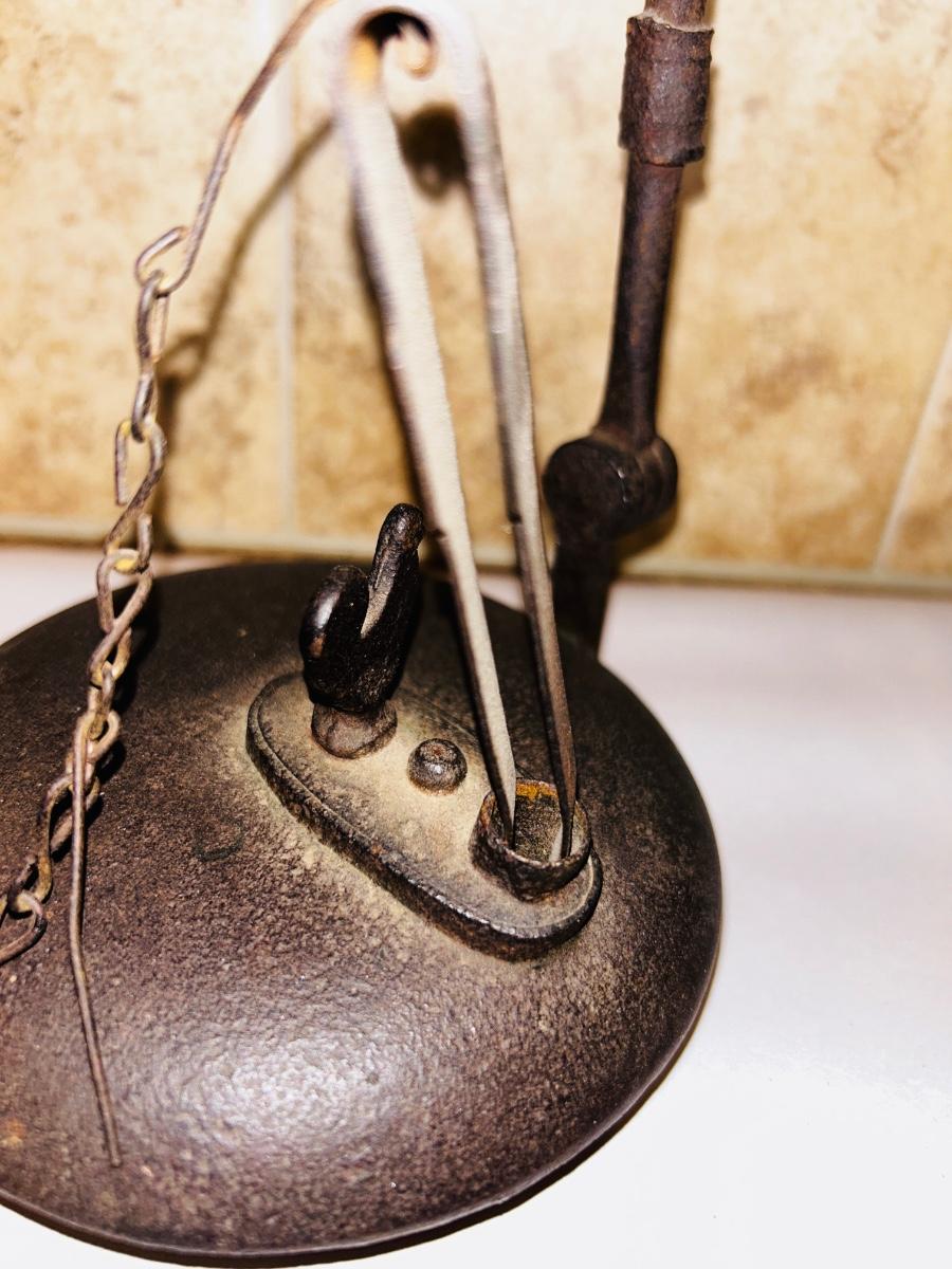 Antique "Betty Lamp," specifically a French cast iron oil lamp from the 1800s, often associated with the Louis XIV style.