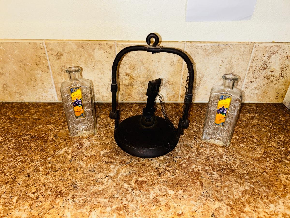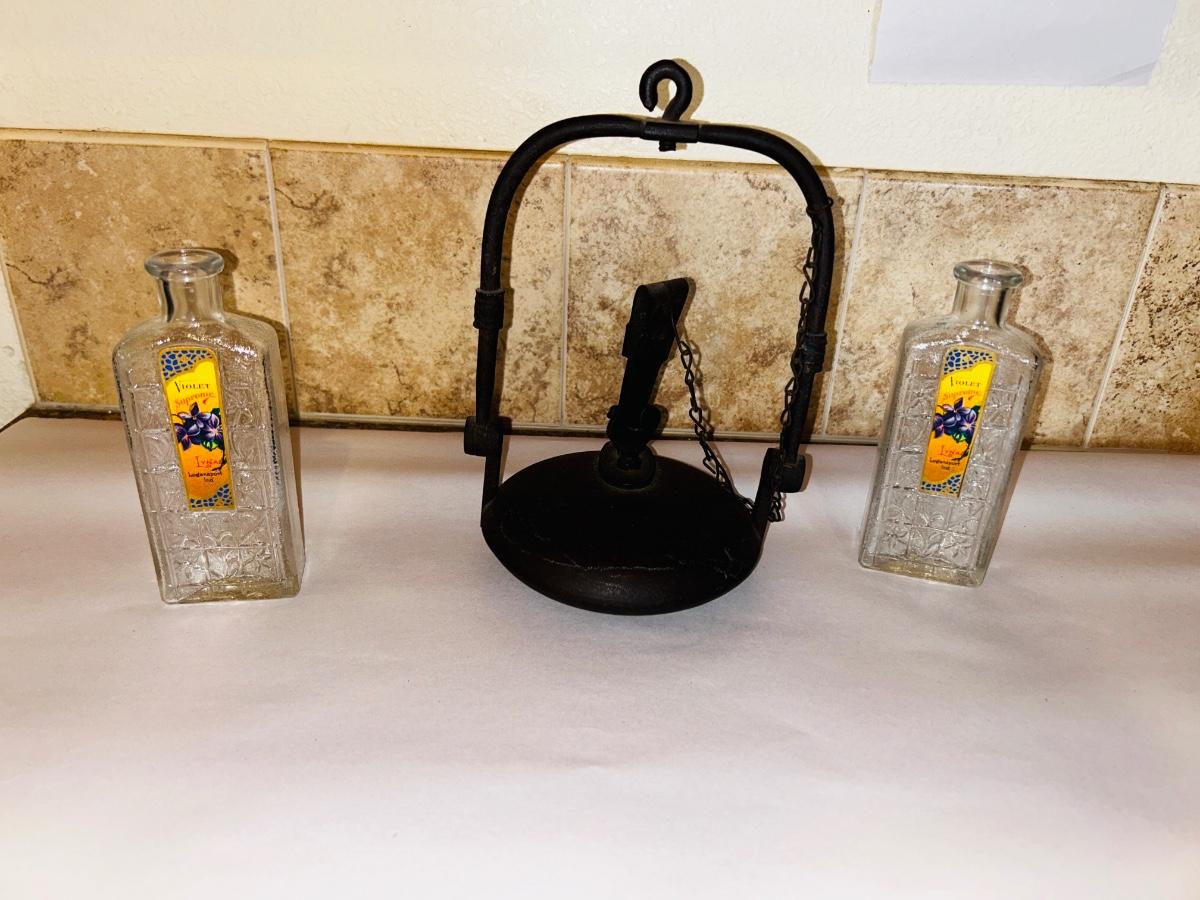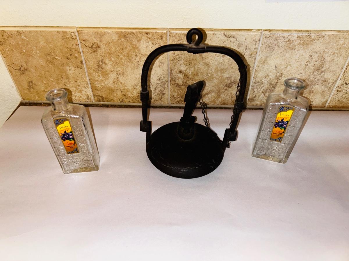 1800’s ANTIQUE FRENCH CAST IRON OIL “BETTY LAMP” AND GLASS BOTTLES