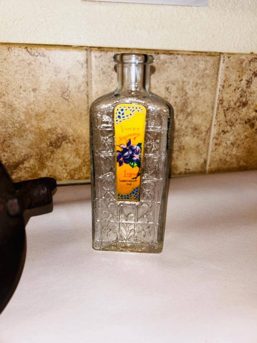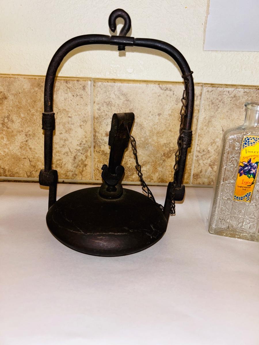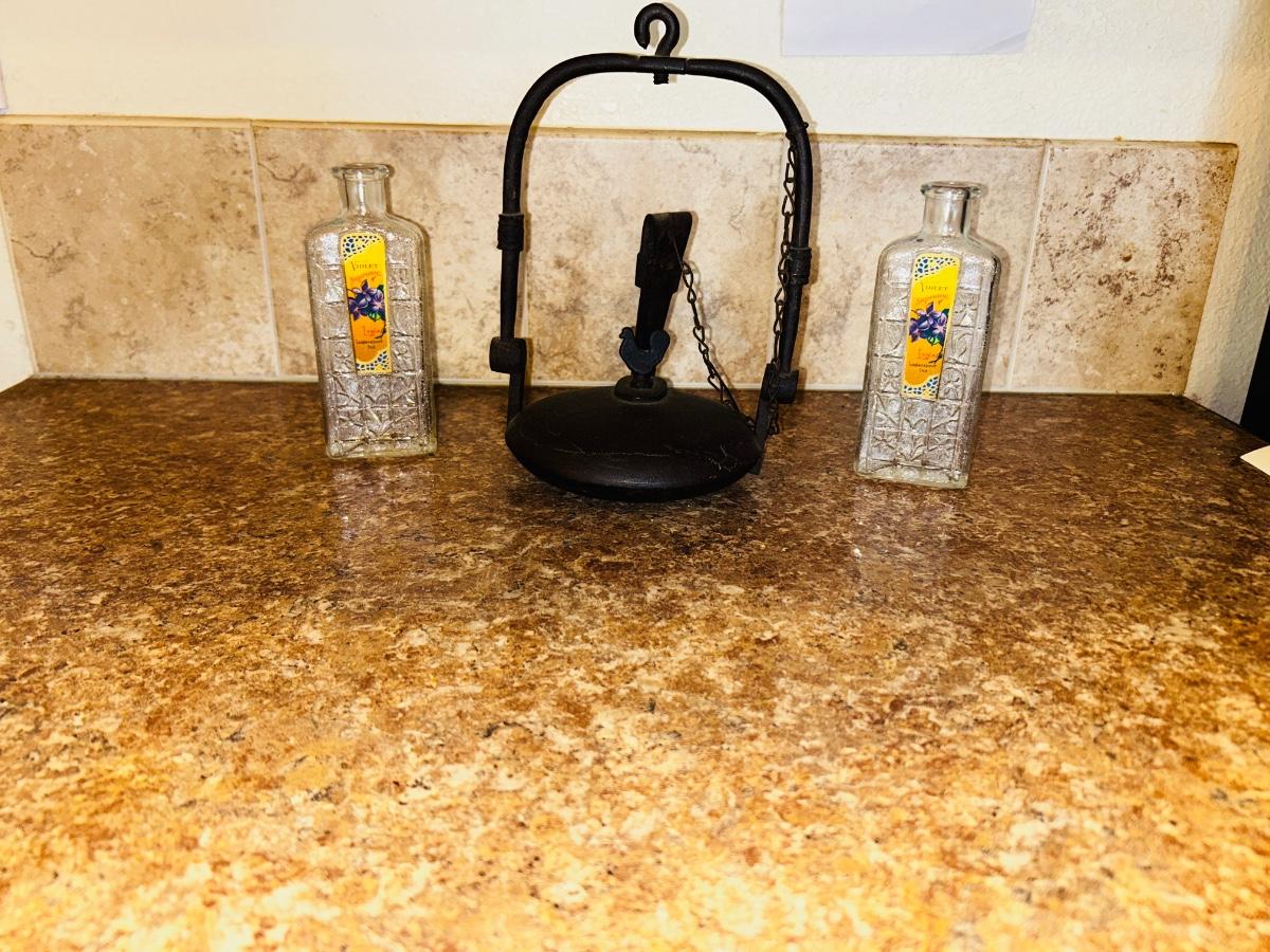 1800’s ANTIQUE FRENCH CAST IRON OIL “BETTY LAMP” AND GLASS BOTTLES