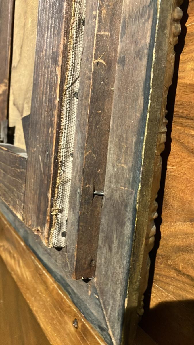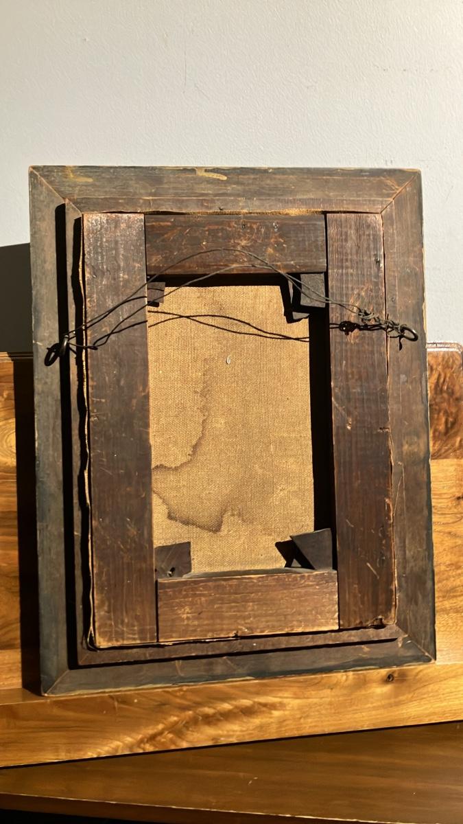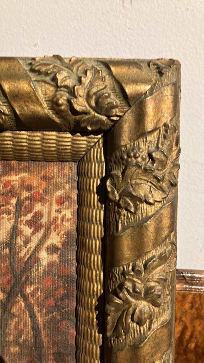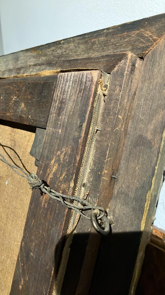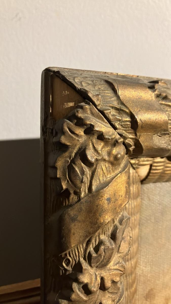 Original ornate giltwood frame with twisted ribbon edges and floral/leaf details—gorgeous gold finish with authentic age patina. Unsigned (as found; hasn't been removed from frame). Oil on canvas, ready to hang.