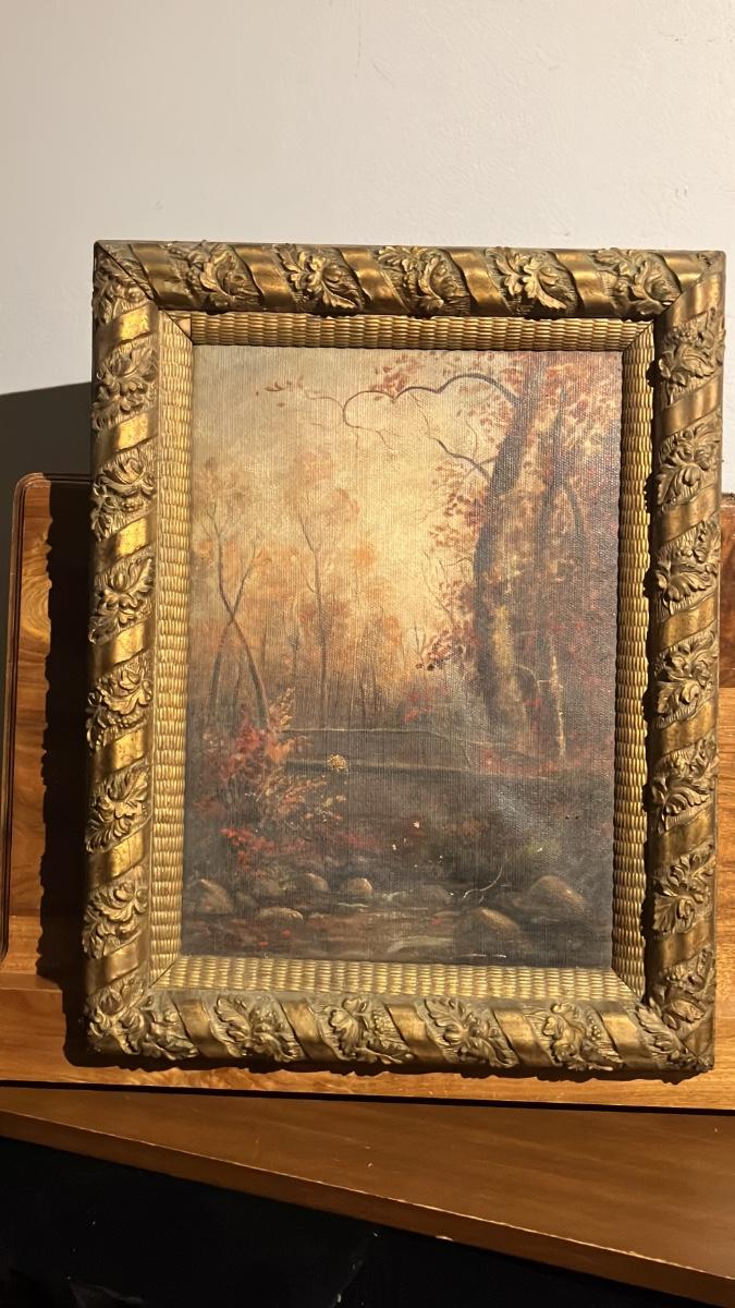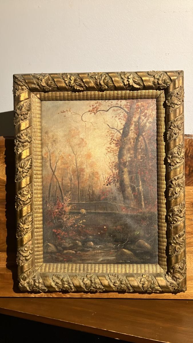 1800s Oil on Canvas Autumn Forest Stream Landscape