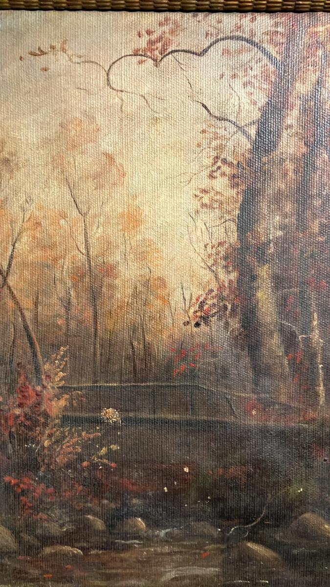 Beautiful antique oil painting from the late 1800s (possibly early 1900s), depicting a tranquil autumn forest scene with a stream, rocks, trees in vibrant fall colors, and a soft glowing sky. Classic Hudson River School-inspired style—romantic, detailed, and atmospheric.