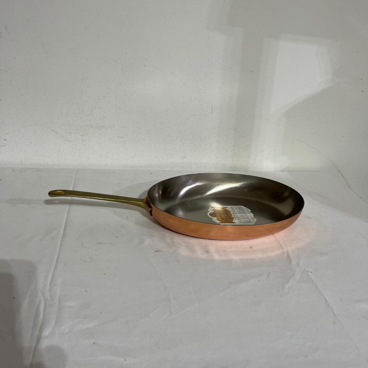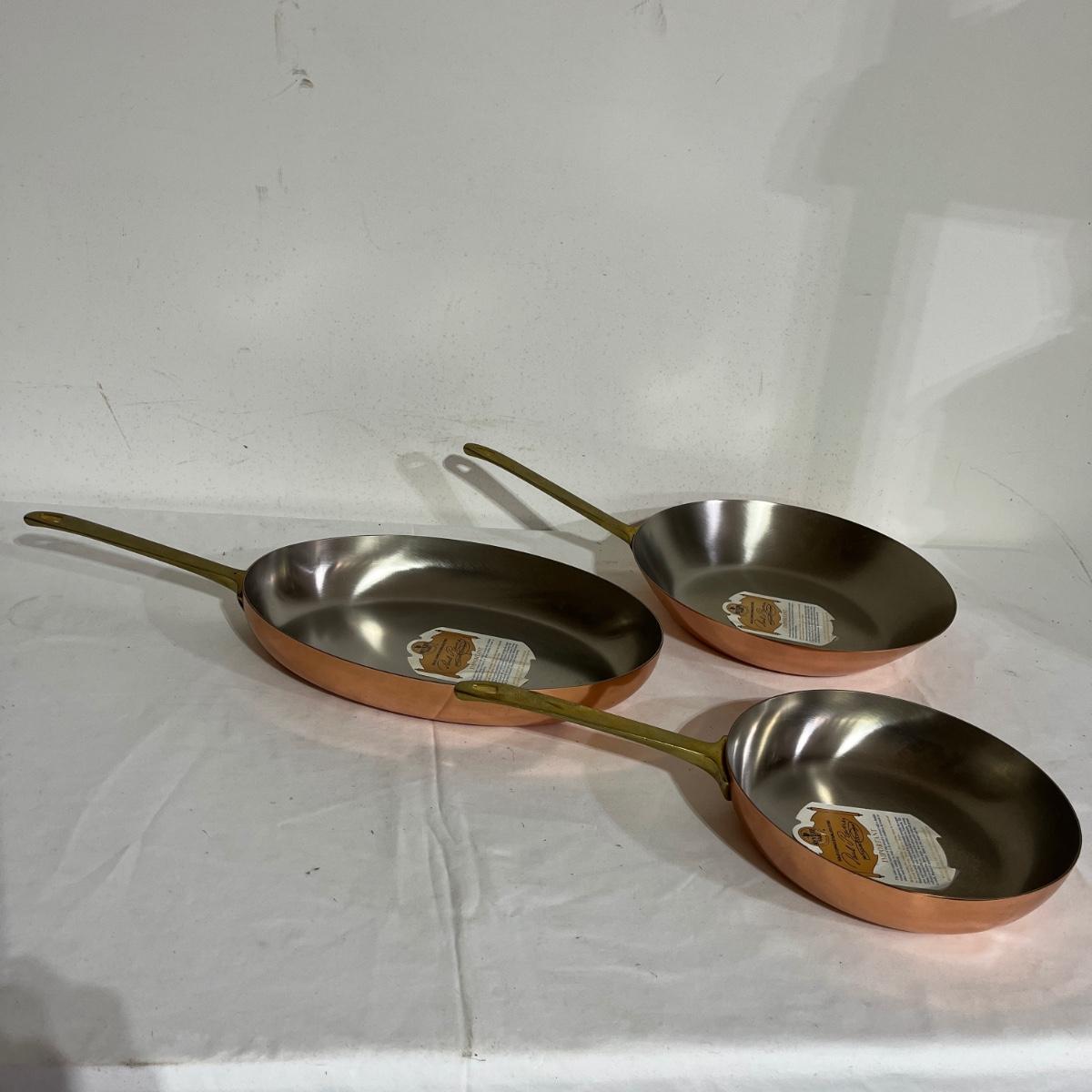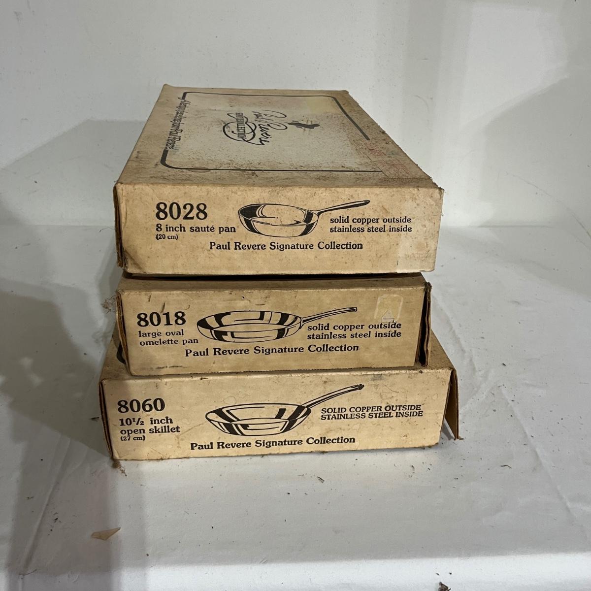 Lot includes a 8” sauté pan, 10.5” open skillet and a large oval omelette pan that measures 12” x 8” x 5”H not counting handle. Items appear new and unused, but boxes are dirty.