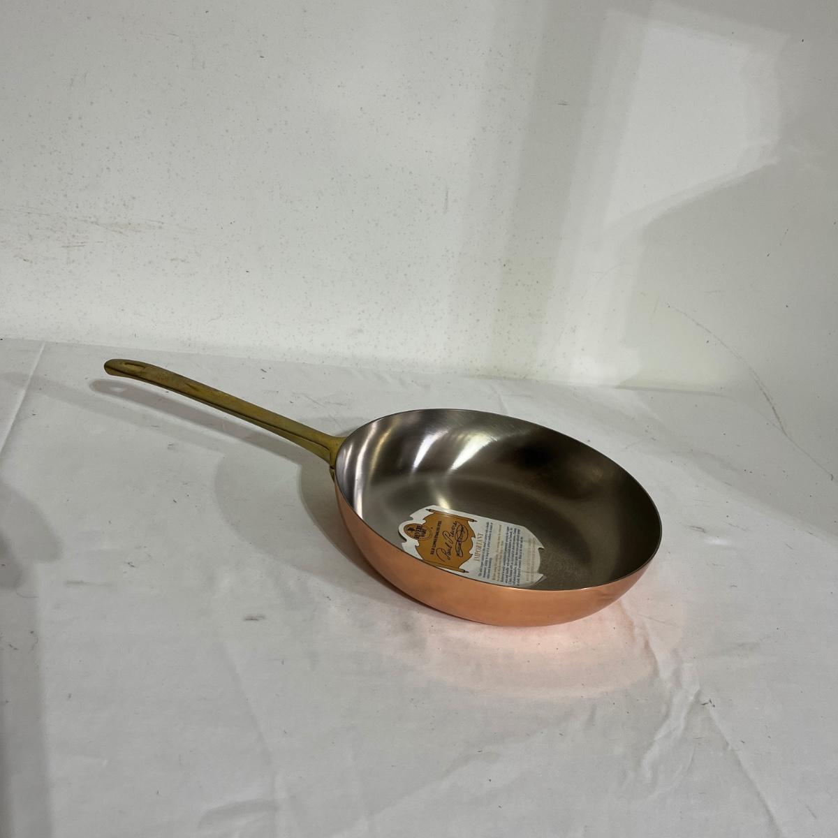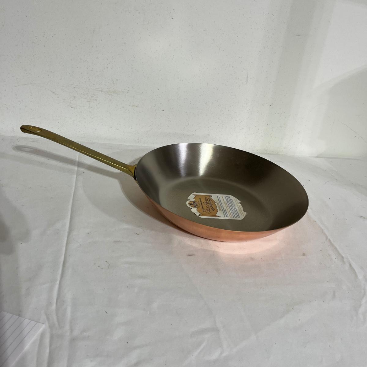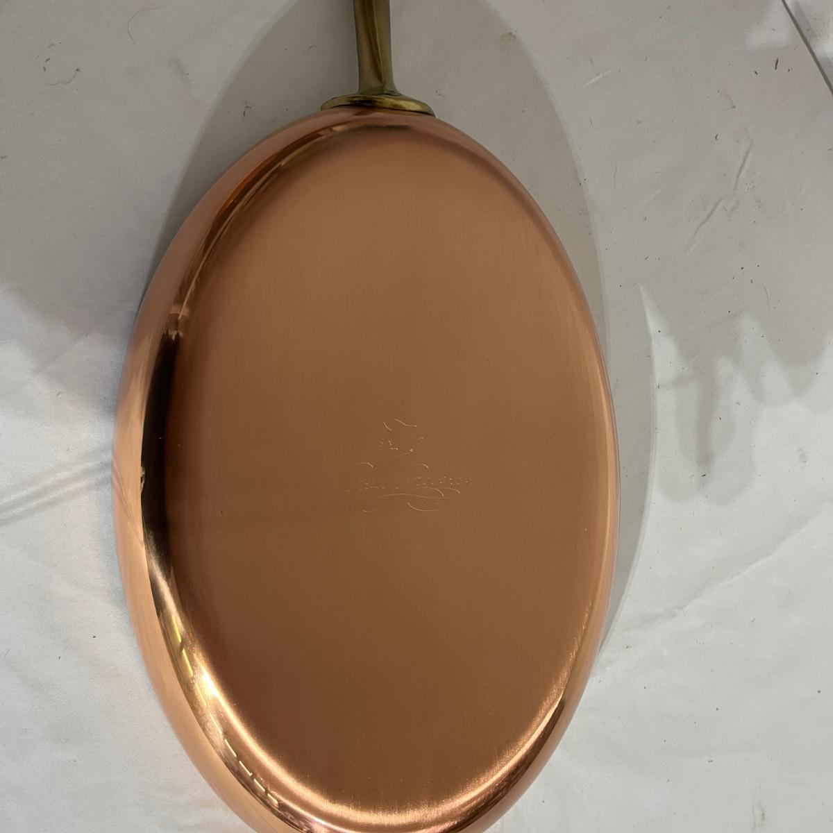 Lot includes a 8” sauté pan, 10.5” open skillet and a large oval omelette pan that measures 12” x 8” x 5”H not counting handle. Items appear new and unused, but boxes are dirty.