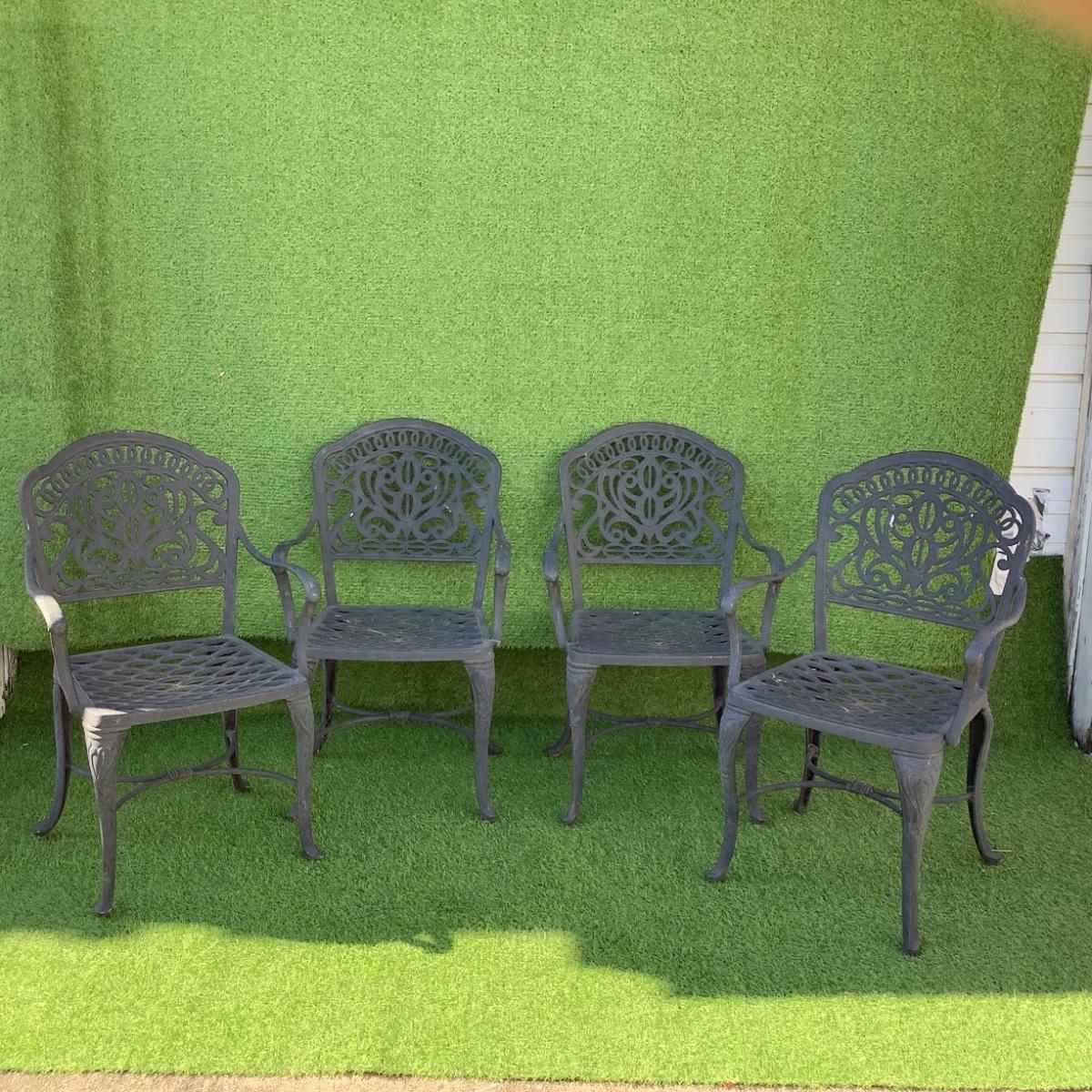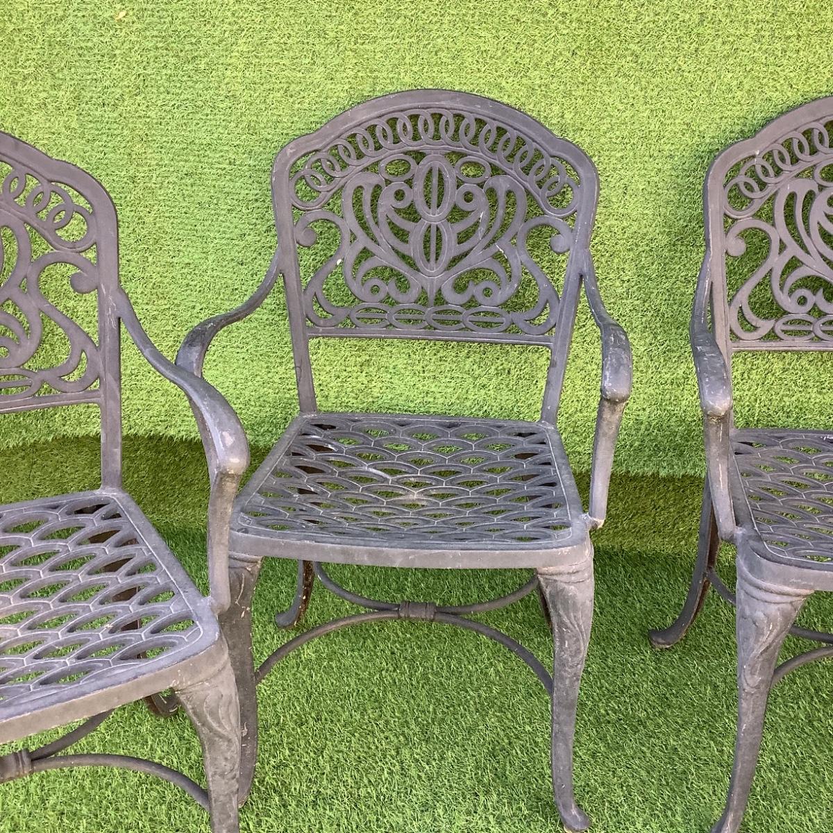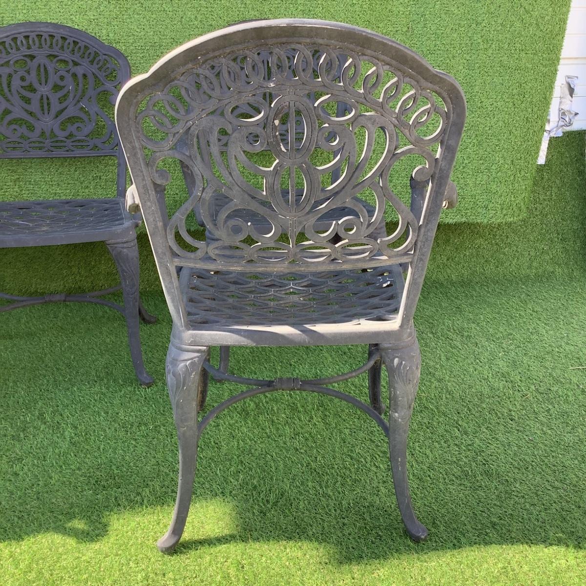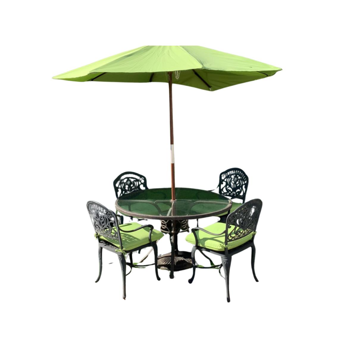 181 Cast Aluminum Outdoor Glass Top Table w/ Matching Chairs and Umbrella