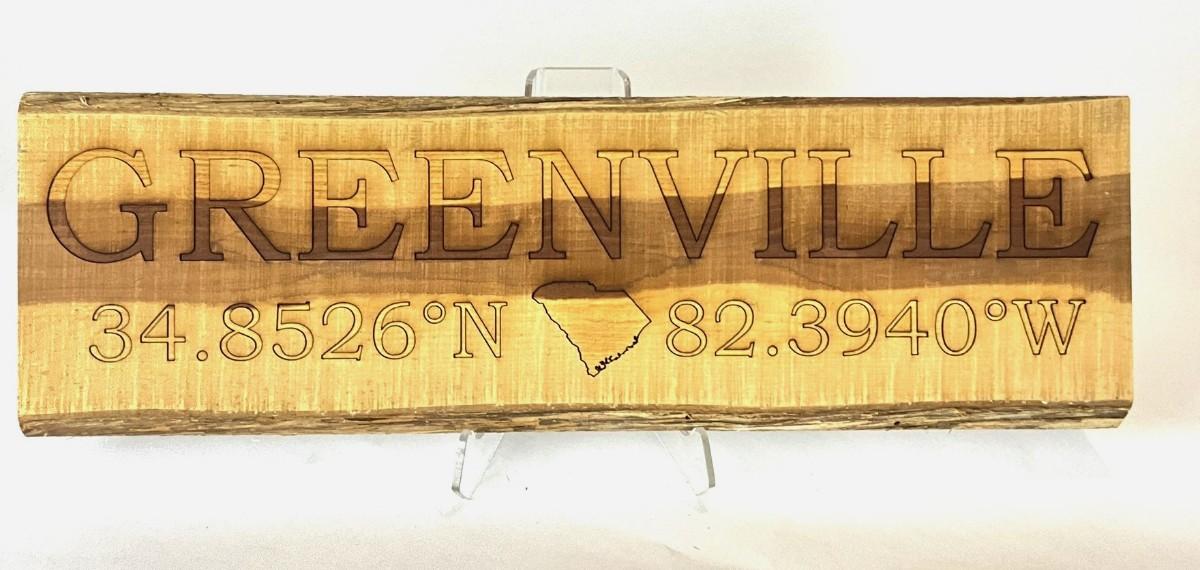 Handcrafted wooden plaque featuring the name "Greenville" along with its coordinates (34.8526°N, 82.3940°W). The engraving also includes an outline of the state of South Carolina, making it a charming decor piece for anyone with a connection to Greenville.