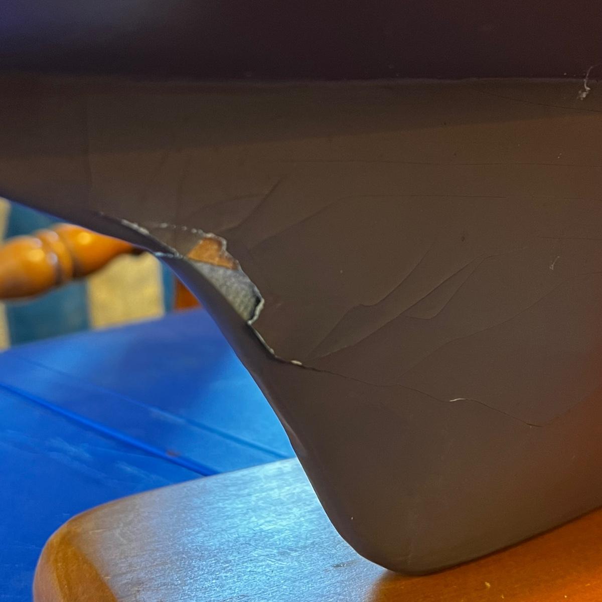 This handcrafted pond yacht is made from timber and features cotton sails. The yacht is in good condition, with the exception of chipped paint on the front of the keel.