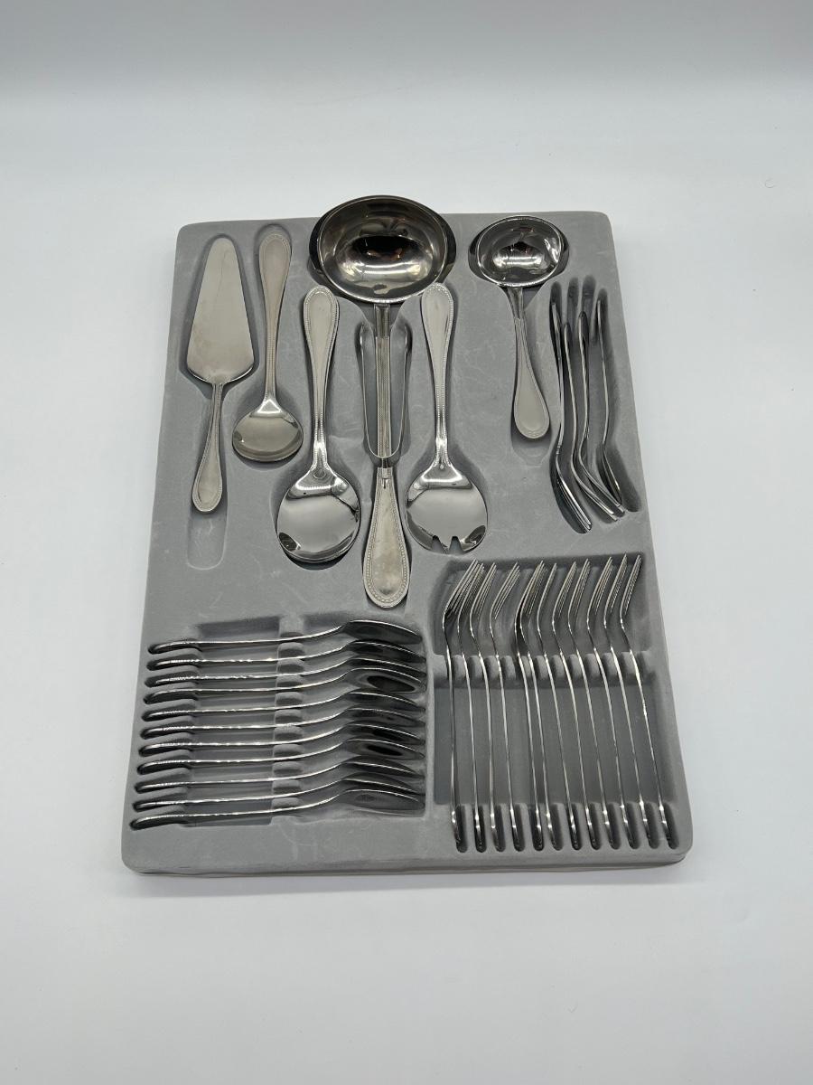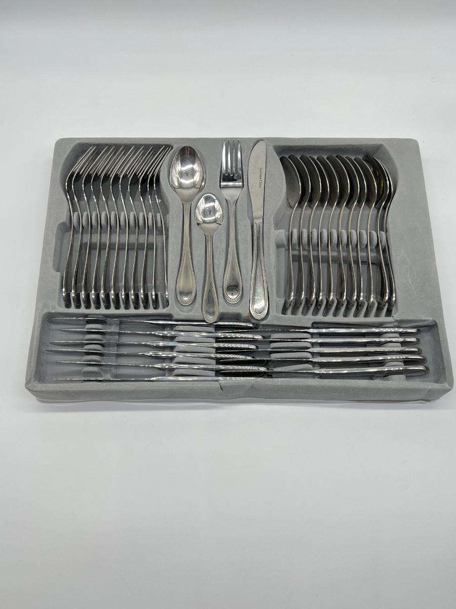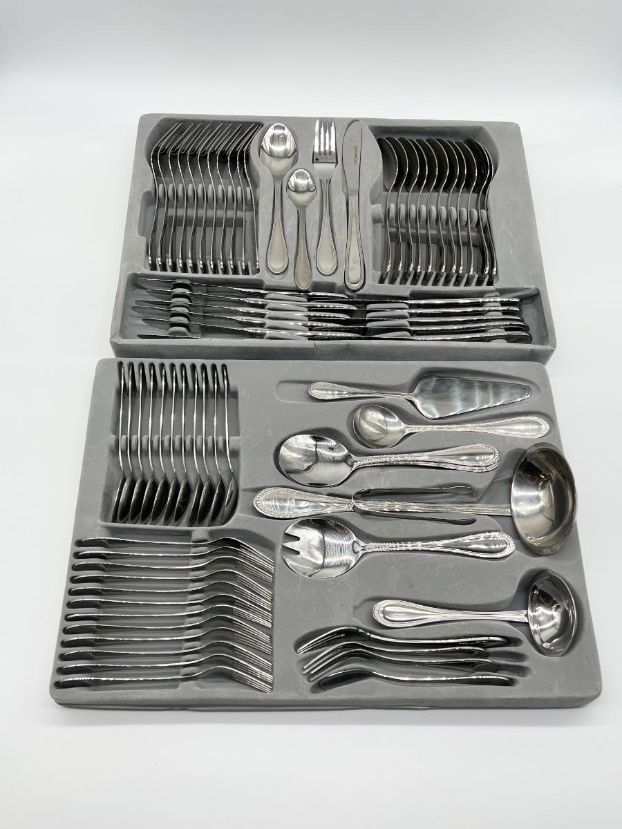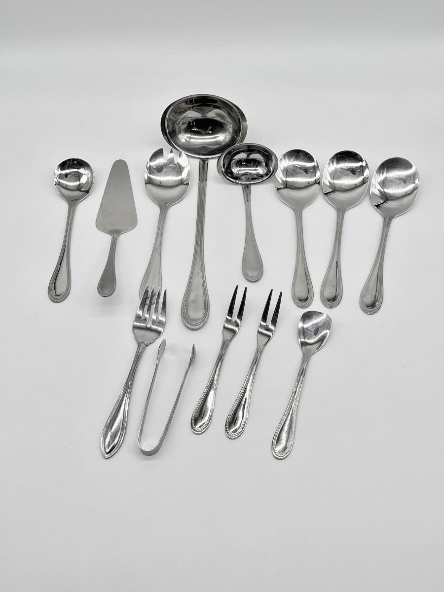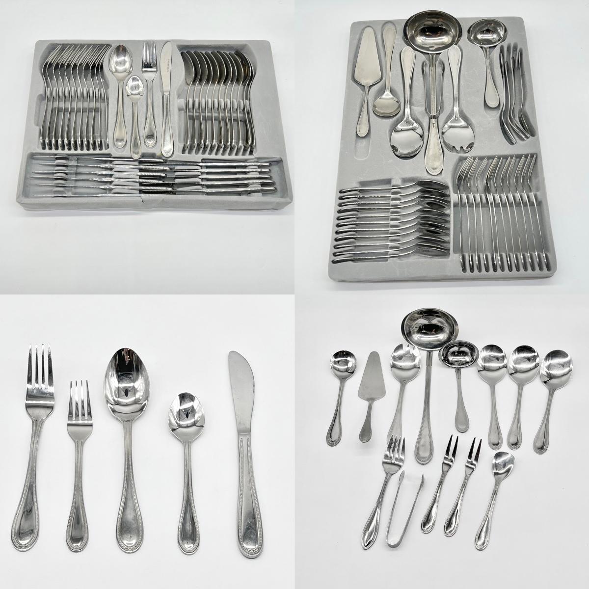 73 pieces total ~ Includes: 12 dinner forks, 12 salad forks, 12 soup spoons, 12 tea spoons, 12 butter knives, & 13 serving pieces, see photos ~ No brand
