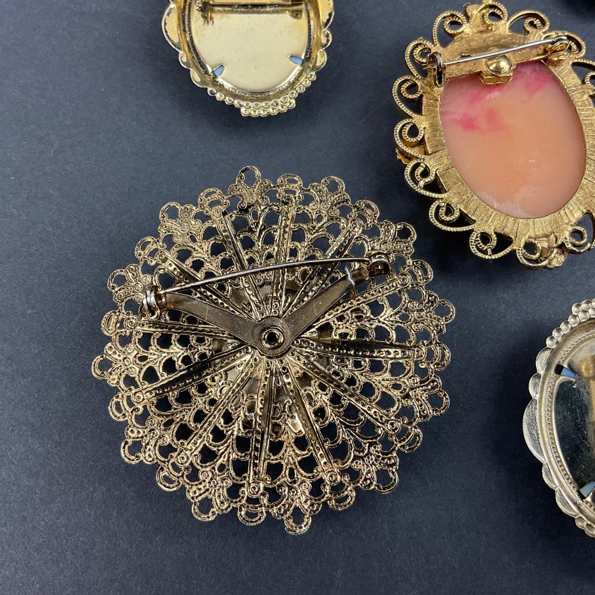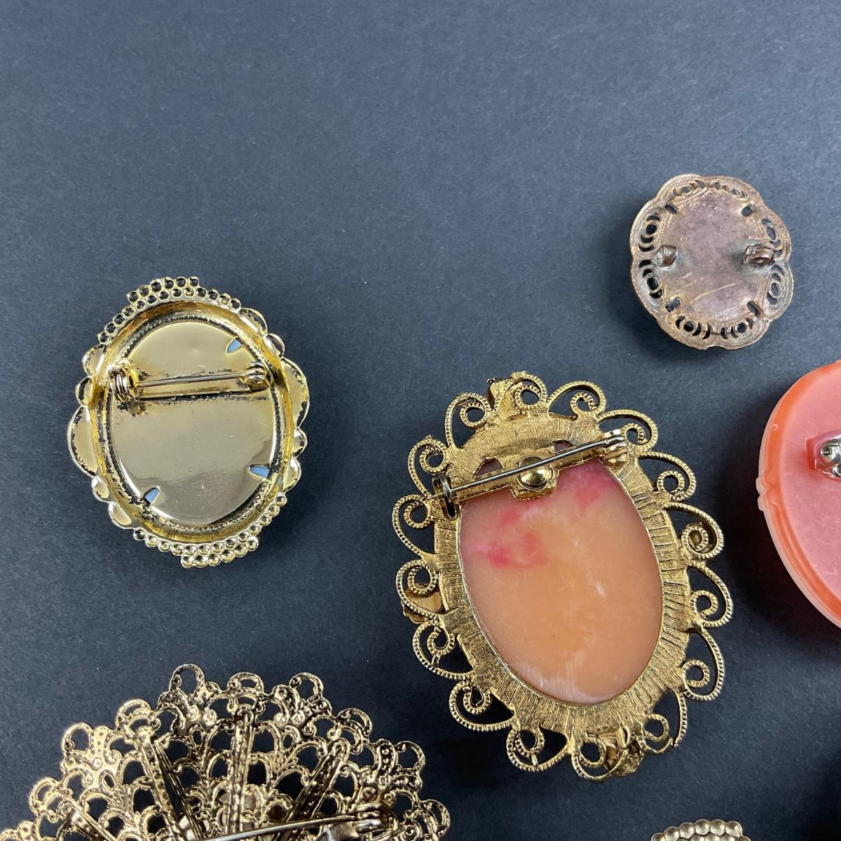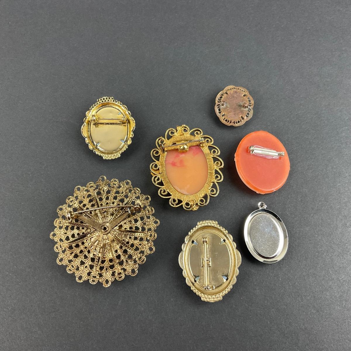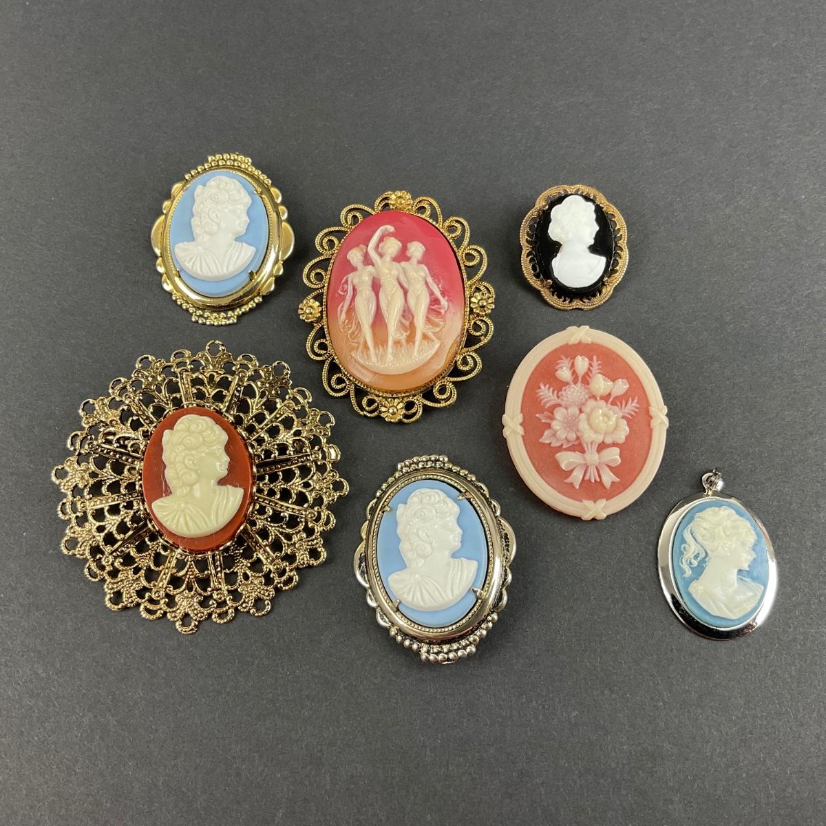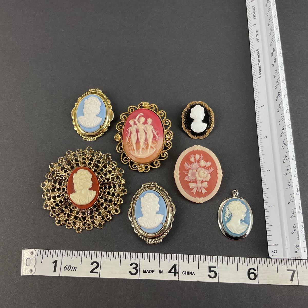 Seven miscellaneous assorted cameos. These pieces have some scuffs, scratches, marks, or slight damage, but otherwise appears to be in great shape. Please see photos for details and condition. Any condition statement is given as a courtesy to a client, is an opinion, and should not be treated as a statement of fact. Reference to condition written, oral or within a condition report shall not be regarded as a full account of condition and may not include all defects, alterations, or restorations. Absence of a condition report does not imply a lot is flawless or lacking imperfections or damage. Katherine’s Auction & Appraisal Service shall have no responsibility for any error or omission. Returns shall not be accepted on the basis of condition. ::: Shipping is available on this lot. If you require shipping you must let us know at the close of the auction. We will coordinate with you after the item has been won. Shipping fees will include insurance up to or exceeding the value of all items being mailed. If you have any questions regarding this lot please contact the auctioneer either via this website, by direct email or by phone. PICK UP TIMES and other important information can be found in the TERMS and DESCRIPTION of the auction. Please take a look for pertinent information. Thanks!