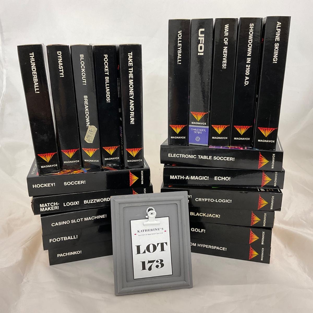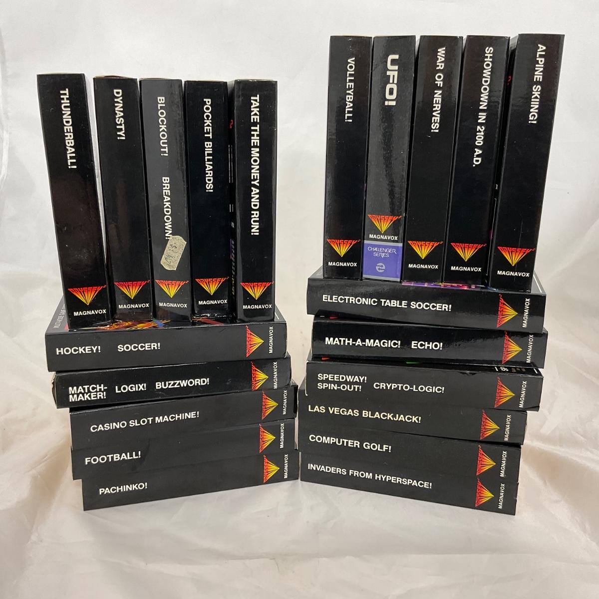 Over 20 Magnavox Odyssey 2 video games in box with booklets. Believed to be in working order however not guaranteed. Please see photos for details and condition. ::: Shipping is available on this lot. If you require shipping you must let us know at the close of the auction. We will coordinate with you after the item has been won. Shipping fees will include insurance up to or exceeding the value of all items being mailed. If you have any questions regarding this lot please contact the auctioneer either via this website, by direct email or by phone. PICK UP TIMES and other important information can be found in the TERMS and DESCRIPTION of the auction. Please take a look for pertinent information. Thanks!