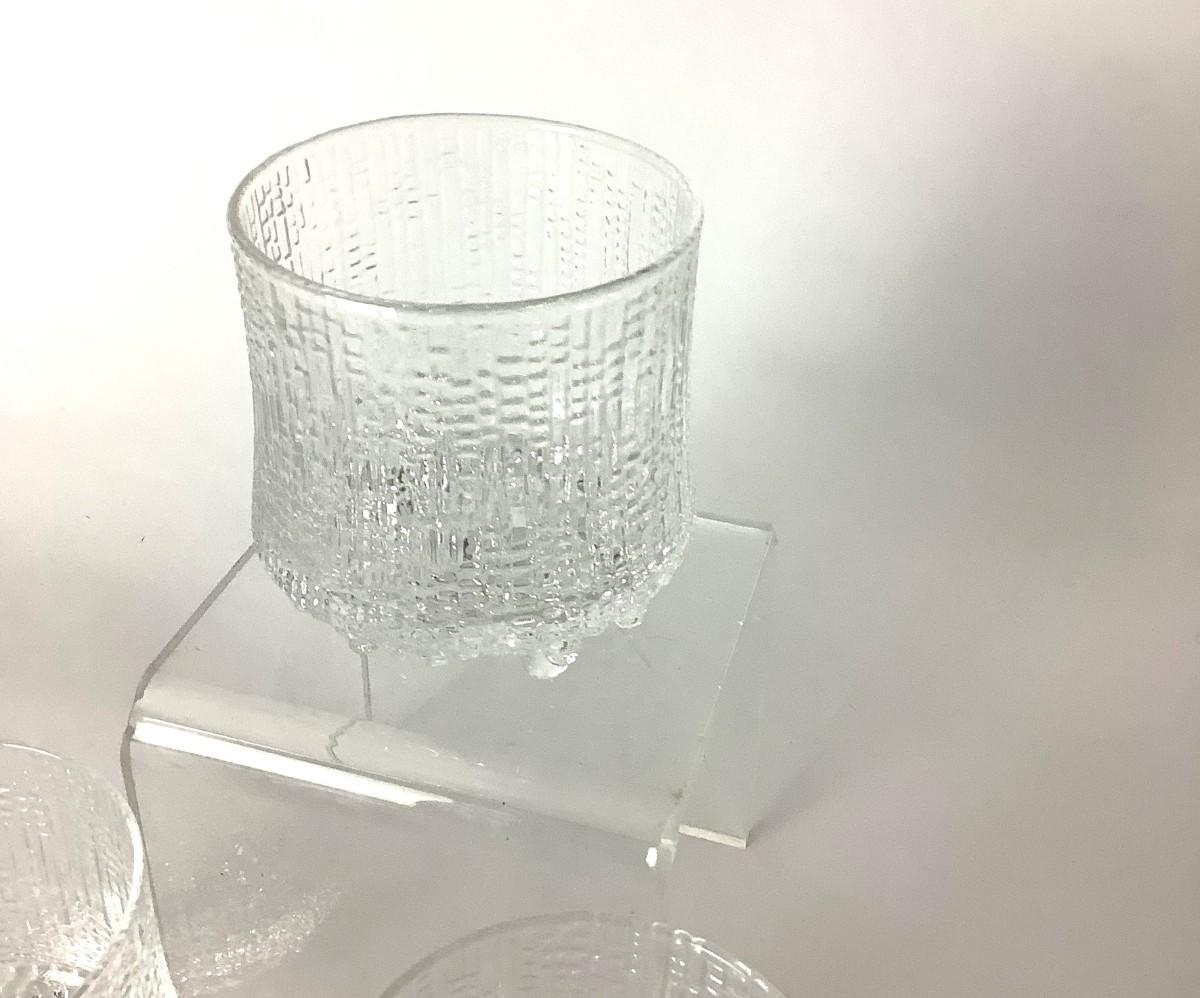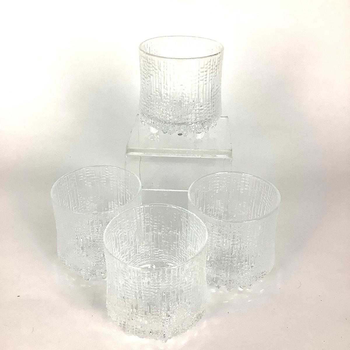 Elegant set of 4 "Old Fashioned" vintage glass tumblers, each with a capacity of 6 3/4 ounces, featuring a unique textured pattern. These glasses are perfect for serving your favorite beverages, adding a touch of vintage charm to your kitchen or bar collection. The intricate design provides an easy grip while enhancing the overall visual appeal.