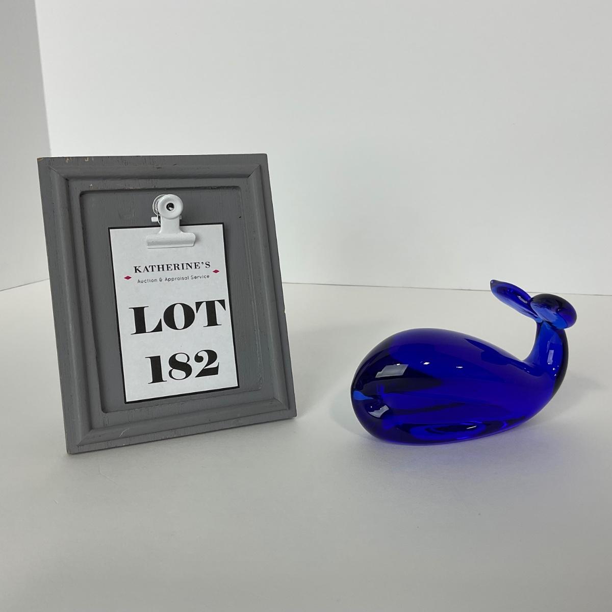 One believed to be Pilgrim or Viking blue glass whale paperweight. 2 1/2 inches tall by 4 inches wide. This piece has no damage, and appears to be in great shape with no visable chips, cracks, or broken pieces. Please see photos for details and condition. Any condition statement is given as a courtesy to a client, is an opinion, and should not be treated as a statement of fact. Reference to condition written, oral or within a condition report shall not be regarded as a full account of condition and may not include all defects, alterations, or restorations. Absence of a condition report does not imply a lot is flawless or lacking imperfections or damage. Katherine’s Auction & Appraisal Service shall have no responsibility for any error or omission. Returns shall not be accepted on the basis of condition. ::: Shipping is available on this lot. If you require shipping you must let us know at the close of the auction. We will coordinate with you after the item has been won. Shipping fees will include insurance up to or exceeding the value of all items being mailed. If you have any questions regarding this lot please contact the auctioneer either via this website, by direct email or by phone. PICK UP TIMES and other important information can be found in the TERMS and DESCRIPTION of the auction. Please take a look for pertinent information. Thanks!