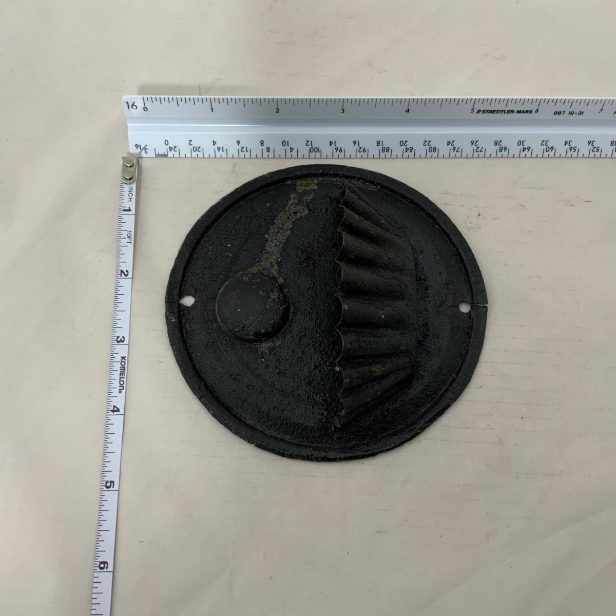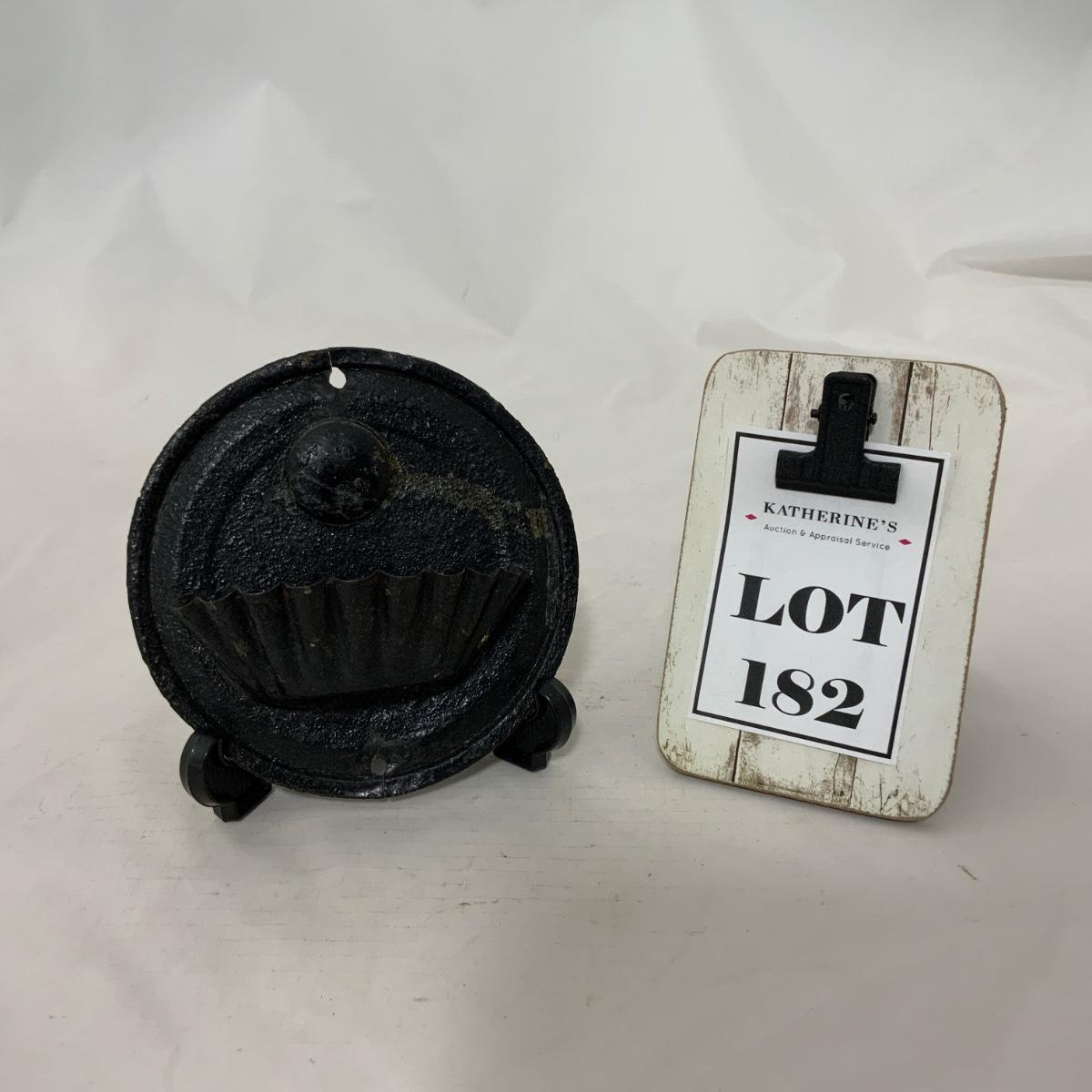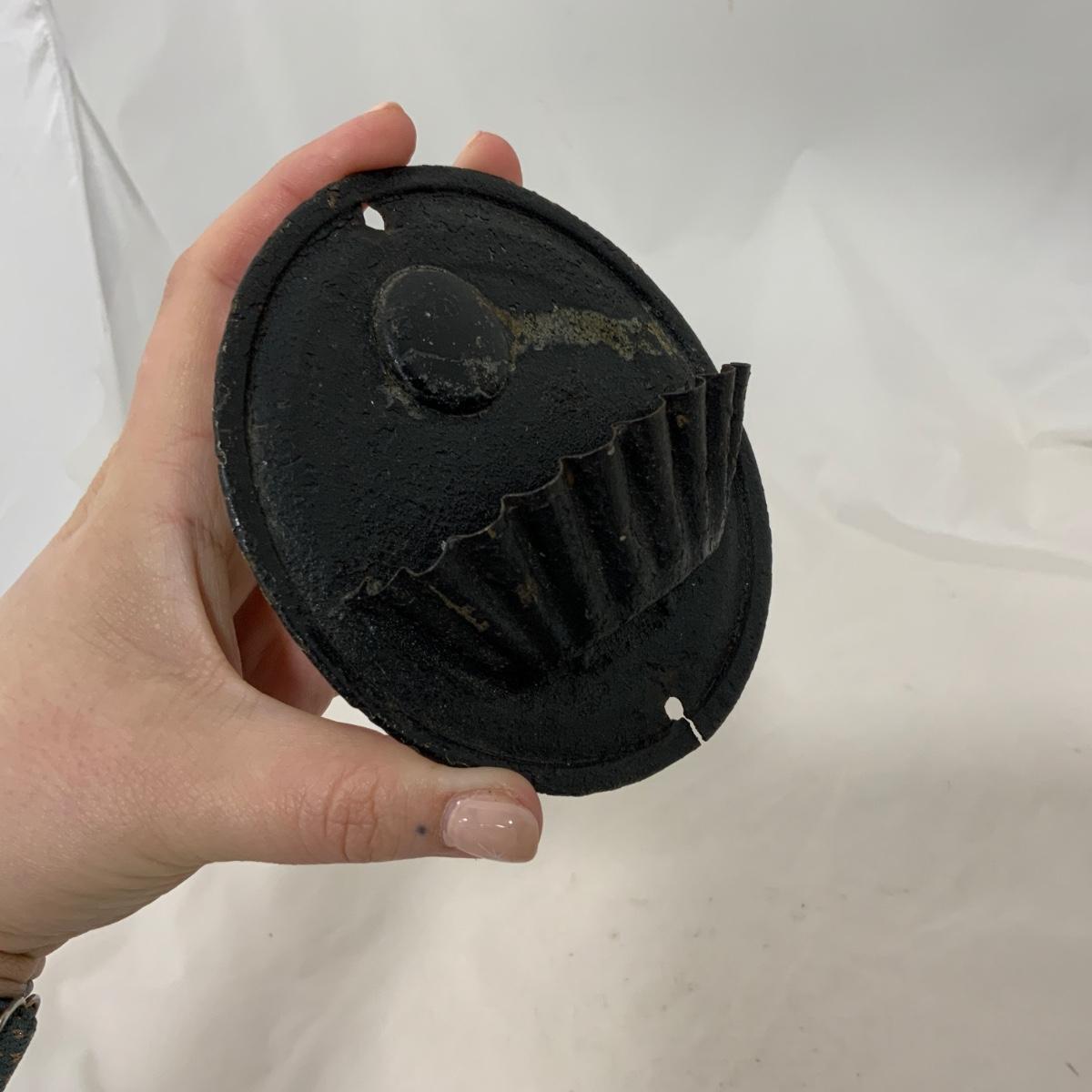 Unique Tin Wall Match Safe. It looks like they used a cupcake mold to make the holder. How resourceful! The holes at the top and the bottom have broken over the years, as you may be able to see. I think if you were to use both of them with a nail with a larger head, you shouldn’t have any issues with it. Please see photos for details and condition. ::: Shipping is available on this lot. If you require shipping you must let us know at the close of the auction. We will coordinate with you after the item has been won. Shipping fees will include insurance up to or exceeding the value of all items being mailed. If you have any questions regarding this lot please contact the auctioneer either via this website, by direct email or by phone. PICK UP TIMES and other important information can be found in the TERMS and DESCRIPTION of the auction. Please take a look for pertinent information. Thanks!