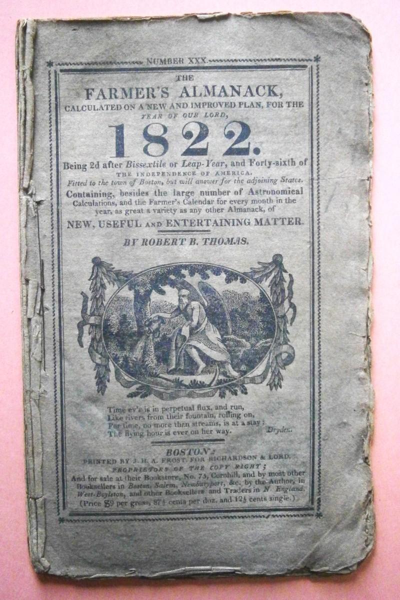 1822 FARMER'S ALMANACK printed in Boston for West & Richardson, 7 1/2 x 4 3/4 in., in rough condition.