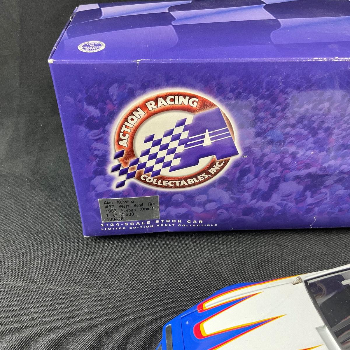 One 1:24 scale Alan Kulwickis #97 2000 die cast model car. Please see photos for details and condition. Any condition statement is given as a courtesy to a client, is an opinion, and should not be treated as a statement of fact. Reference to condition written, oral or within a condition report shall not be regarded as a full account of condition and may not include all defects, alterations, or restorations. Absence of a condition report does not imply a lot is flawless or lacking imperfections or damage. Katherine’s Auction & Appraisal Service shall have no responsibility for any error or omission. Returns shall not be accepted on the basis of condition.