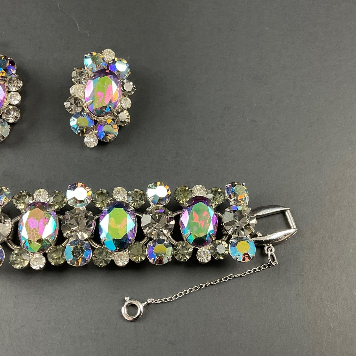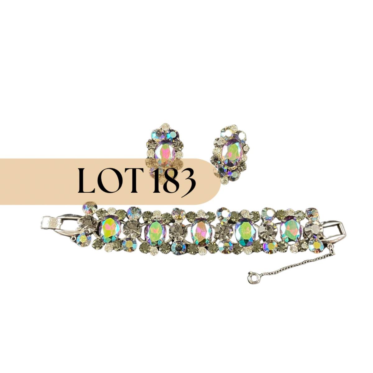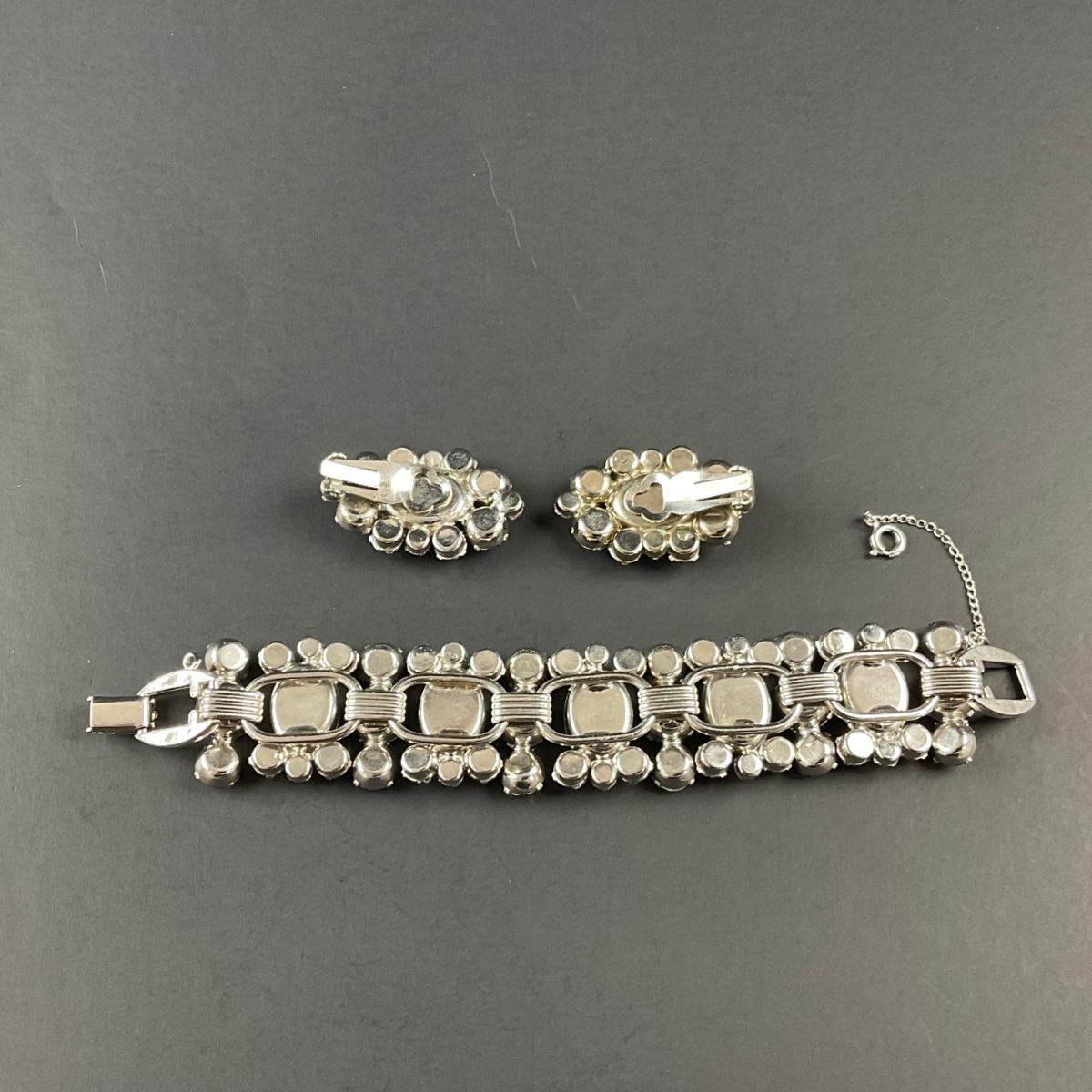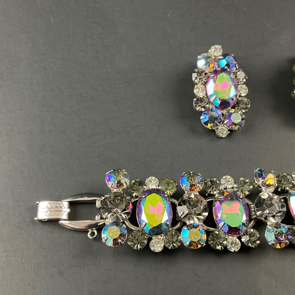 One three piece set of believed to be Juliana D&E Heliotrope grey, lilac, and rhinestone clip earrings and bracelet set however not guaranteed. This piece has no damage, and appears to be in great shape with no visable chips, cracks, or broken pieces. Please see photos for details and condition. Any condition statement is given as a courtesy to a client, is an opinion, and should not be treated as a statement of fact. Reference to condition written, oral or within a condition report shall not be regarded as a full account of condition and may not include all defects, alterations, or restorations. Absence of a condition report does not imply a lot is flawless or lacking imperfections or damage. Katherine’s Auction & Appraisal Service shall have no responsibility for any error or omission. Returns shall not be accepted on the basis of condition. ::: Shipping is available on this lot. If you require shipping you must let us know at the close of the auction. We will coordinate with you after the item has been won. Shipping fees will include insurance up to or exceeding the value of all items being mailed. If you have any questions regarding this lot please contact the auctioneer either via this website, by direct email or by phone. PICK UP TIMES and other important information can be found in the TERMS and DESCRIPTION of the auction. Please take a look for pertinent information. Thanks!