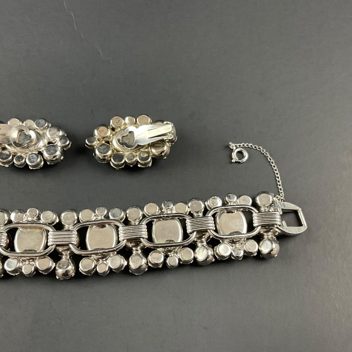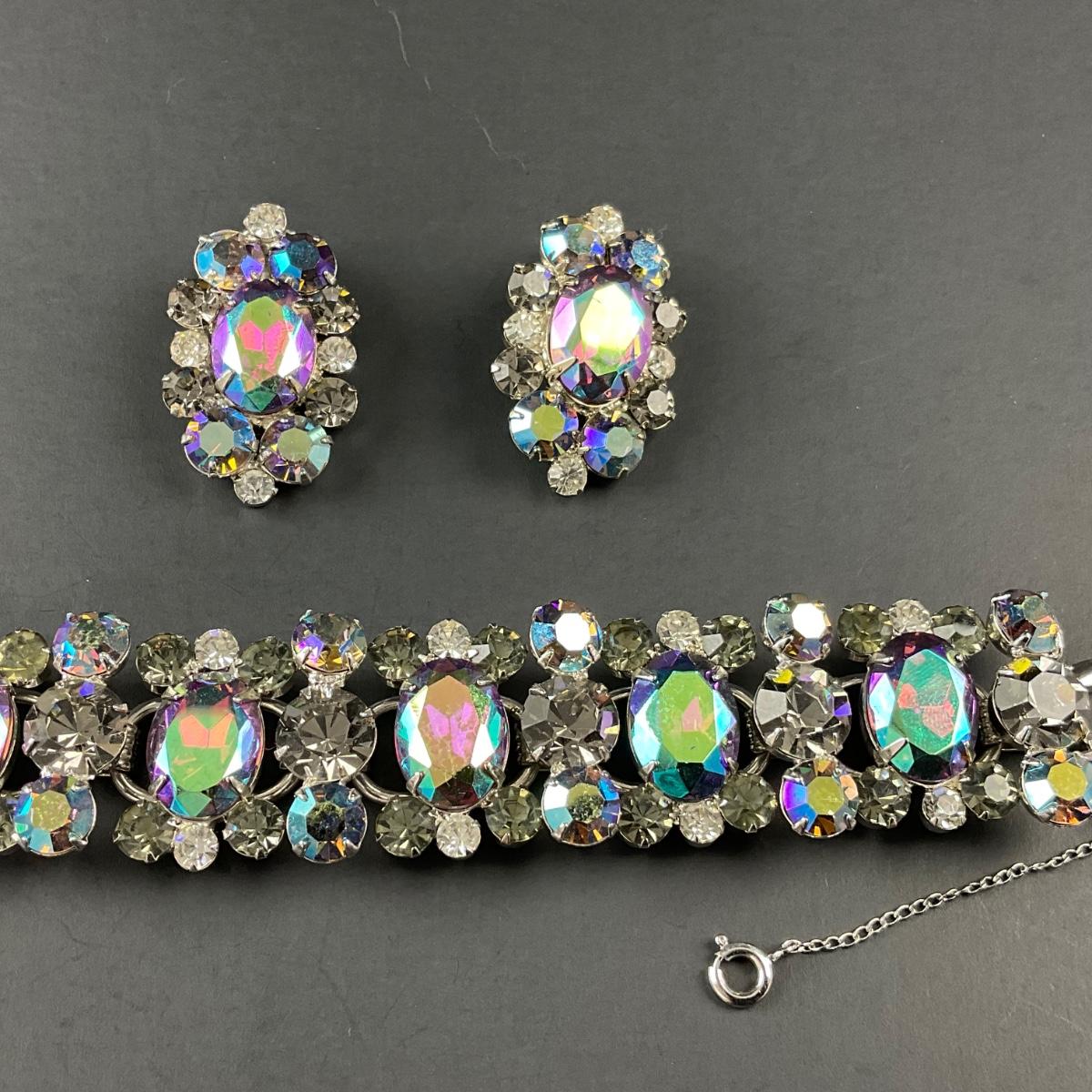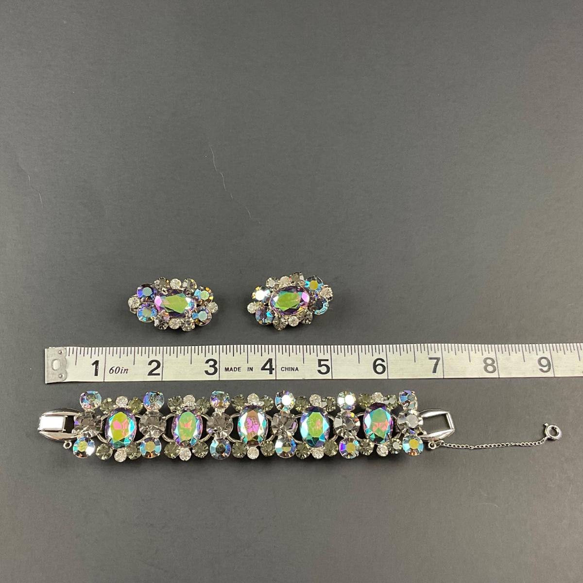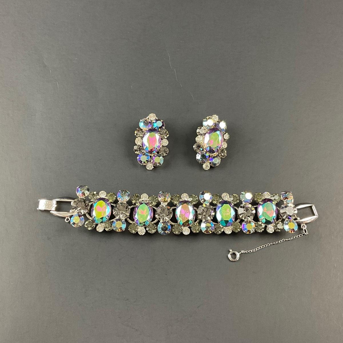 One three piece set of believed to be Juliana D&E Heliotrope grey, lilac, and rhinestone clip earrings and bracelet set however not guaranteed. This piece has no damage, and appears to be in great shape with no visable chips, cracks, or broken pieces. Please see photos for details and condition. Any condition statement is given as a courtesy to a client, is an opinion, and should not be treated as a statement of fact. Reference to condition written, oral or within a condition report shall not be regarded as a full account of condition and may not include all defects, alterations, or restorations. Absence of a condition report does not imply a lot is flawless or lacking imperfections or damage. Katherine’s Auction & Appraisal Service shall have no responsibility for any error or omission. Returns shall not be accepted on the basis of condition. ::: Shipping is available on this lot. If you require shipping you must let us know at the close of the auction. We will coordinate with you after the item has been won. Shipping fees will include insurance up to or exceeding the value of all items being mailed. If you have any questions regarding this lot please contact the auctioneer either via this website, by direct email or by phone. PICK UP TIMES and other important information can be found in the TERMS and DESCRIPTION of the auction. Please take a look for pertinent information. Thanks!