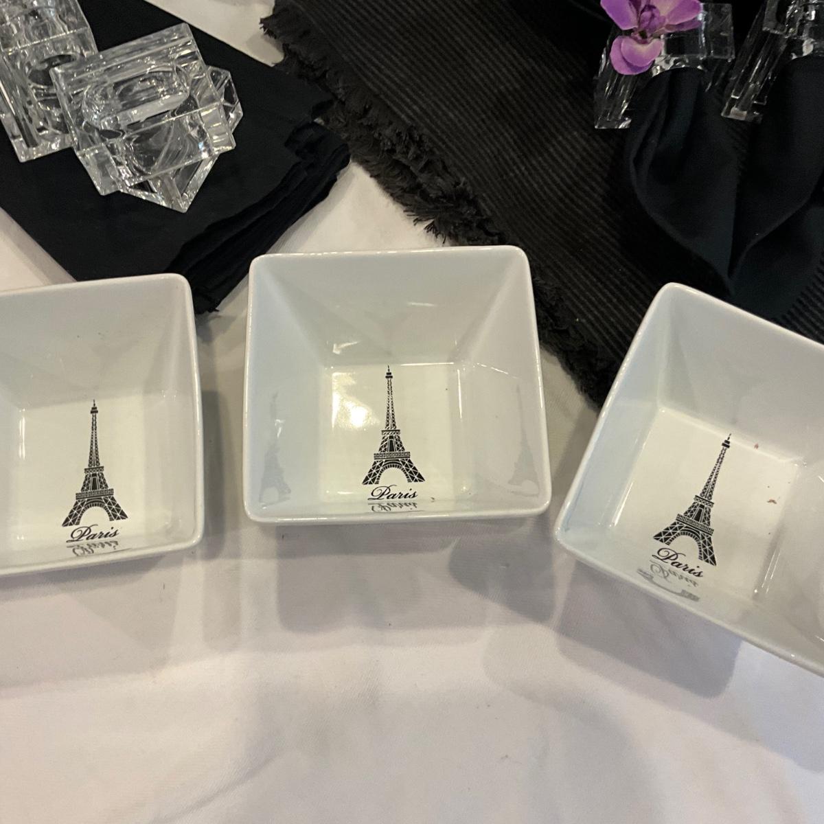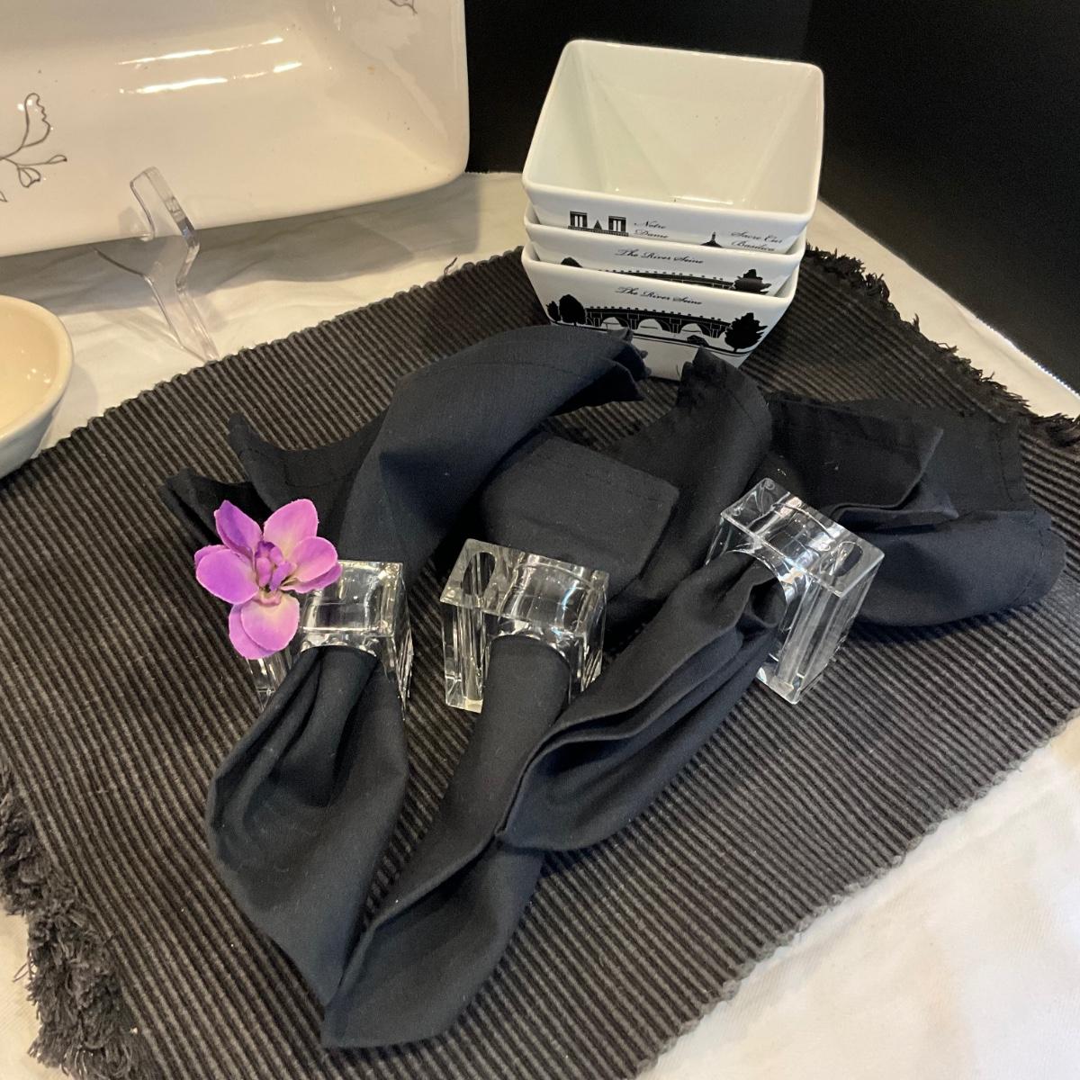 Three square paris pottery bowls with acrylic flower vase napkin rings with black placemats and napkins