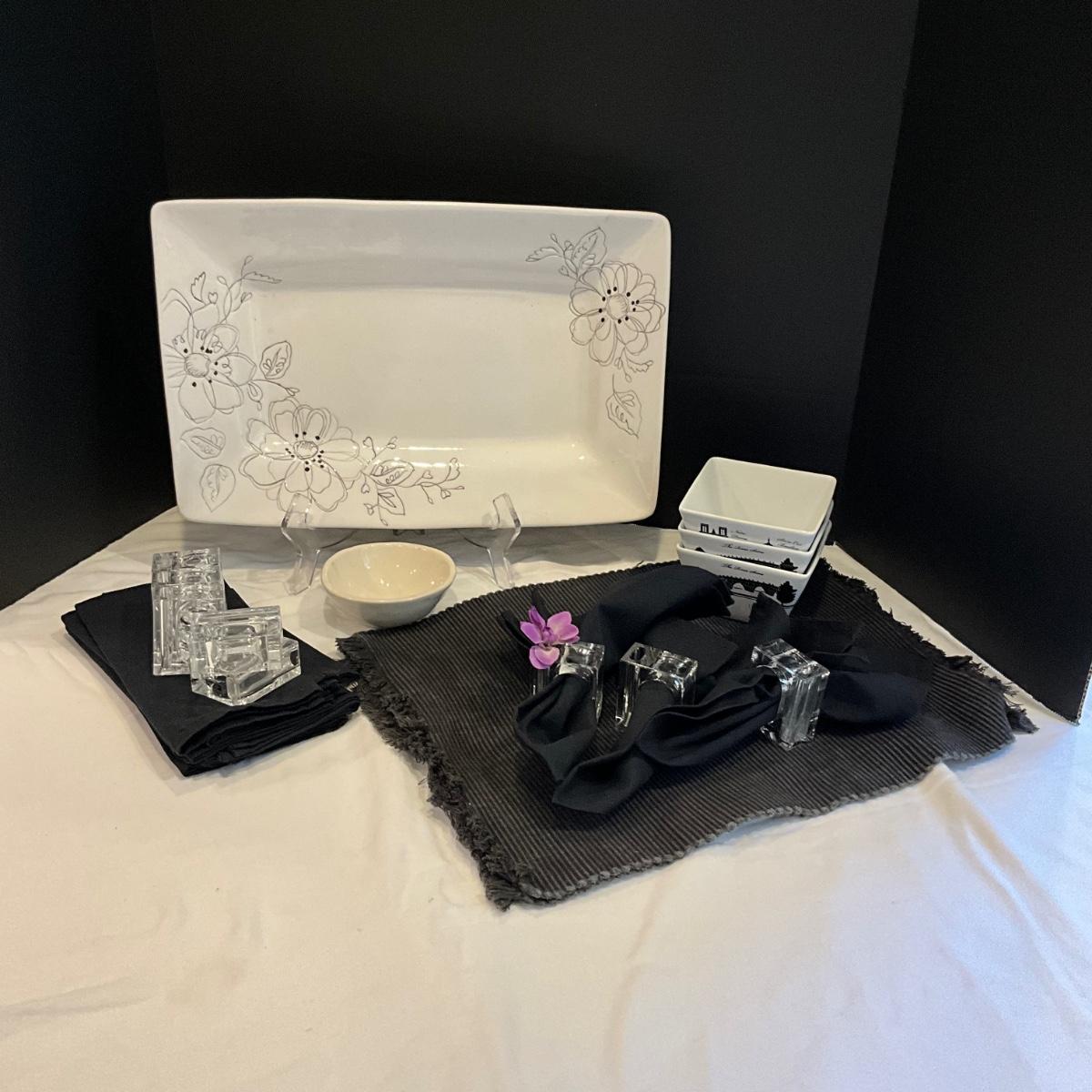 183 Lot of Black and White China with Acrylic Flower Vase Napkin Rings and Linens