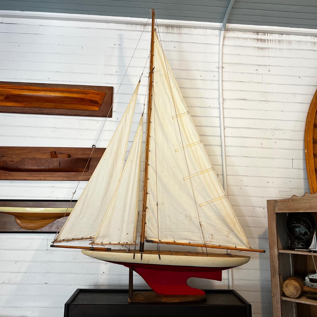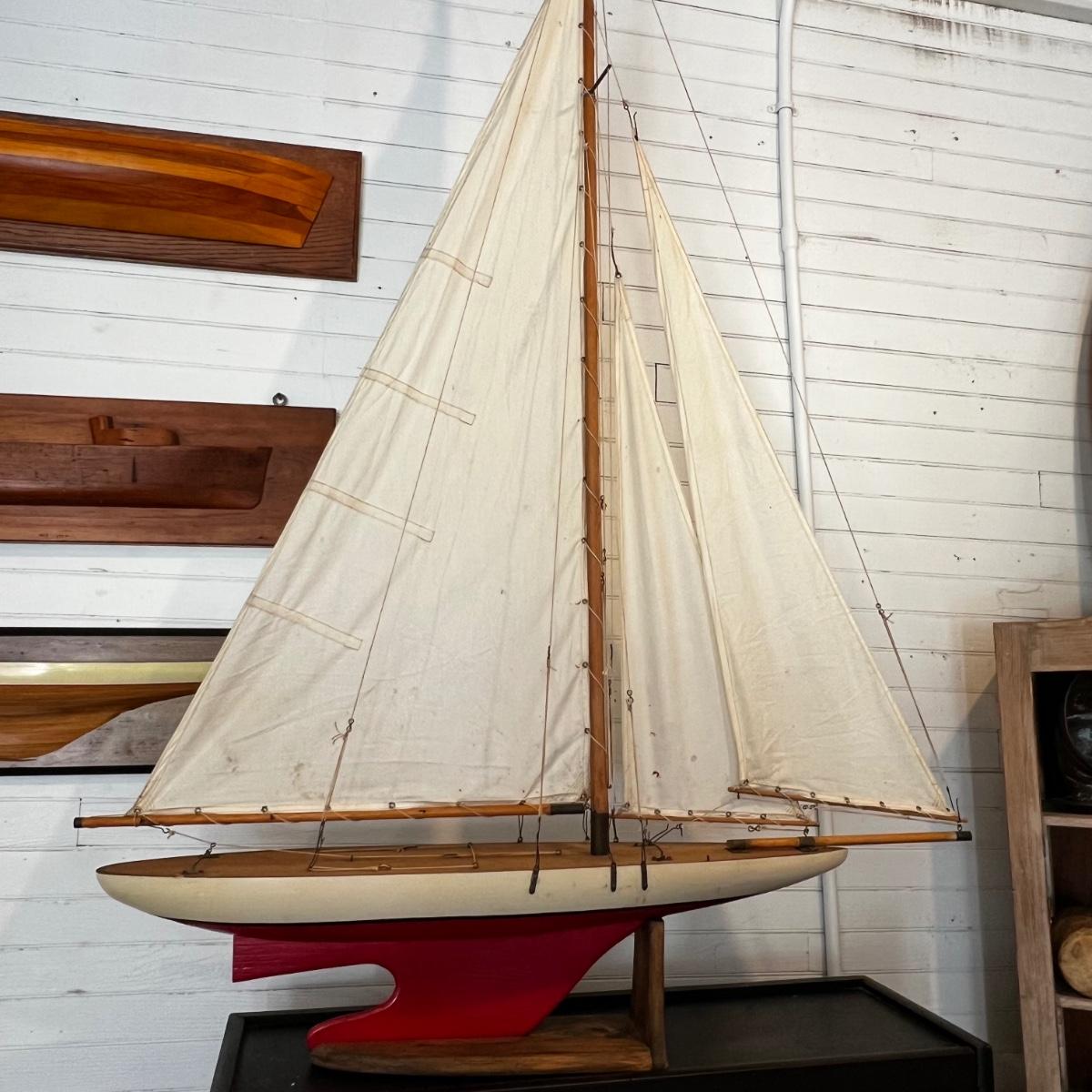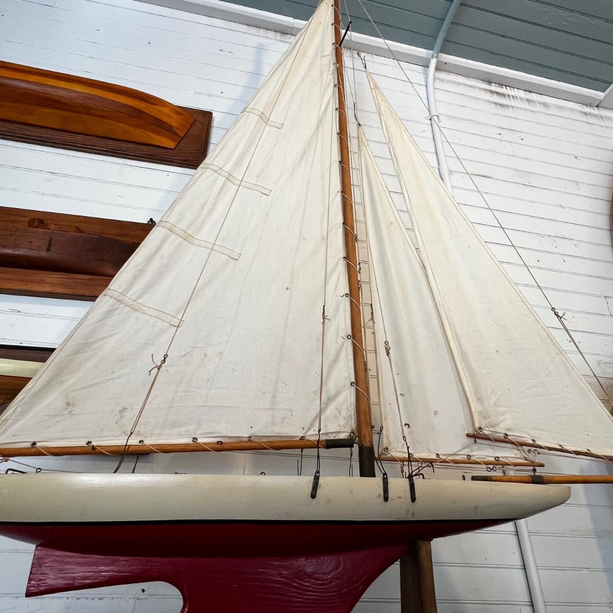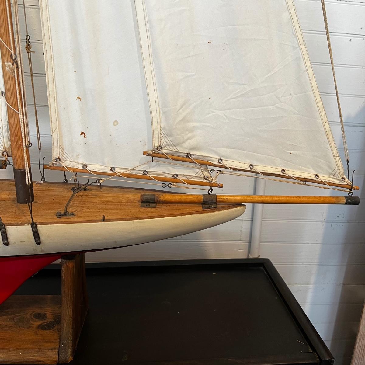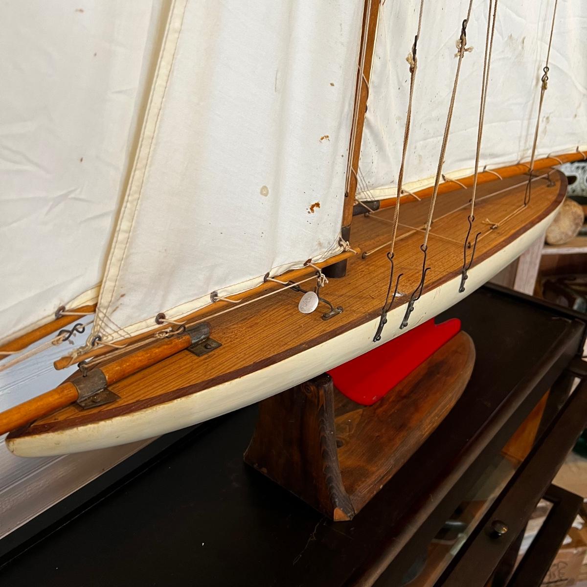 This sailboat model is in good condition and features cotton sails. The sails have slight foxing and stain spots on the bottom. All strings are attached.