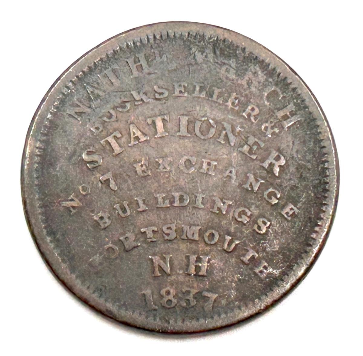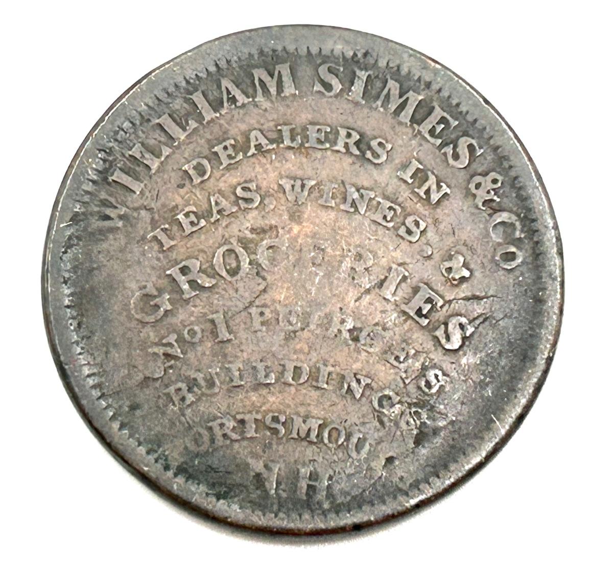 This is a very interesting token. On one side it says Nathaniel March Bookseller and Stationer No. 7 Exchange Building S. On the other side it says Williams Simes & Co. Dealers in Teas, Wines and Groceries.