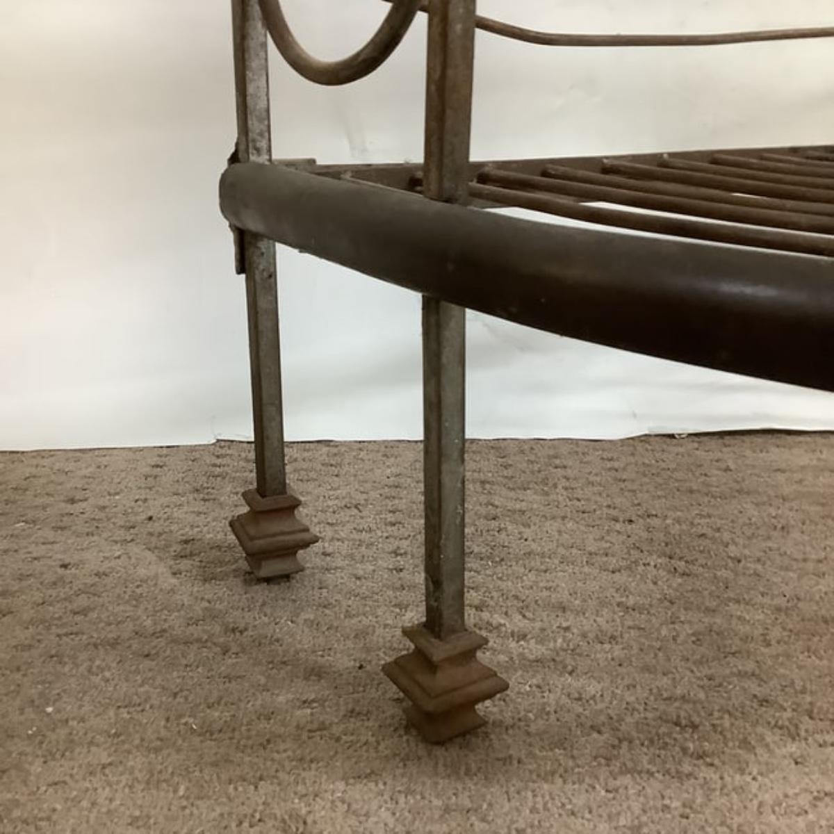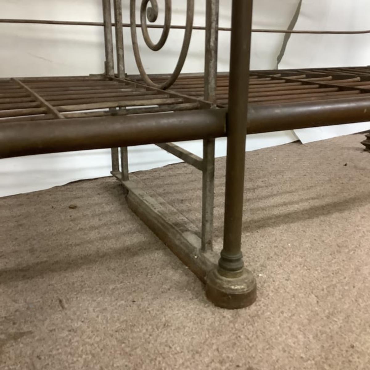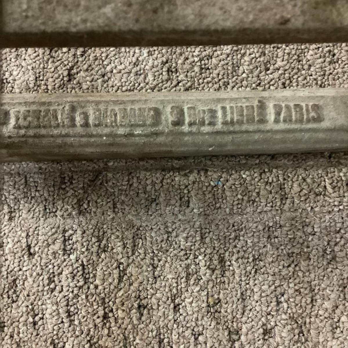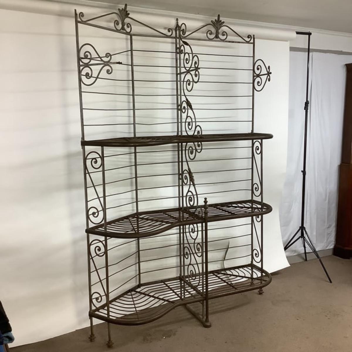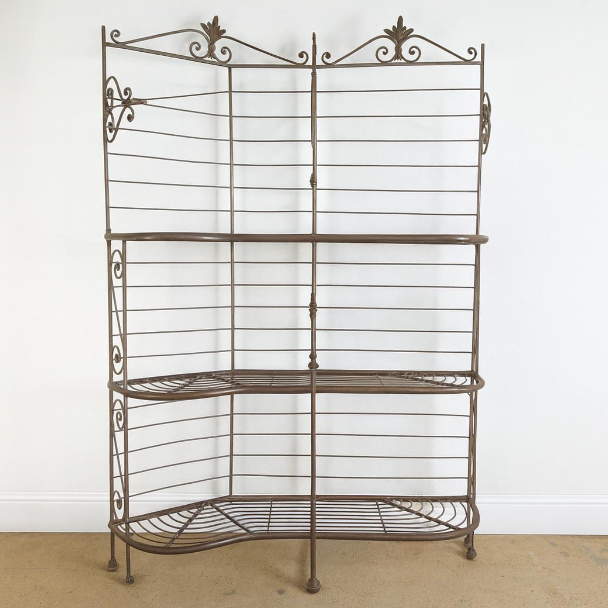 This solid French bakers rack by dated from circa 1890-1910 is made of iron and wrapped in unlaquered brass trim by Echalie and Biabaud, Paris embossed on the cast iron feet. Scroll iron decor, sheaves of wheat adorn the top. The left side of this rack slightly bends at about a 45degrees angle making this rack rarer than most! The shelves sit on welded slats so it’s easy to remove the shelves if needed, shelves measure 18" in depth. At the top center of the iron decor there is a brass fitting missing.