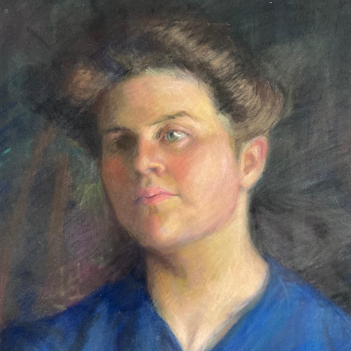 086 American School, Pastel Portrait Of Woman With Dark Blue Dress Circa 20th Century