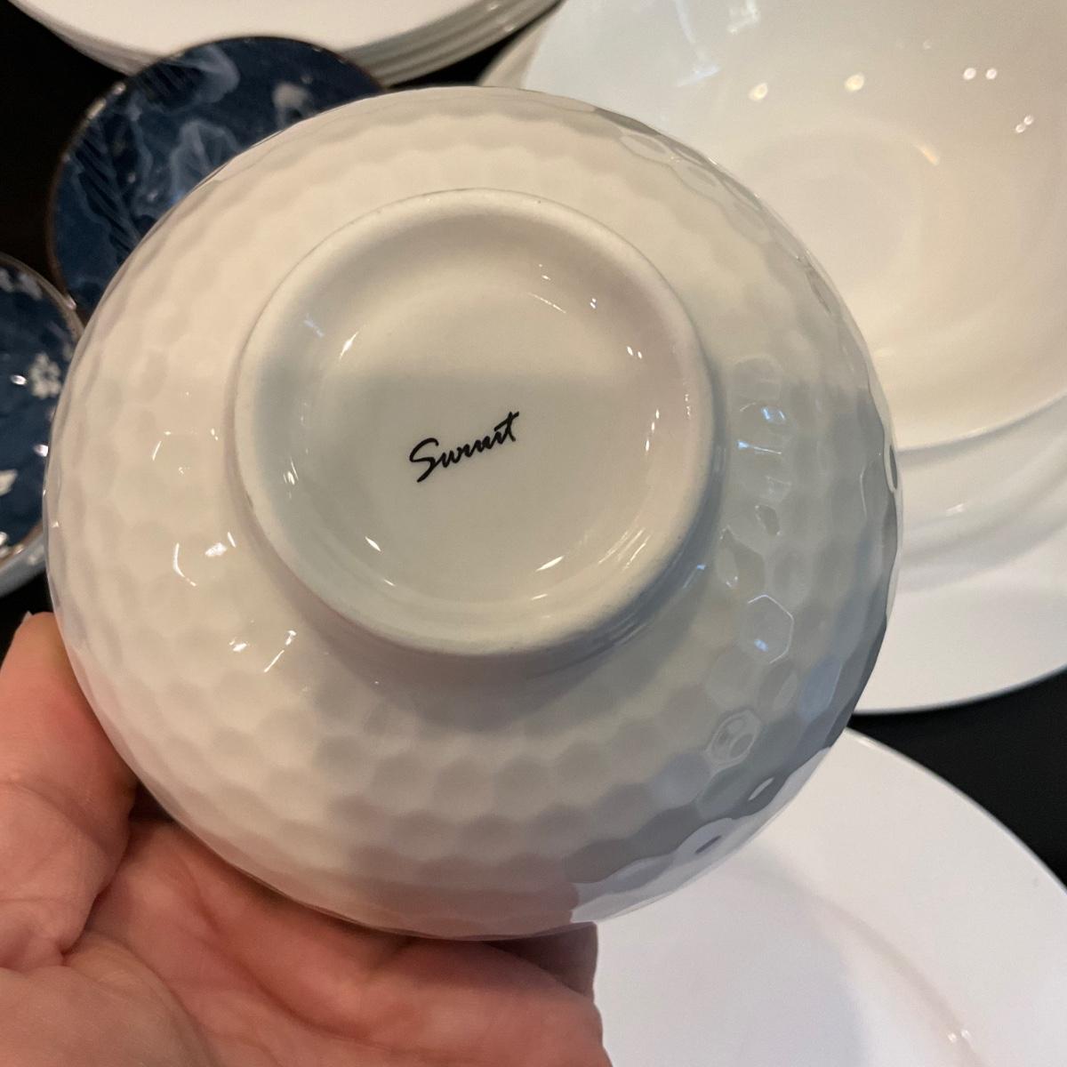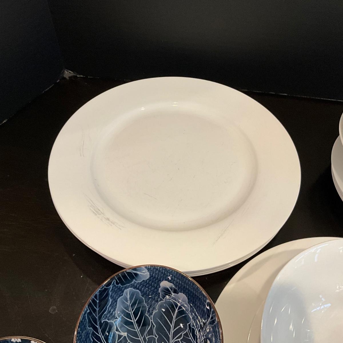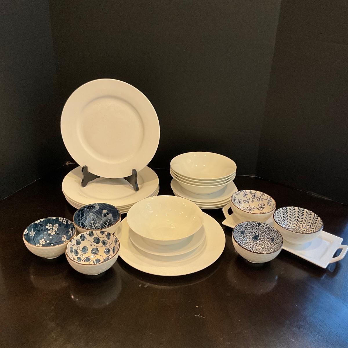 There are 7-dinner plates measuring 10.75" , 5 cereal bowls measuring 7" bowls, 6- salad plates measuring 7" , 6 blue and white decorative bowls with small white tray